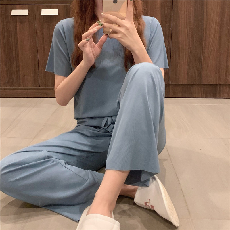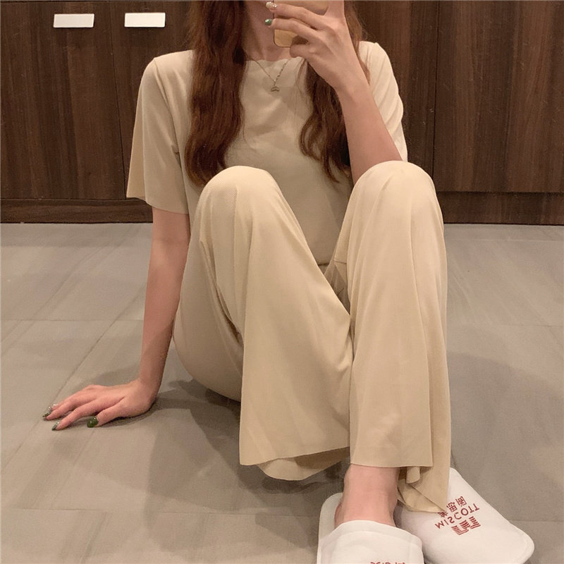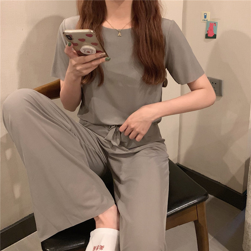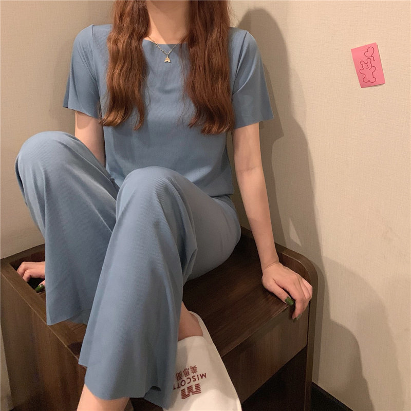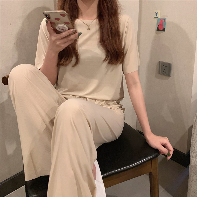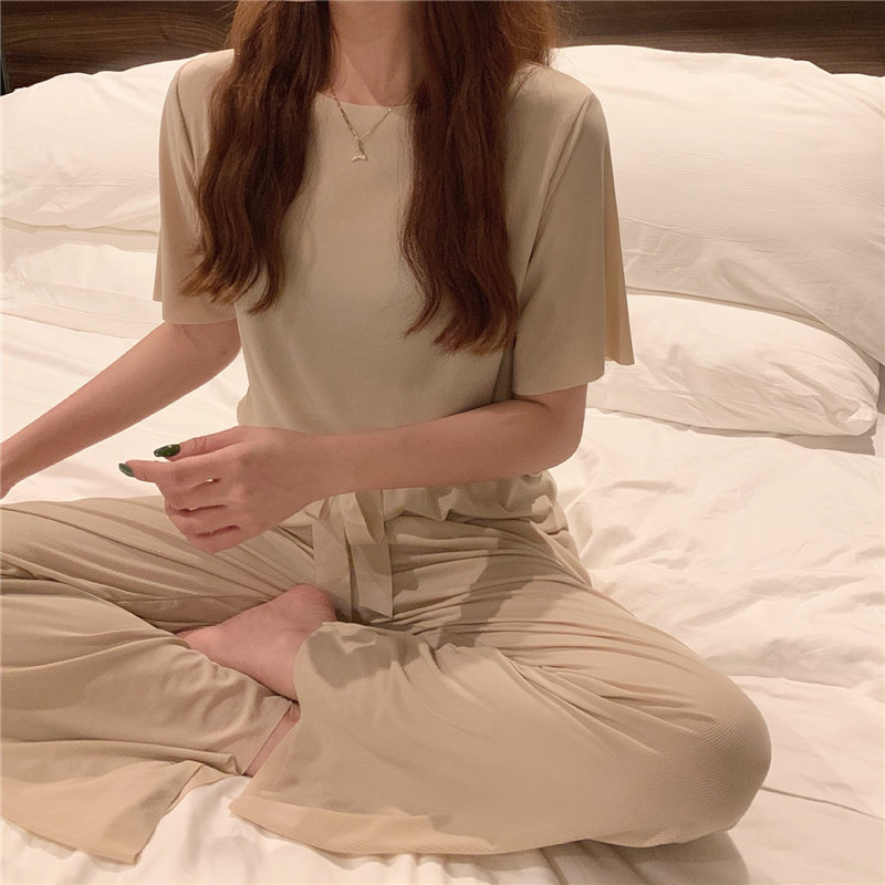 实拍实价~2021年新款冰丝纯色显瘦短袖阔腿裤家居休闲睡衣套装女