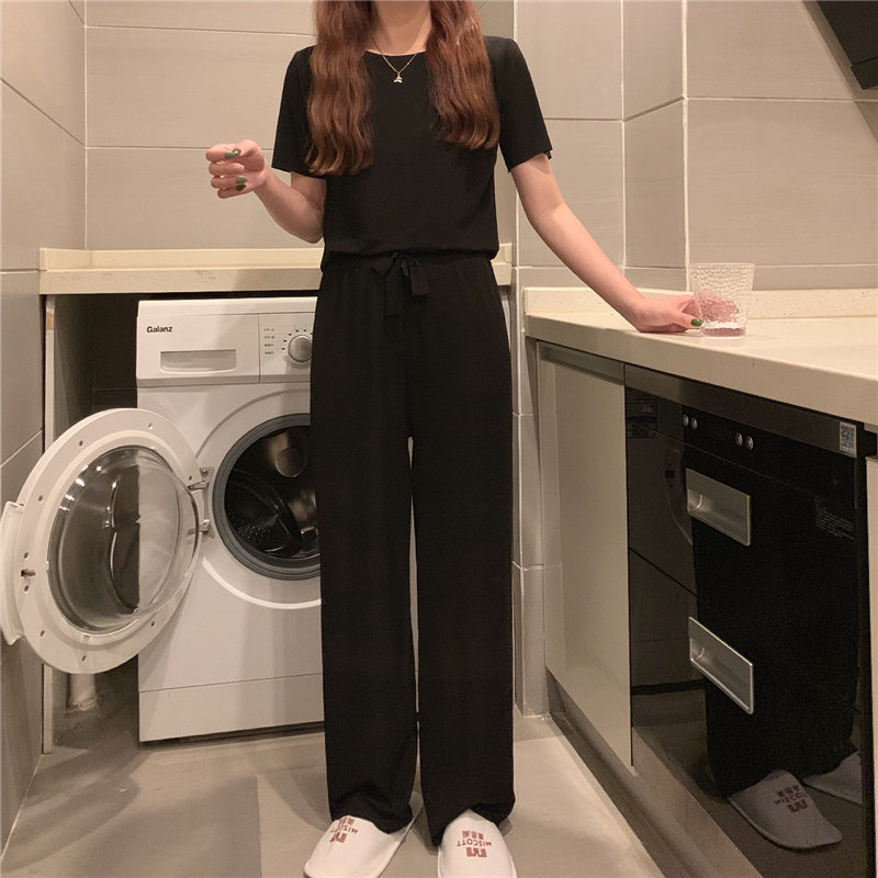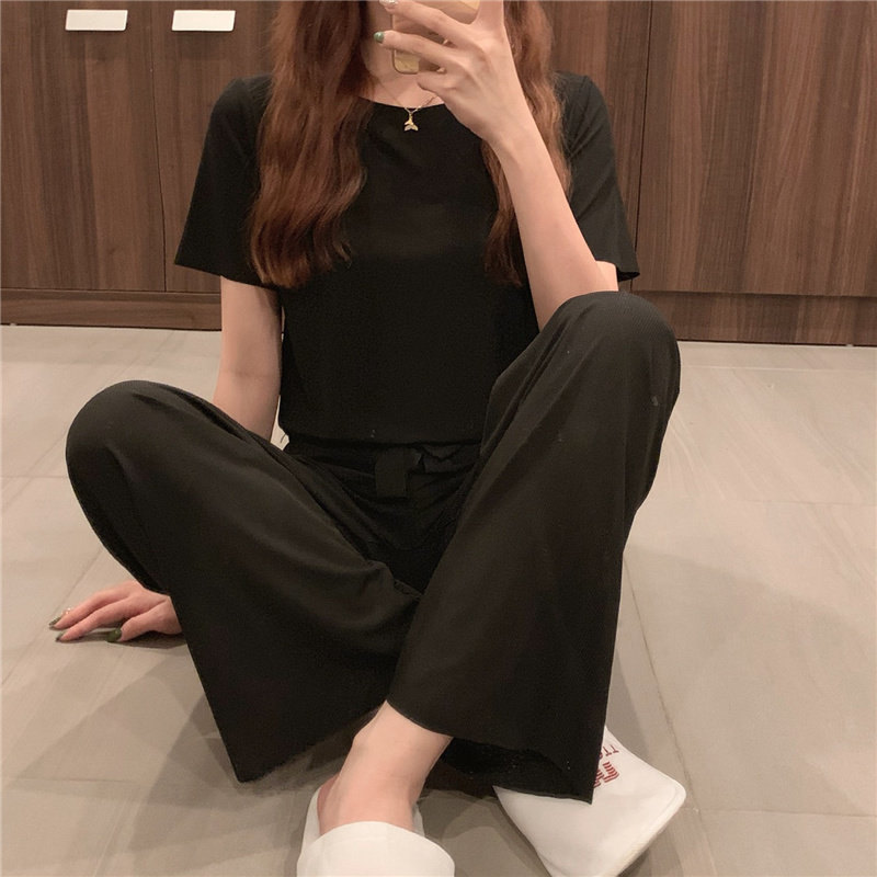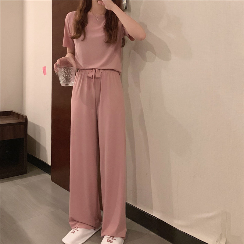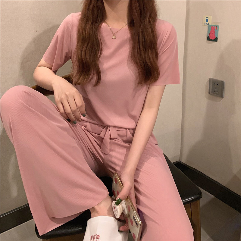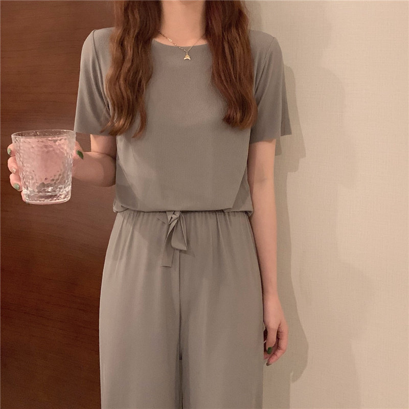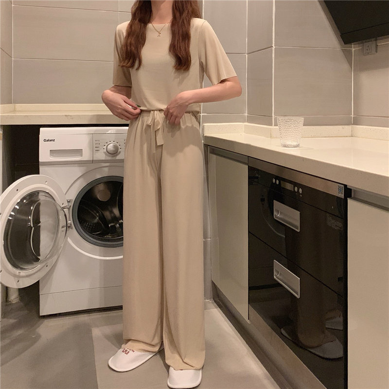实拍实价~2021年新款冰丝纯色显瘦短袖阔腿裤家居休闲睡衣套装女