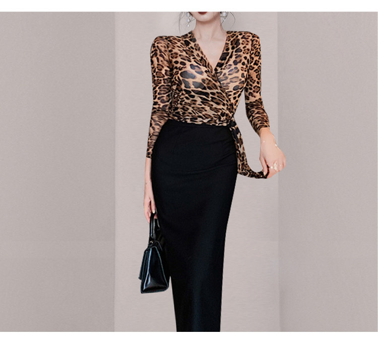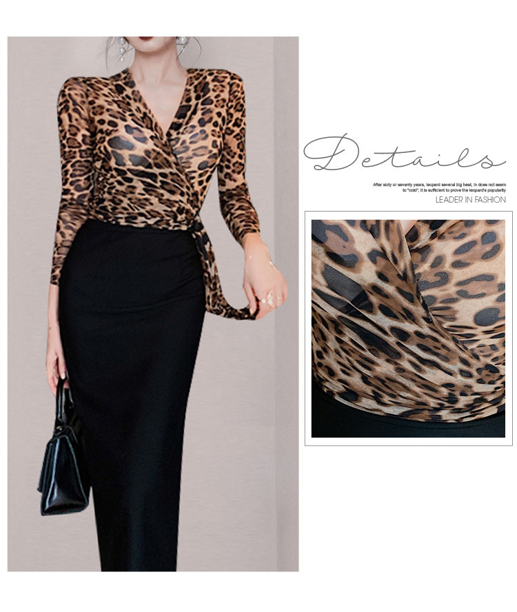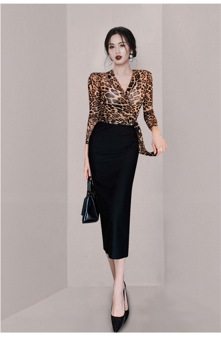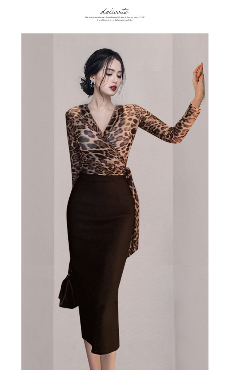 长袖时尚两件套V领豹纹女士修身气质性感套装内搭打底