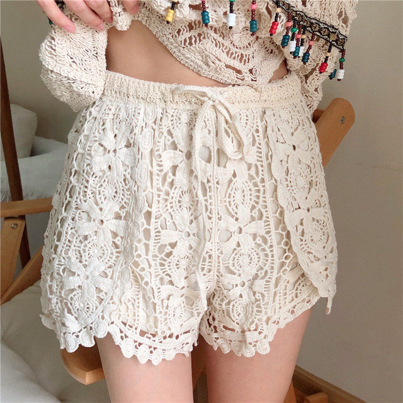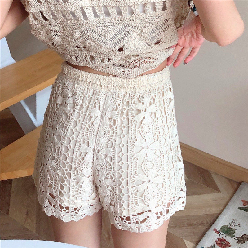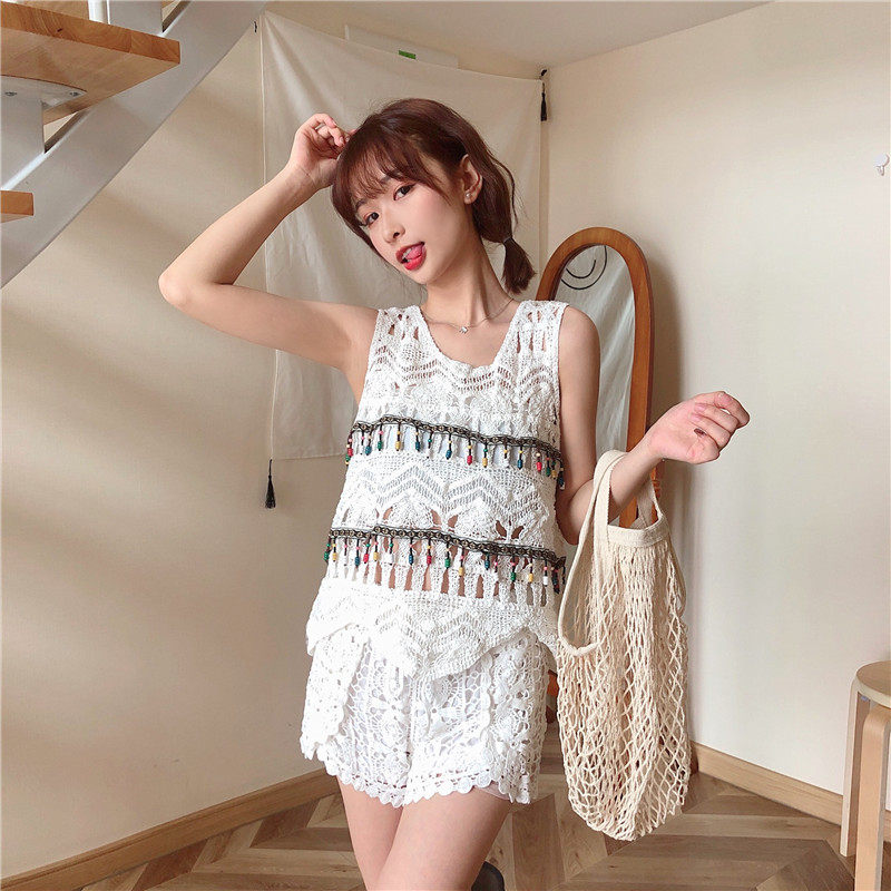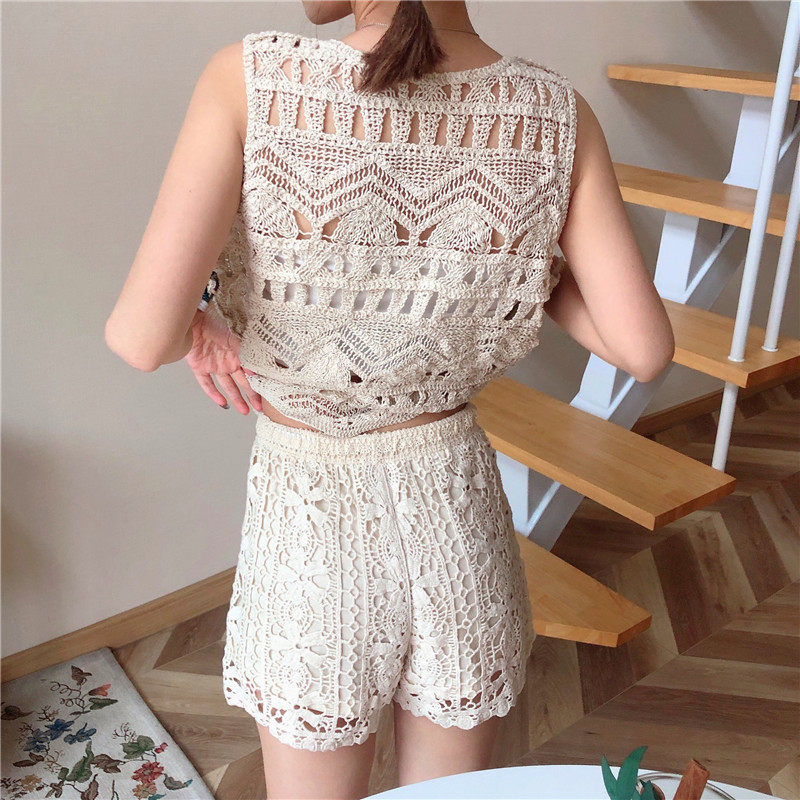 吊带背心外穿民族风镂空钩花罩衫无袖上衣宽松+高腰短裤套装