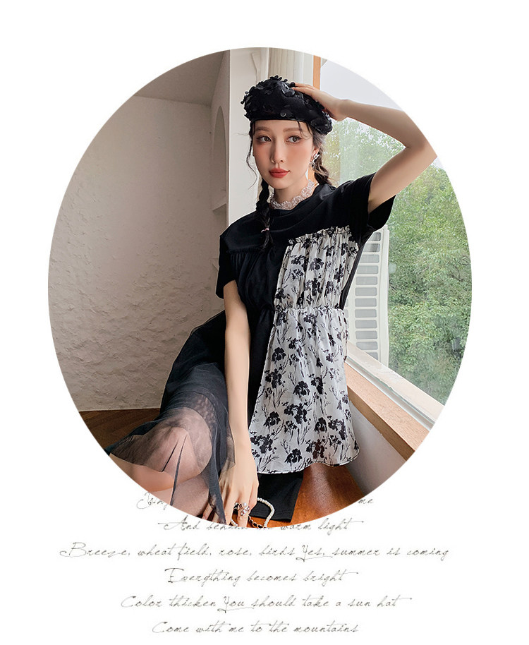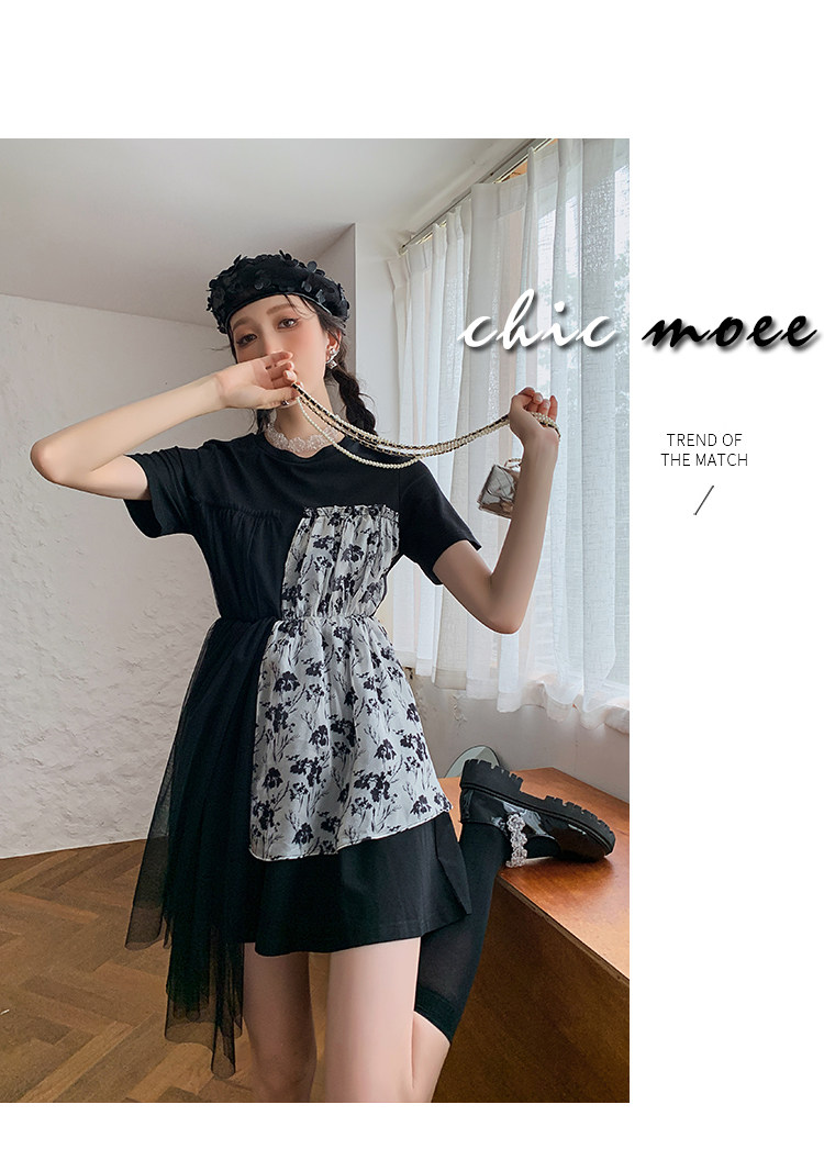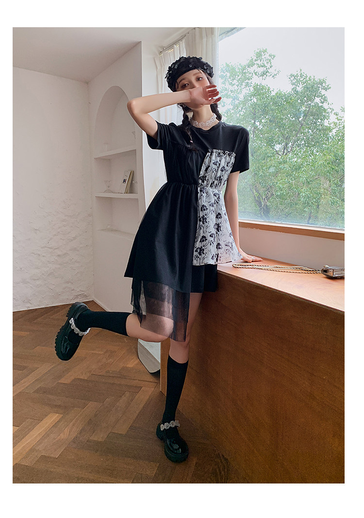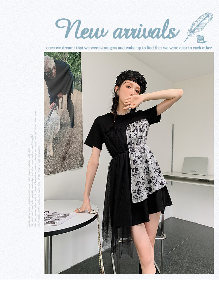 实拍 3136# 假两件连衣裙女夏季印花设计感短款不规则抹胸小黑裙