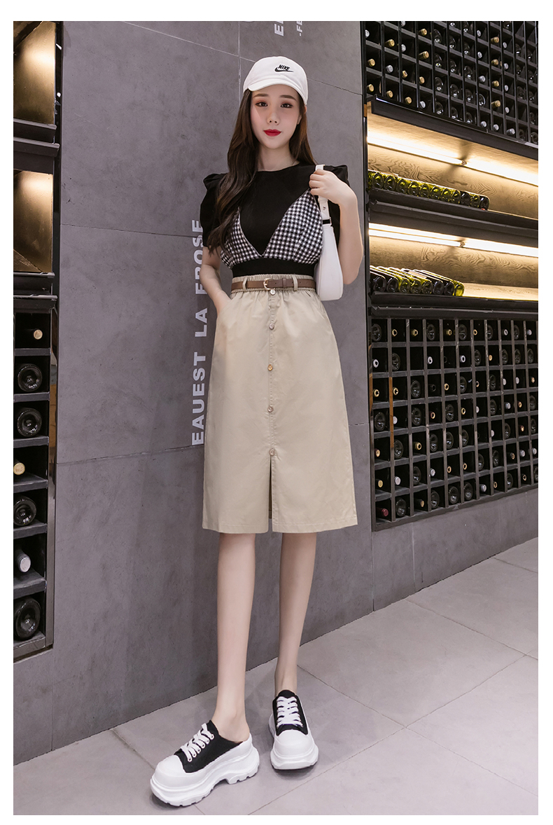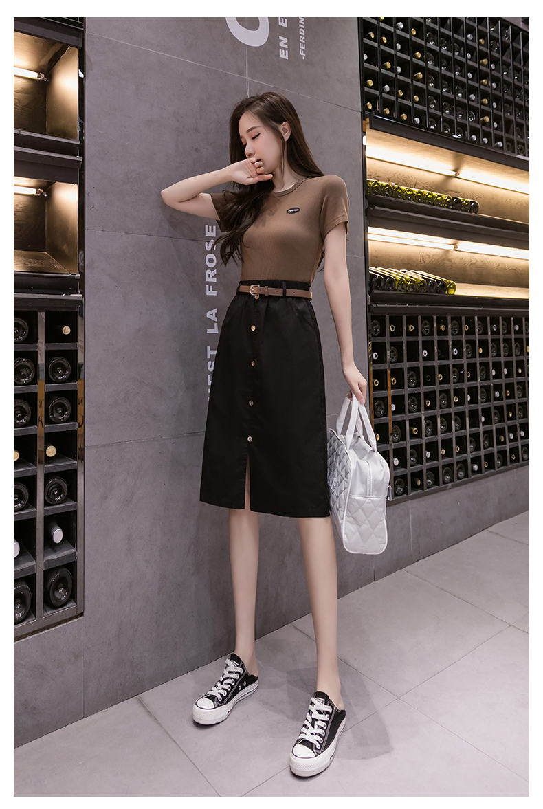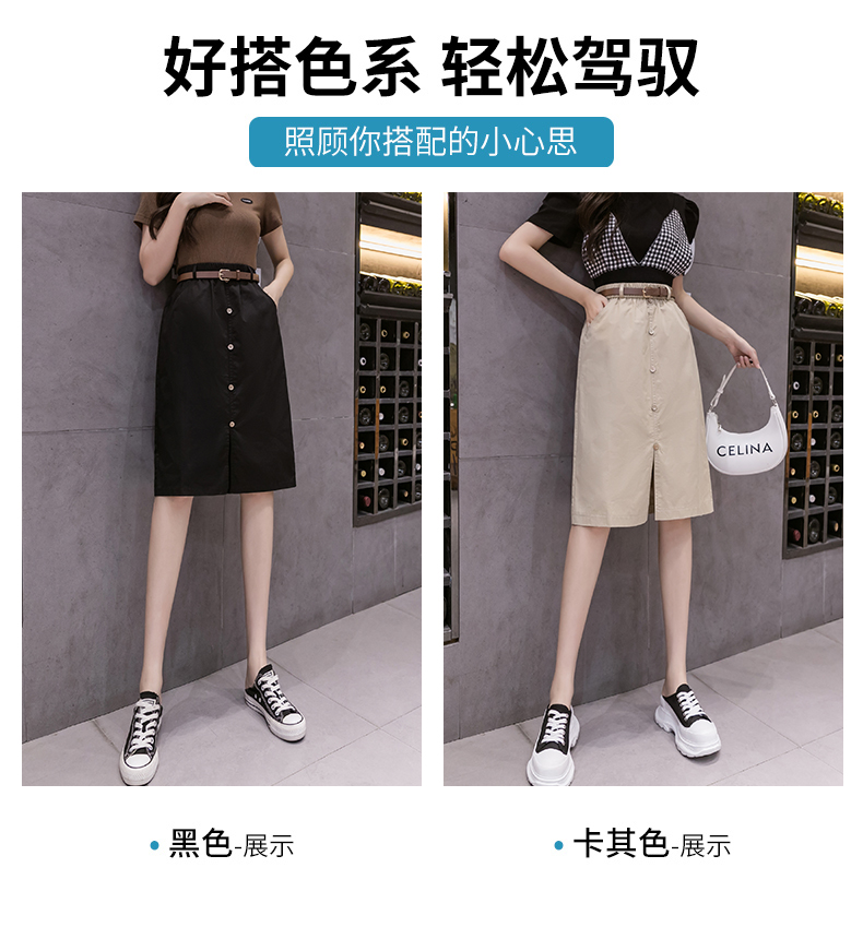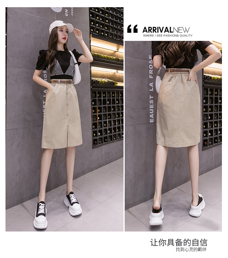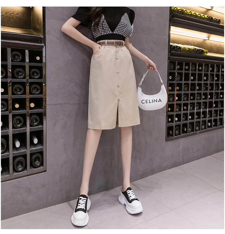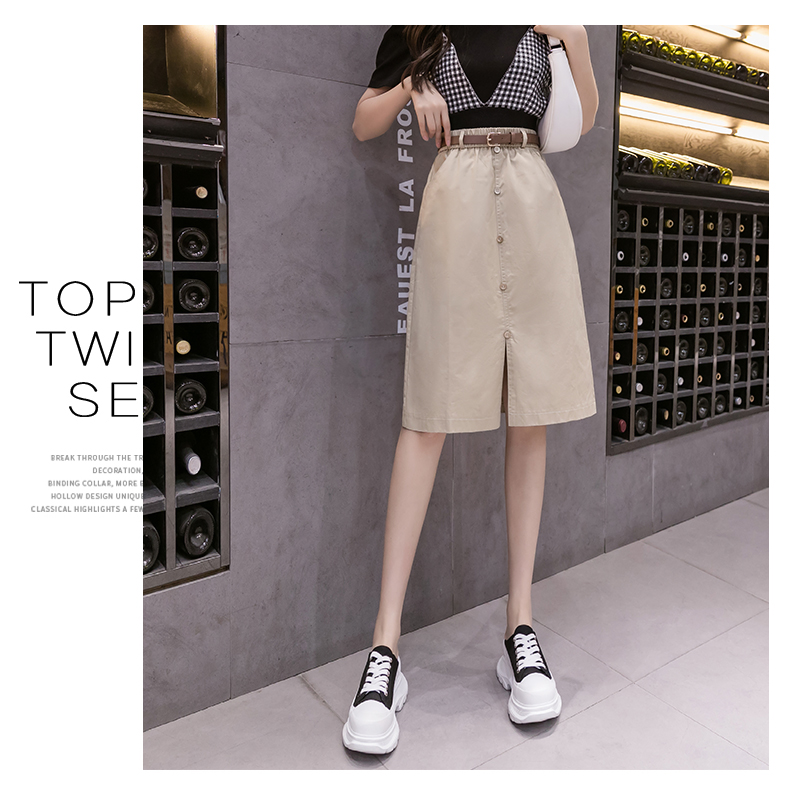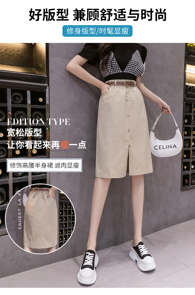 松紧腰中长款半身裙女高腰夏季韩版宽松开叉直筒显瘦过膝一步长裙