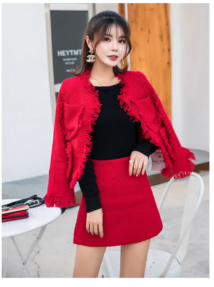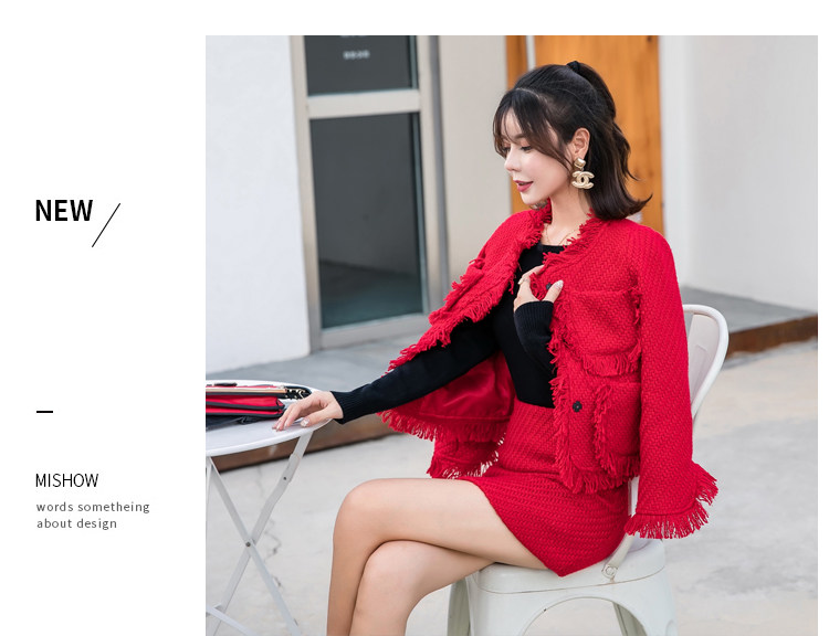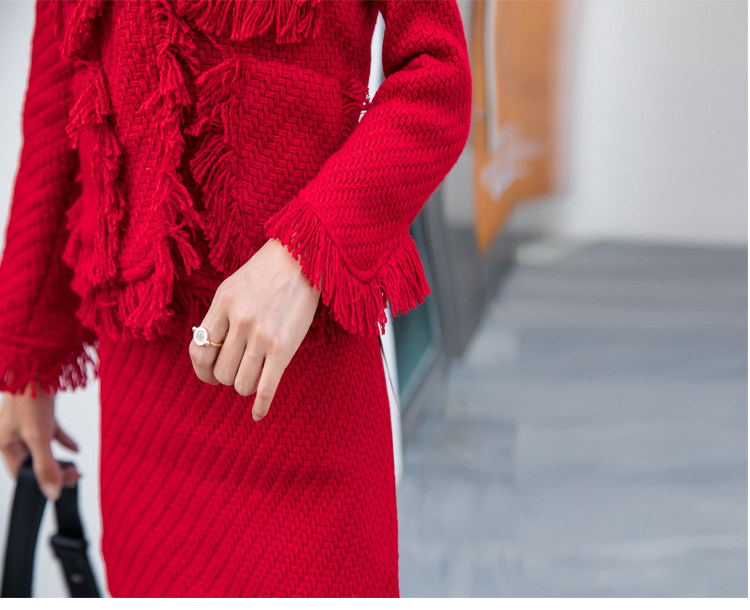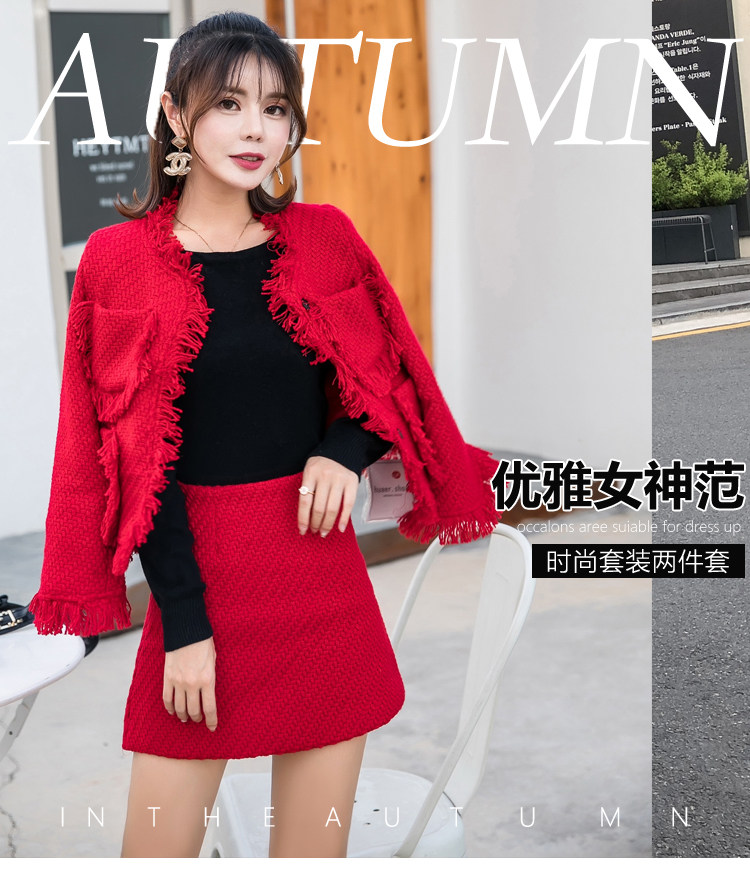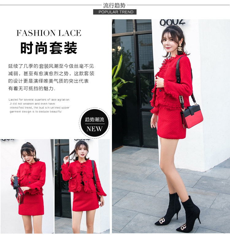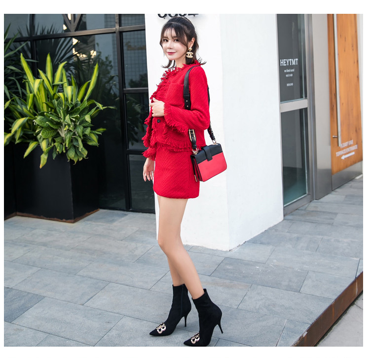 实拍优雅红色手撕毛边小香风套装粗花呢外套包臀半裙名媛风两件套
