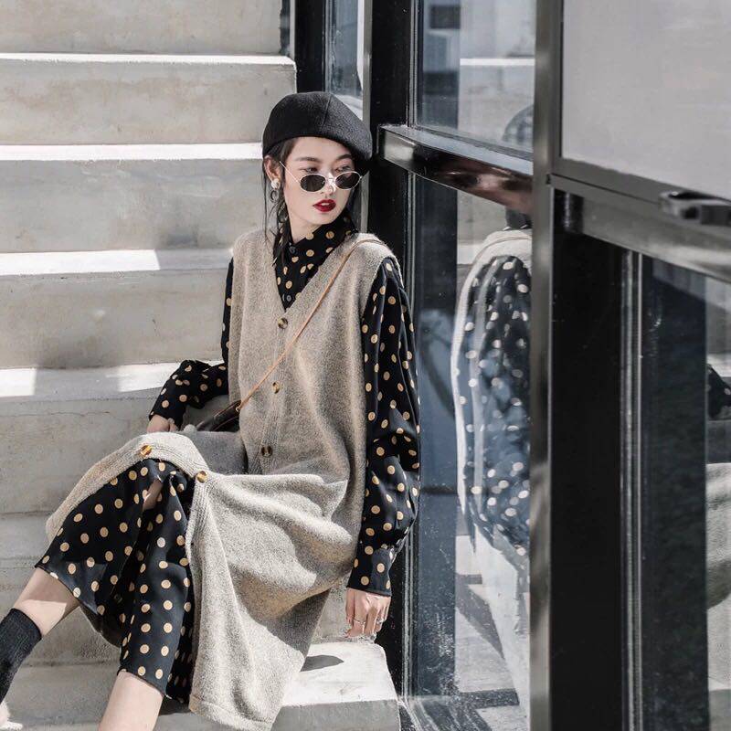 颜色:卡其马甲 圆点衬衫 雪花点衬衫