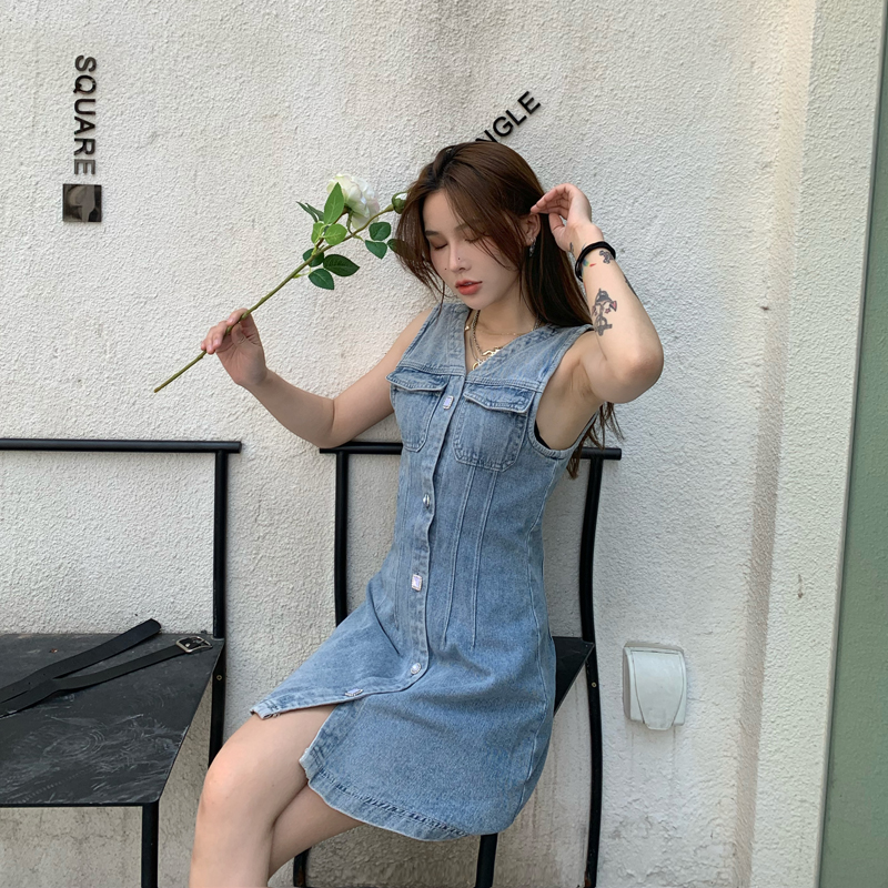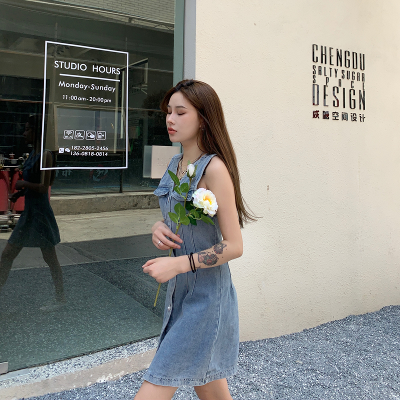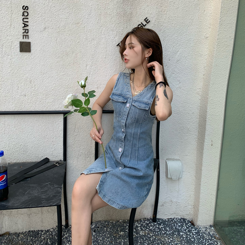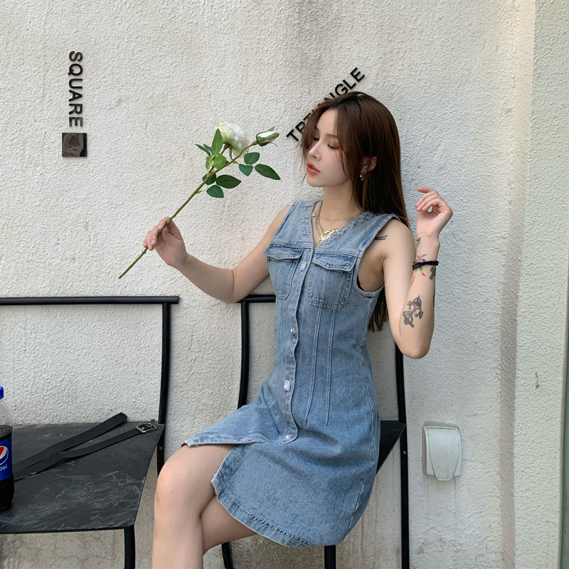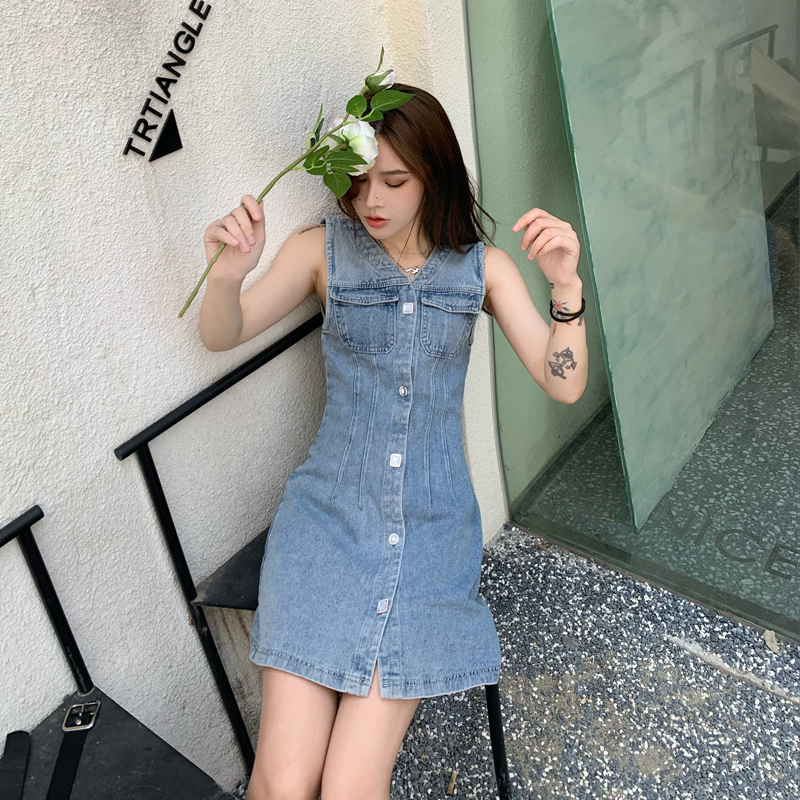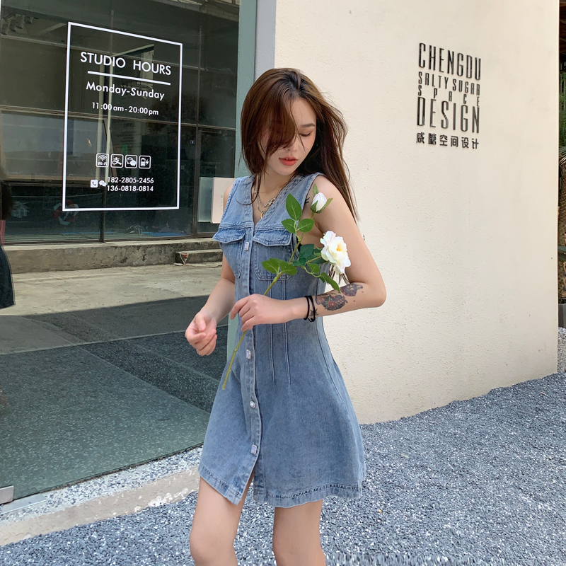 实拍无袖牛仔连衣裙女春秋韩版收腰显瘦春装2020款v领气质裙子潮