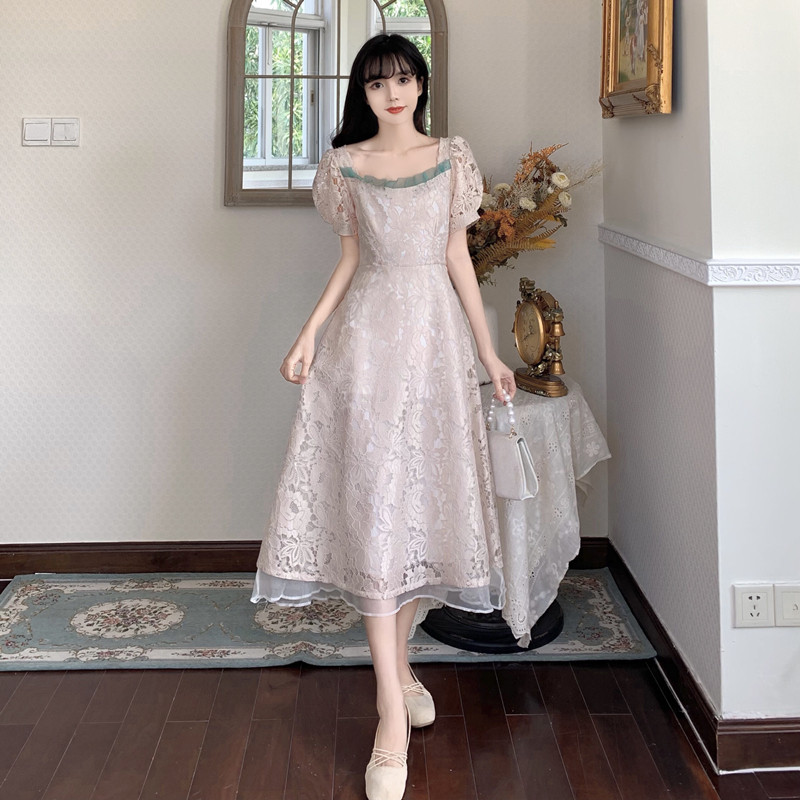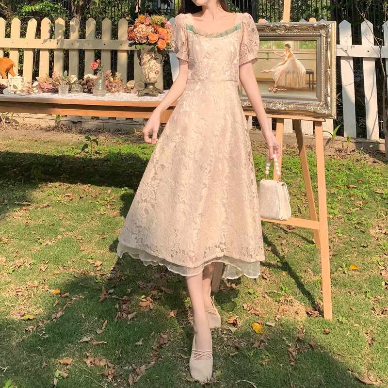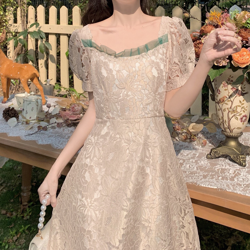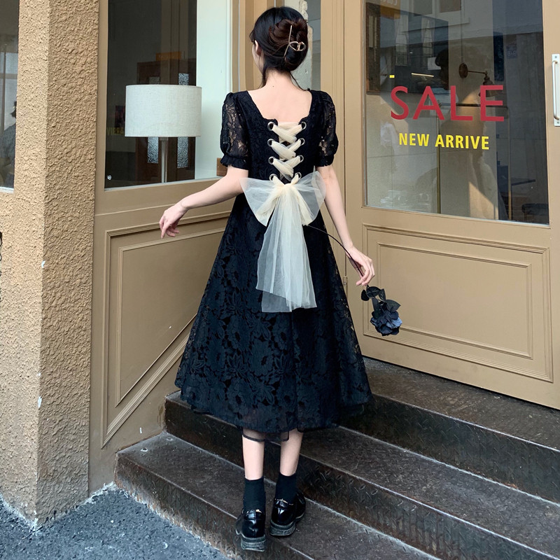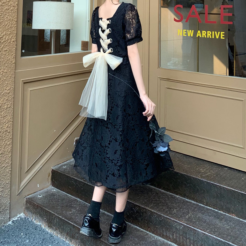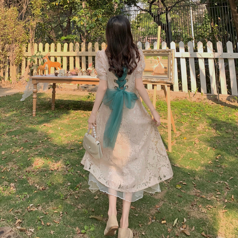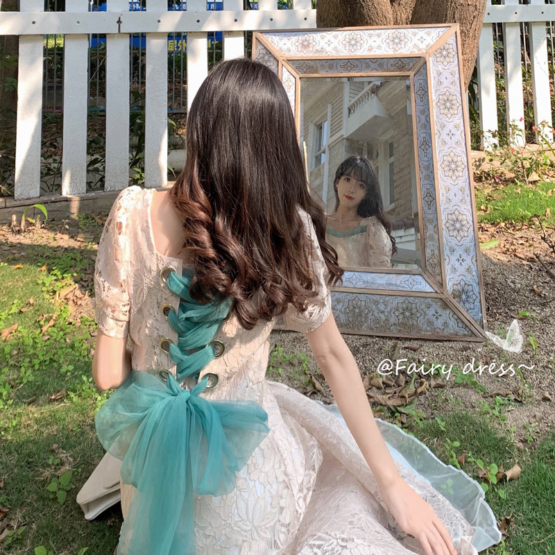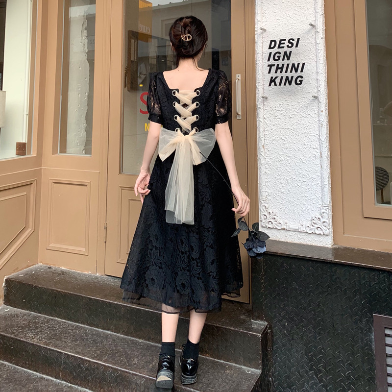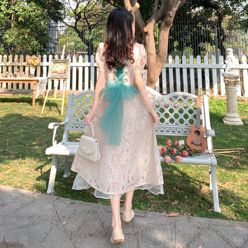 国大B区314~法式复古蕾丝蝴蝶结绑带连衣裙