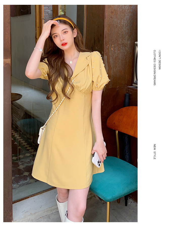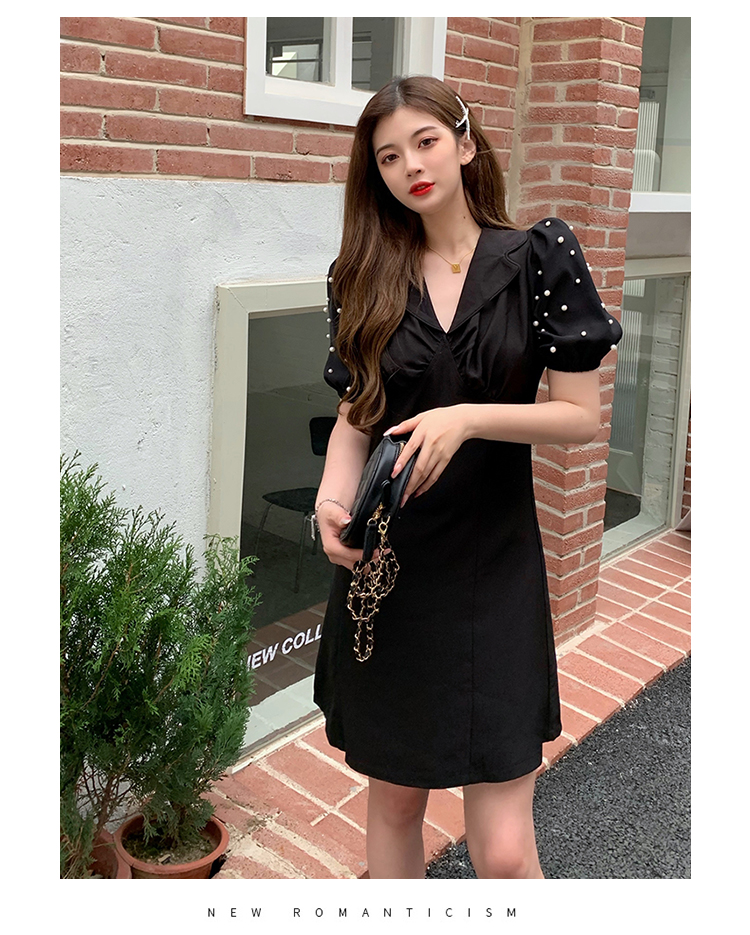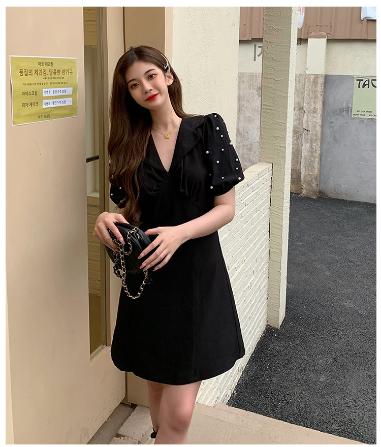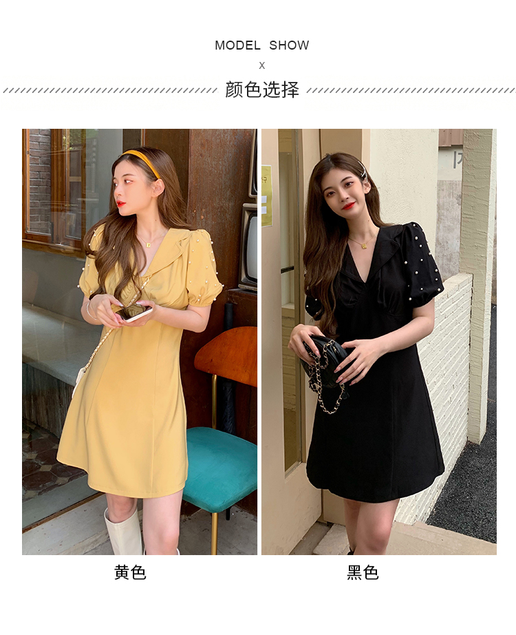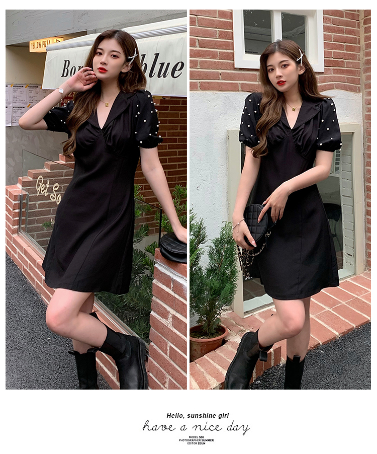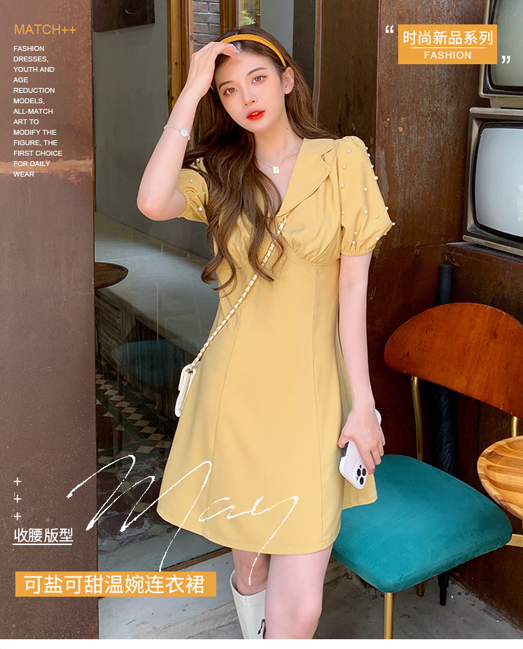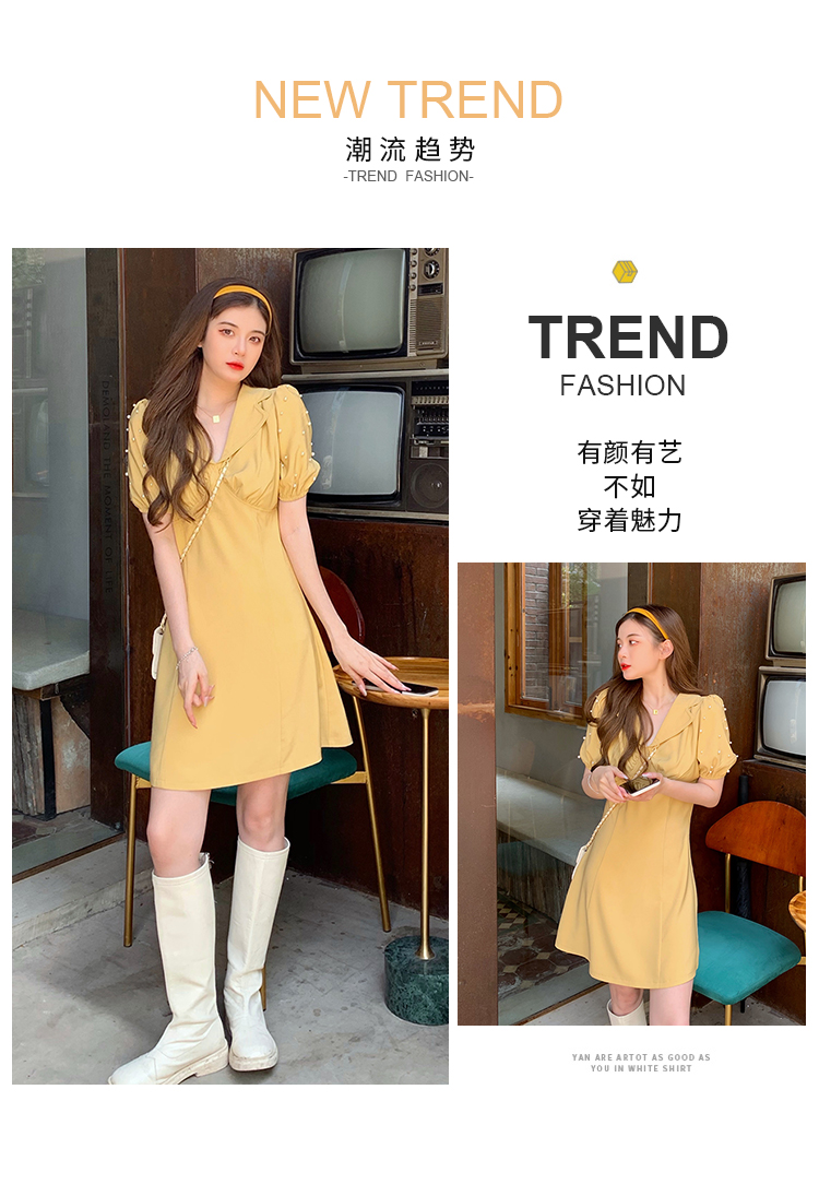 8276#实拍新款2021夏装加大码女装法式大V领收腰珍珠泡泡袖连衣裙