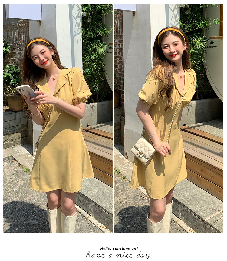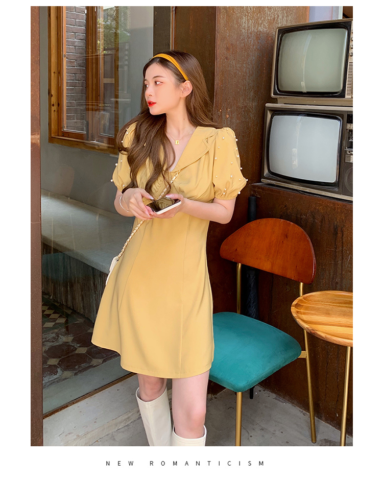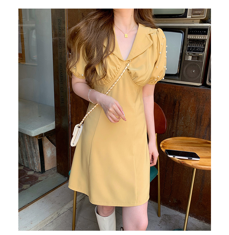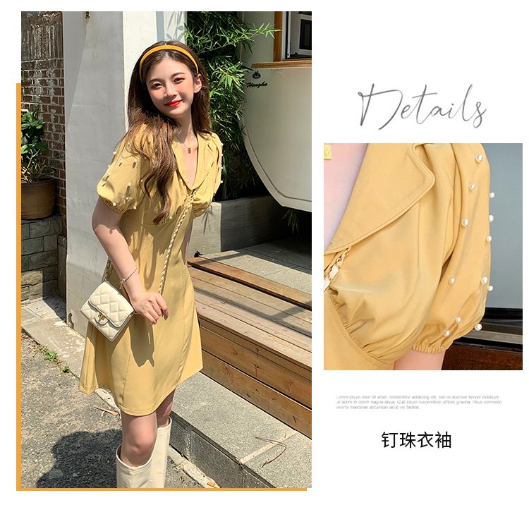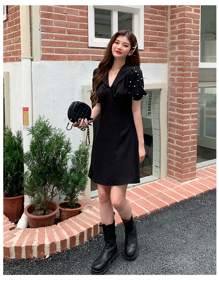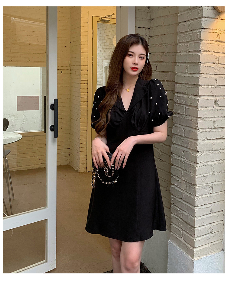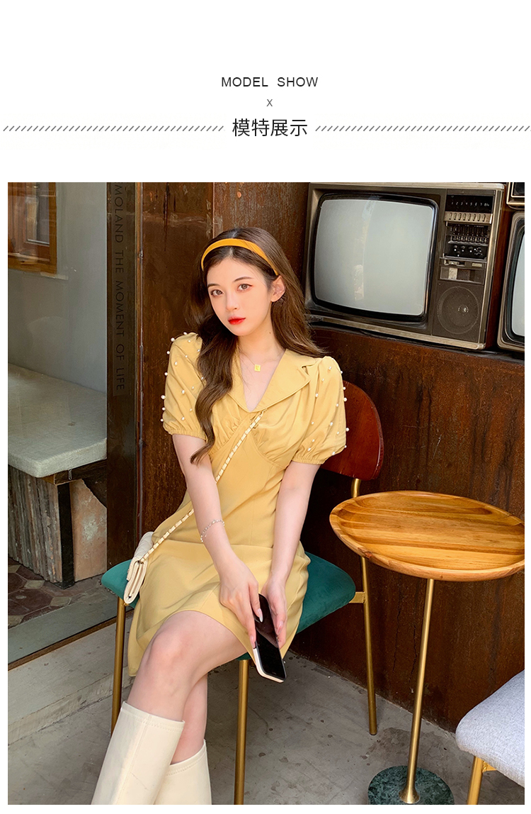 8276#实拍新款2021夏装加大码女装法式大V领收腰珍珠泡泡袖连衣裙