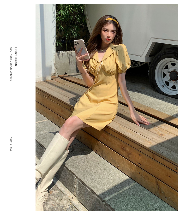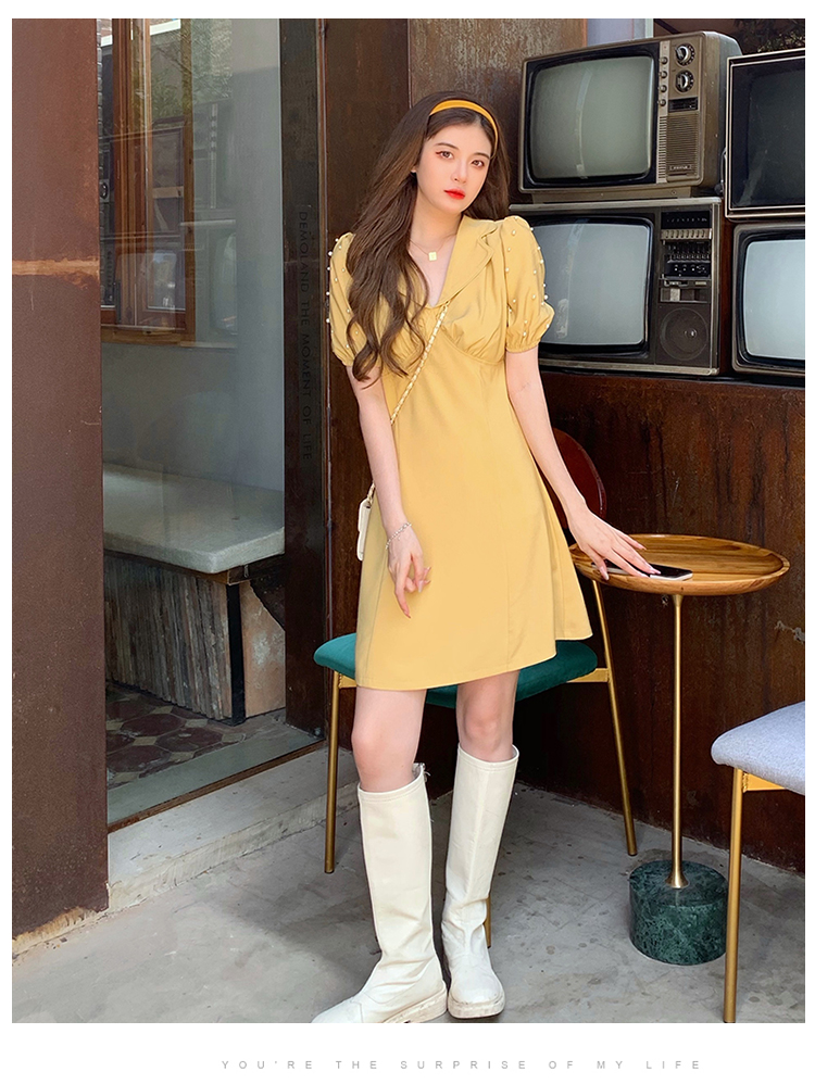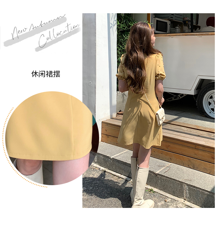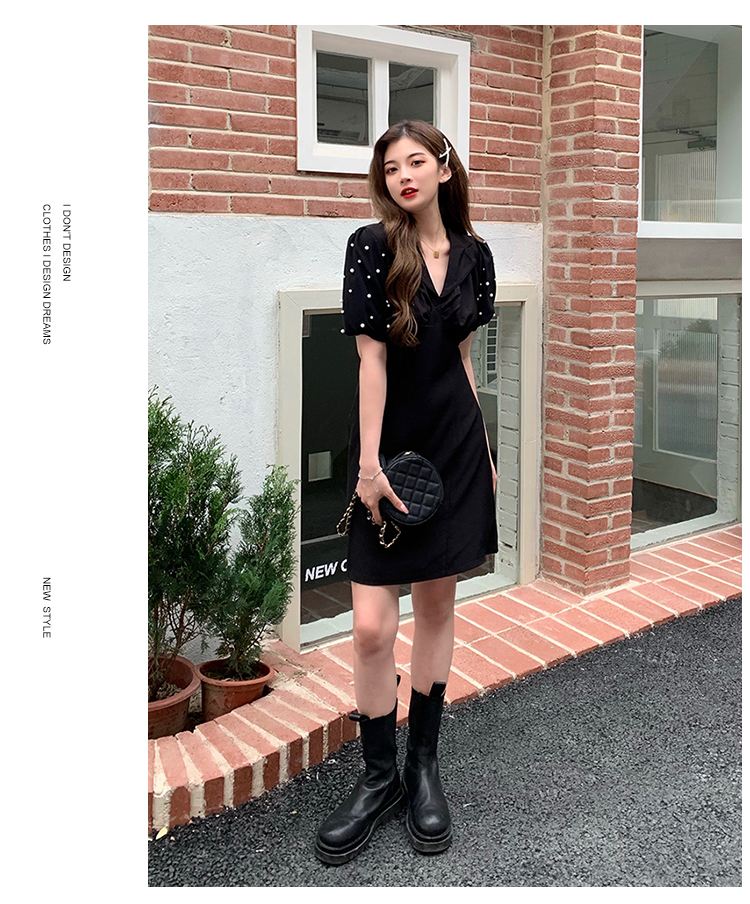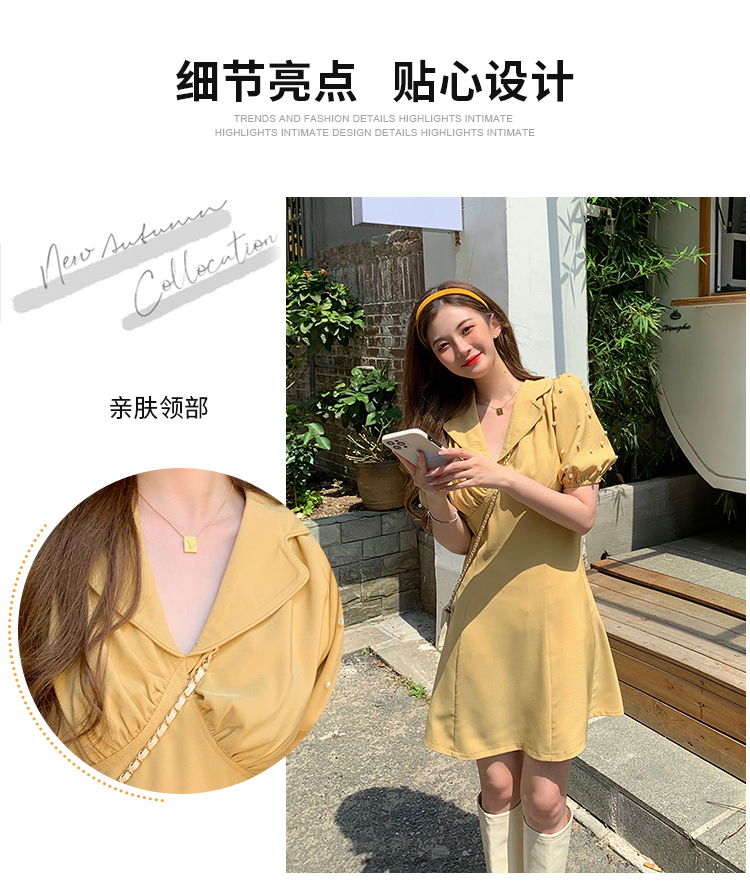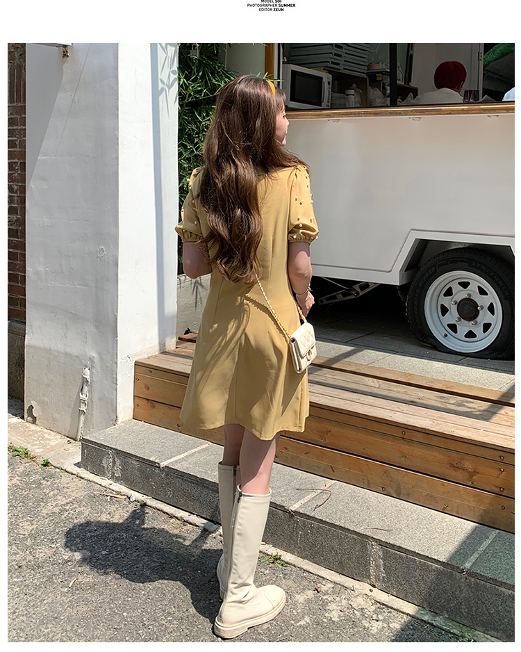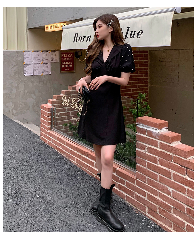 8276#实拍新款2021夏装加大码女装法式大V领收腰珍珠泡泡袖连衣裙