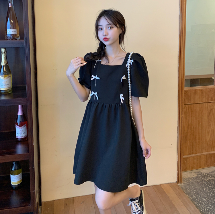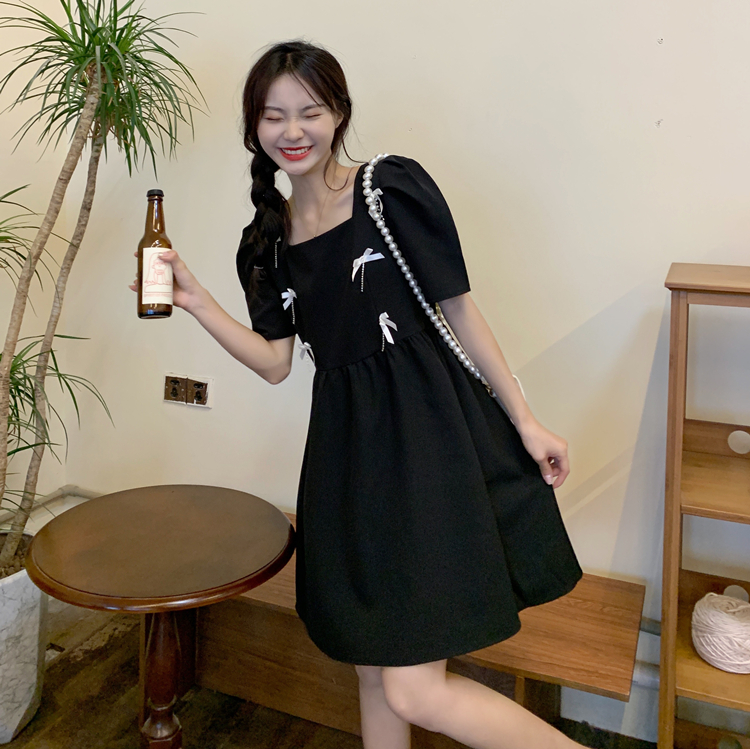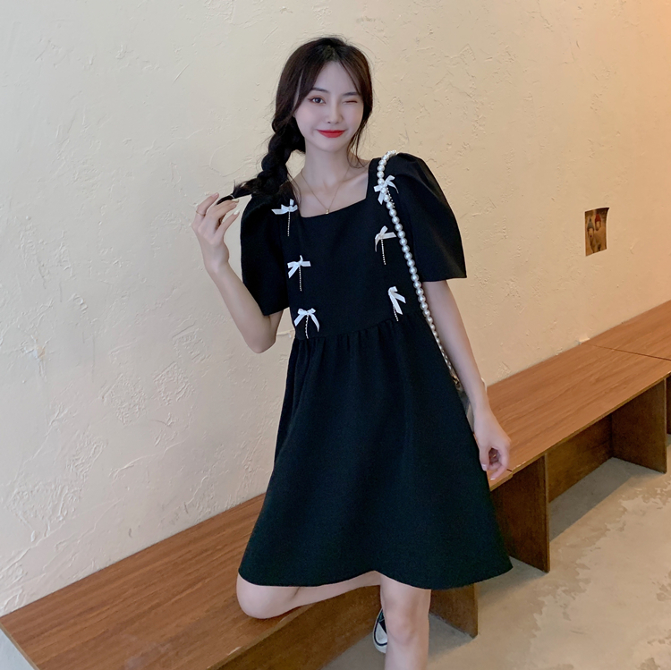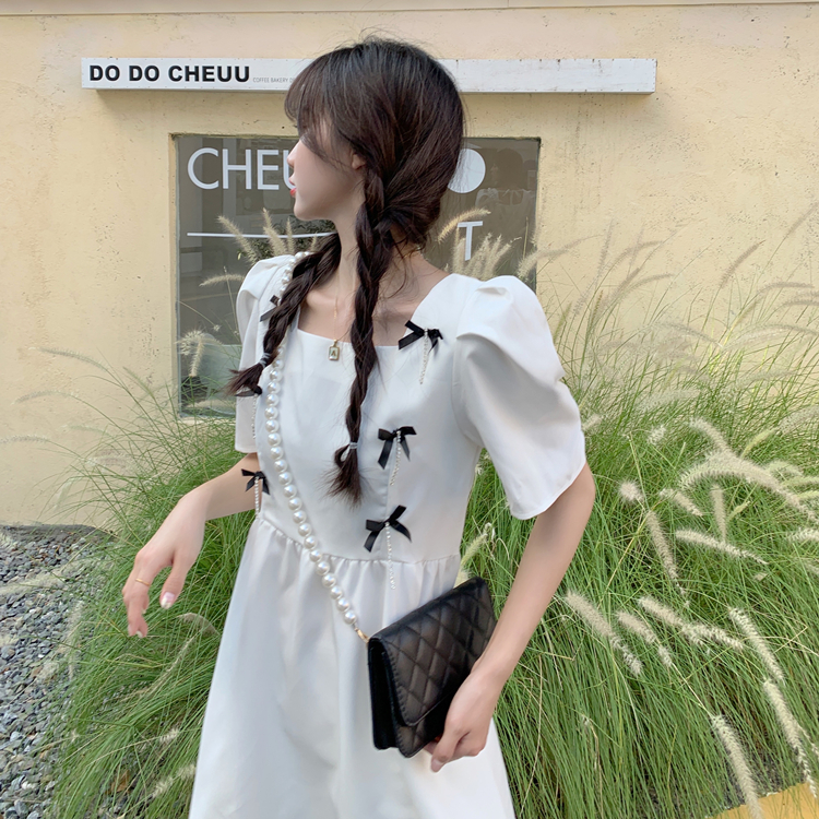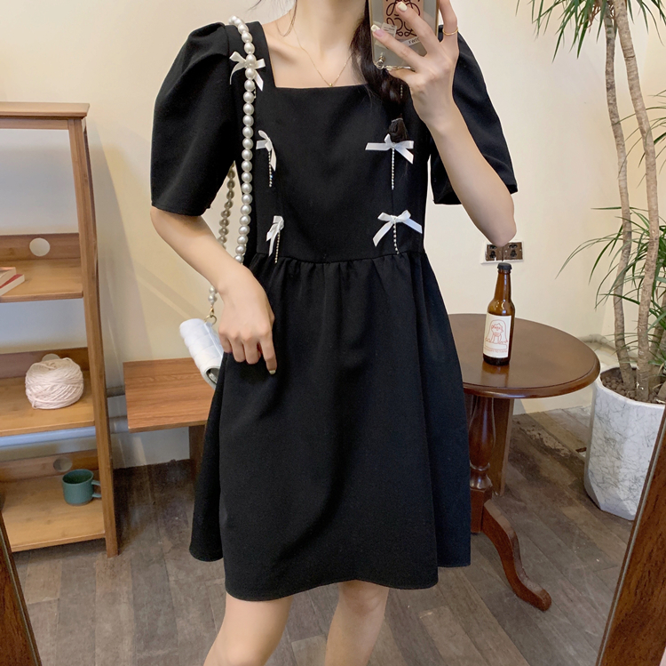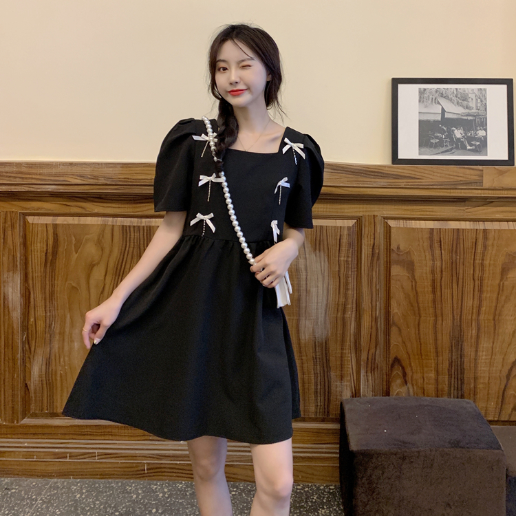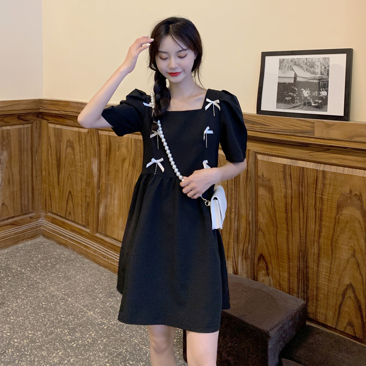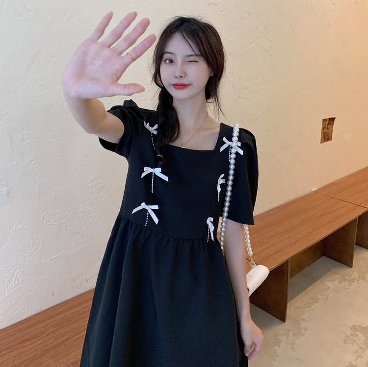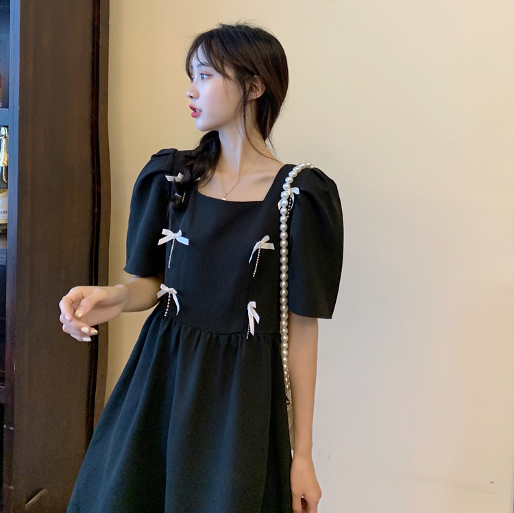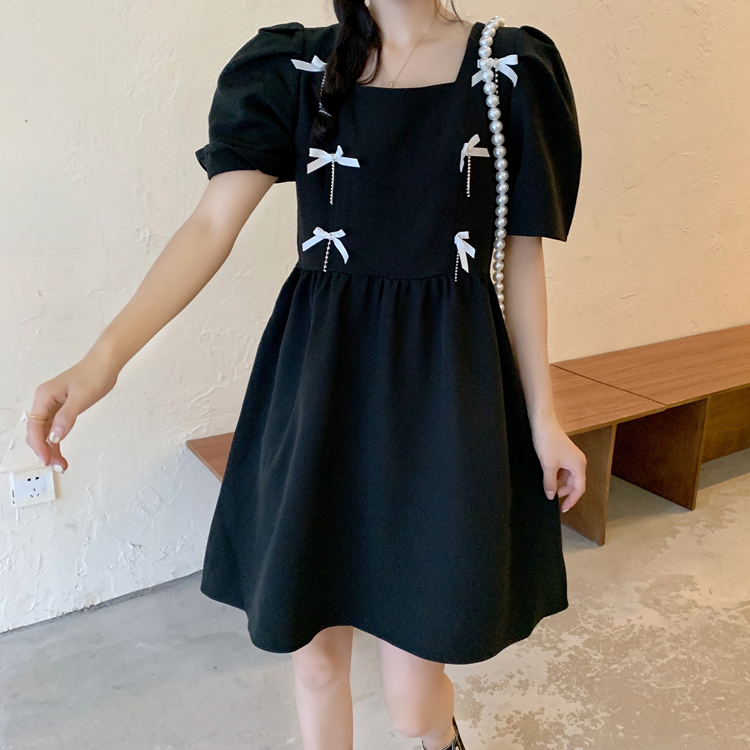 实拍~大码女装法式复古洋气钻石链条蝴蝶结气质显瘦方领连衣裙女