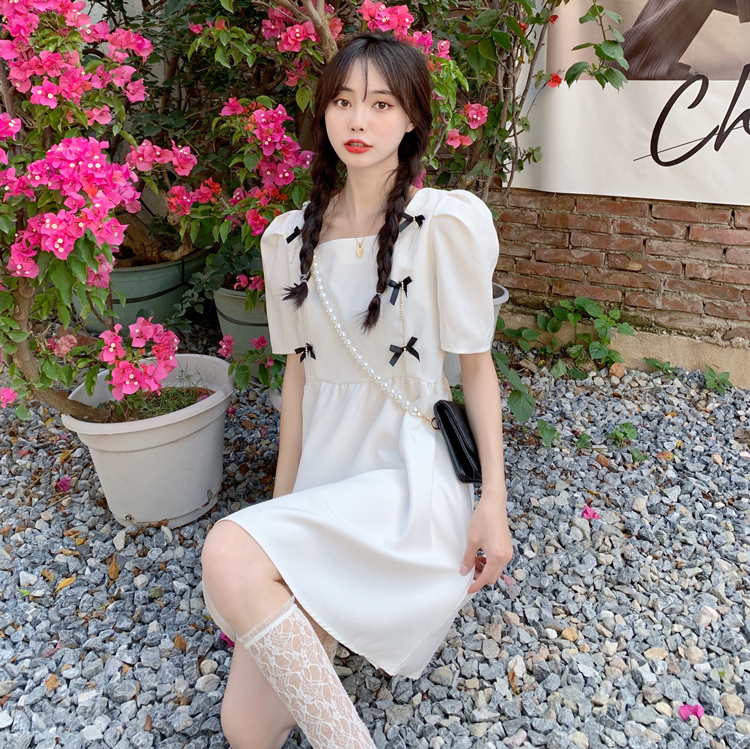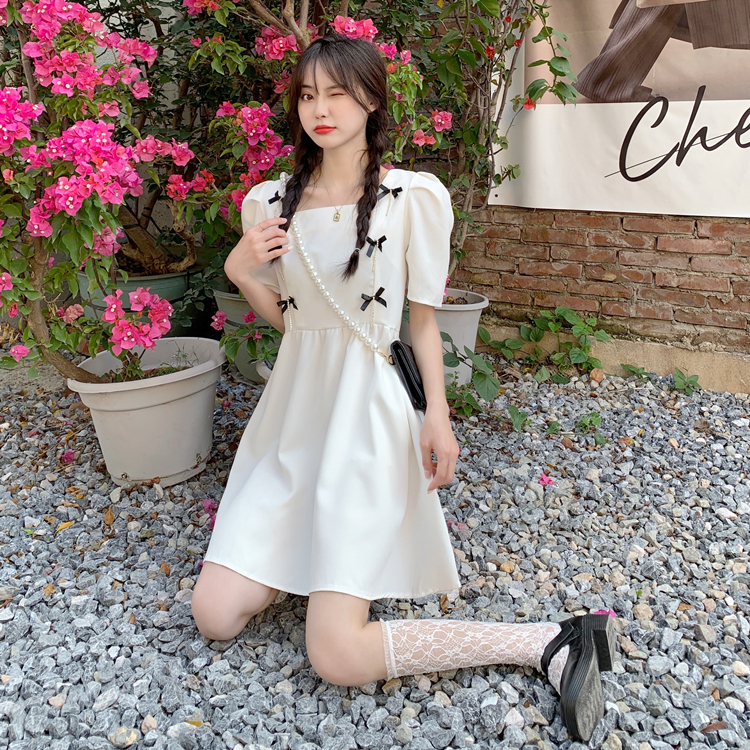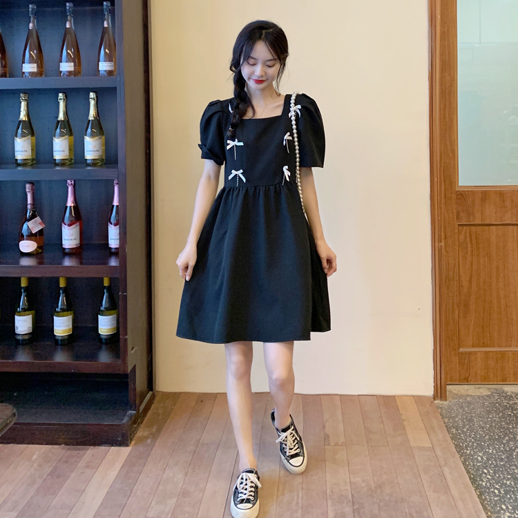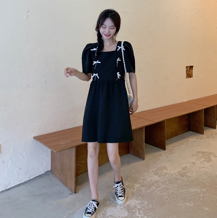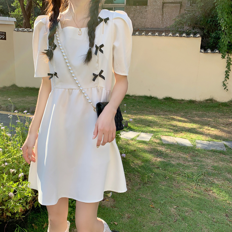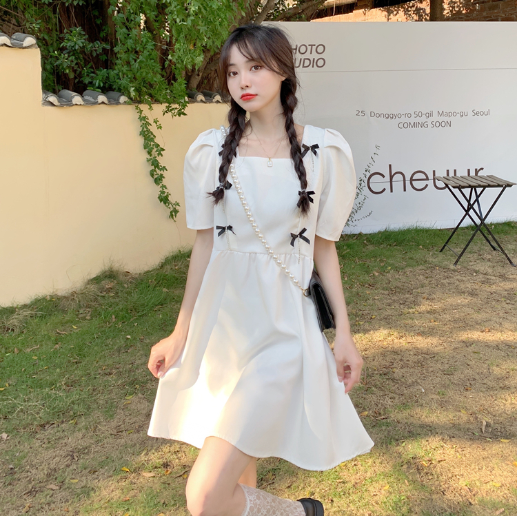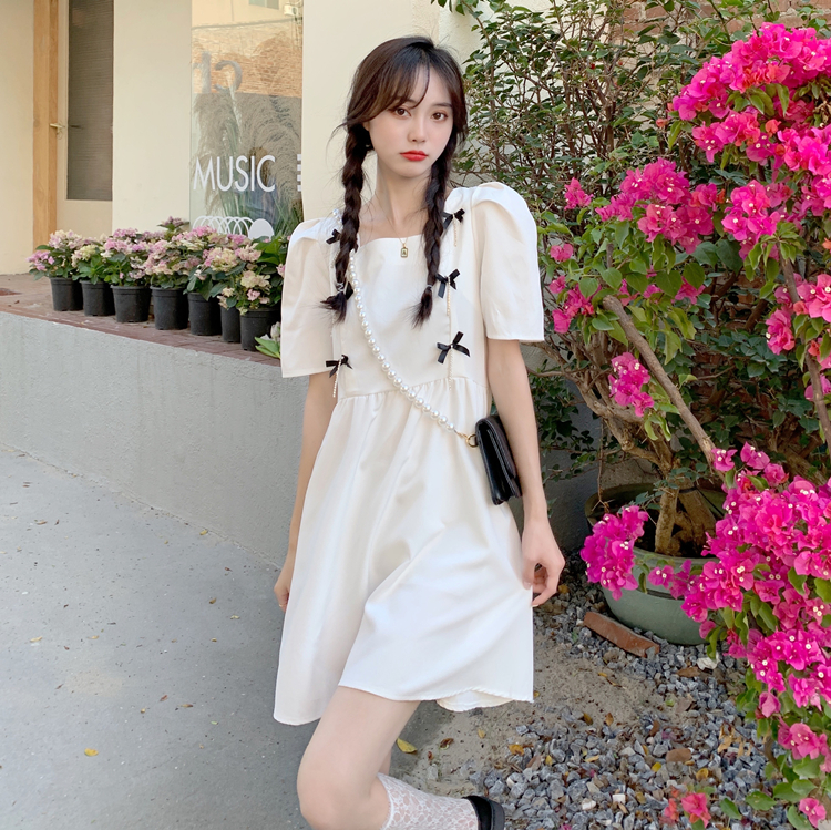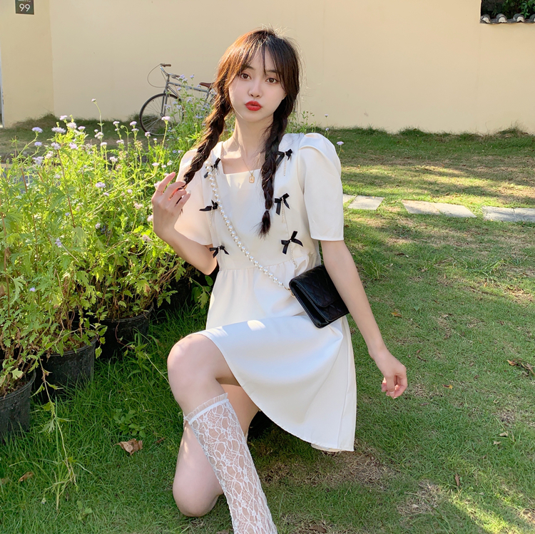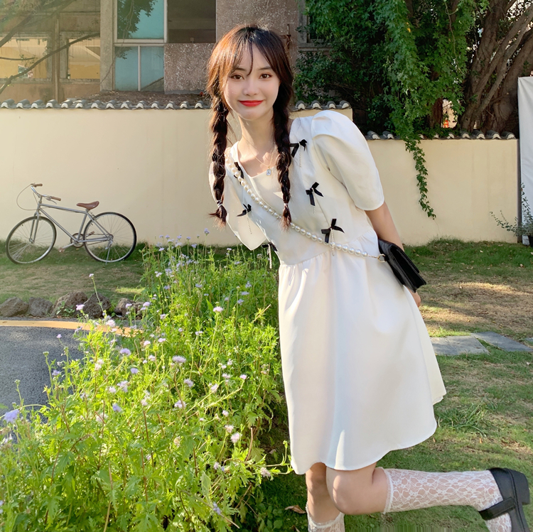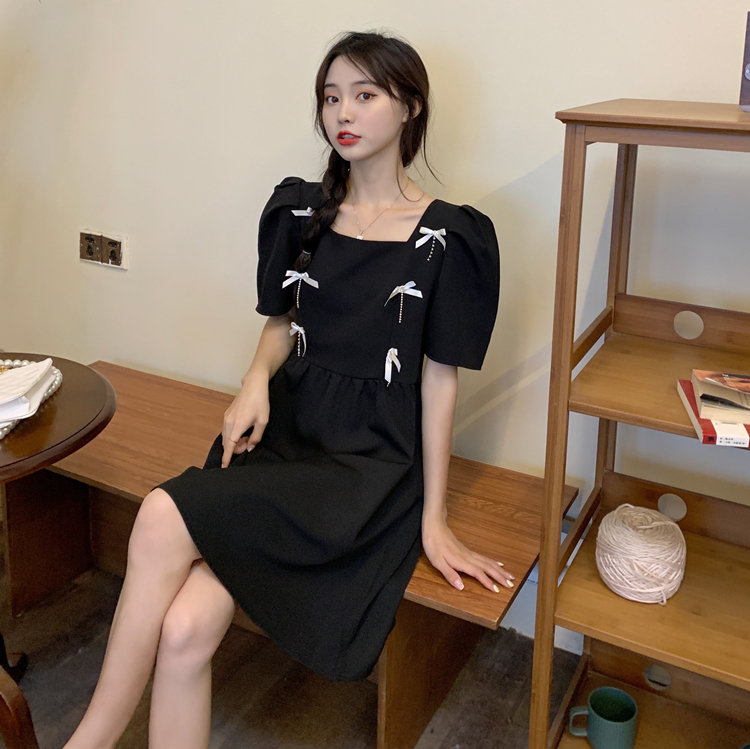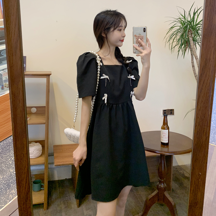 实拍~大码女装法式复古洋气钻石链条蝴蝶结气质显瘦方领连衣裙女