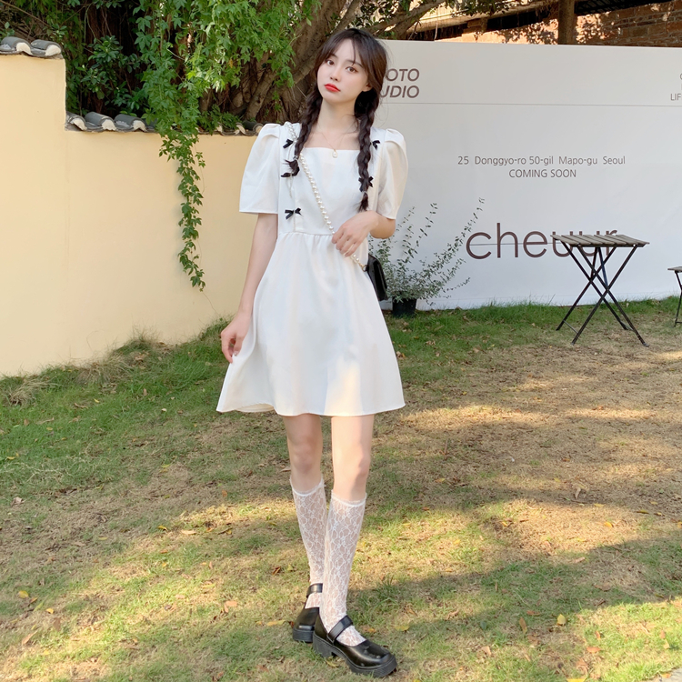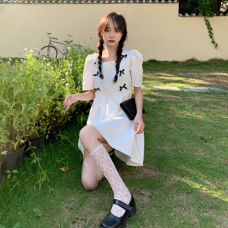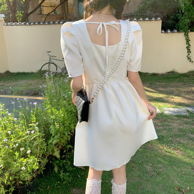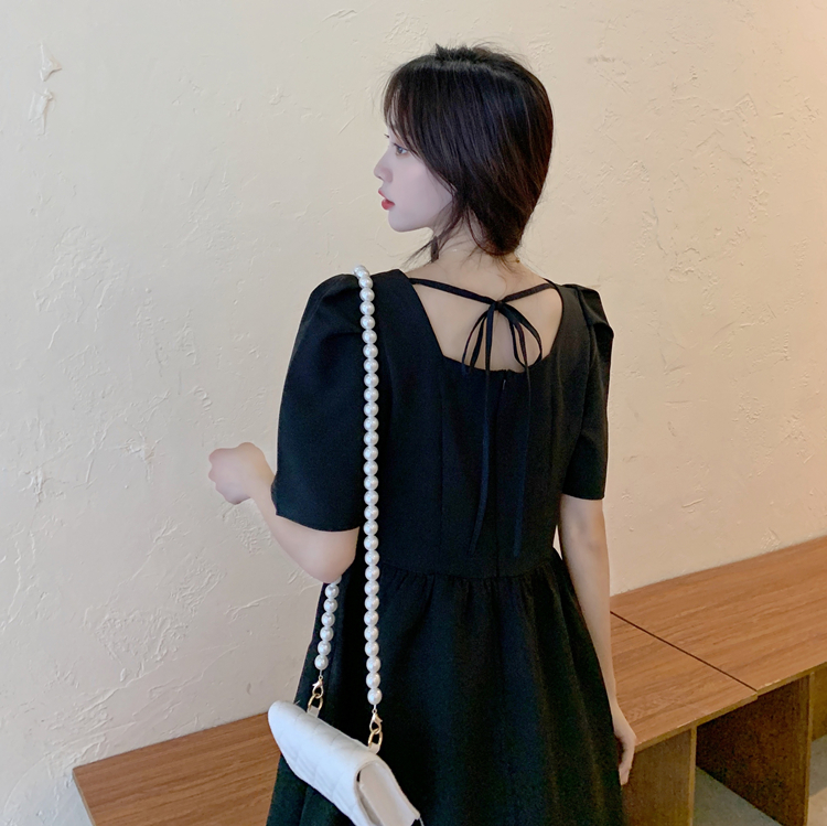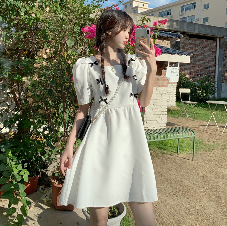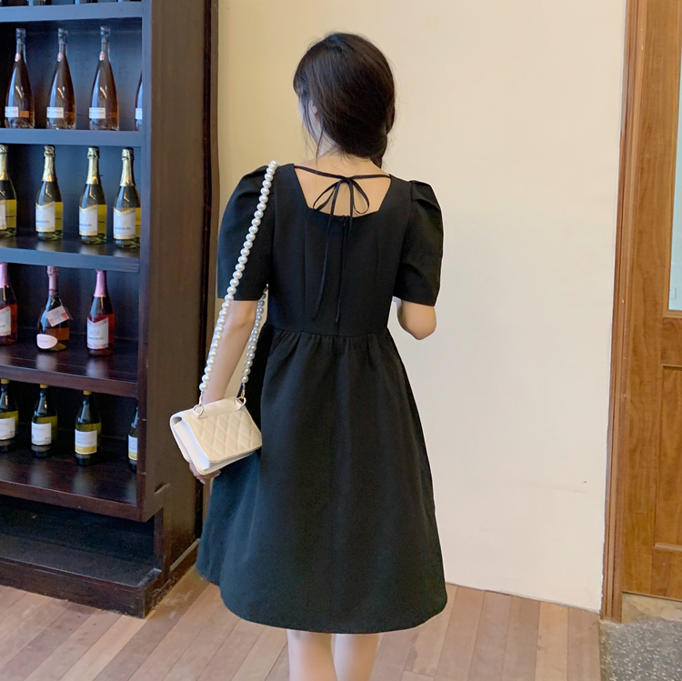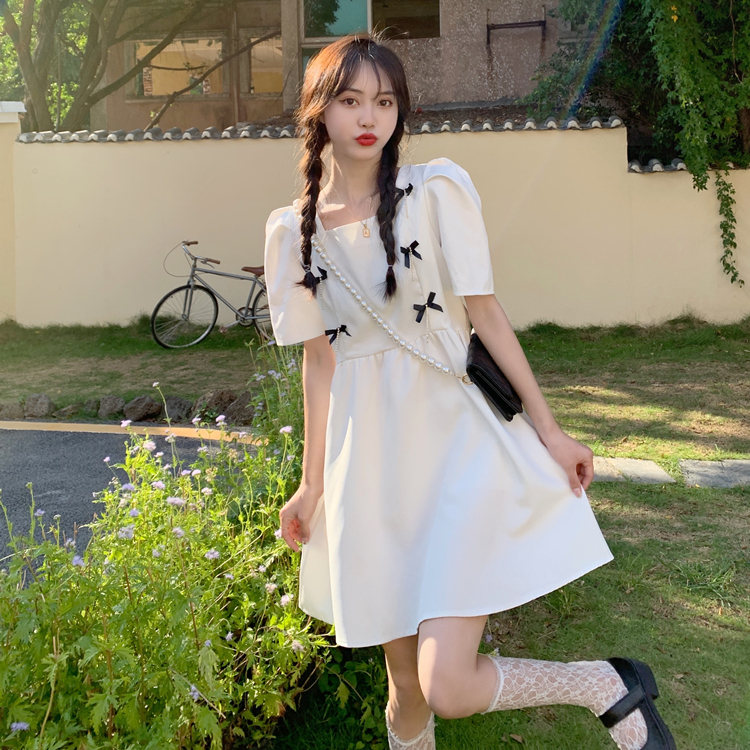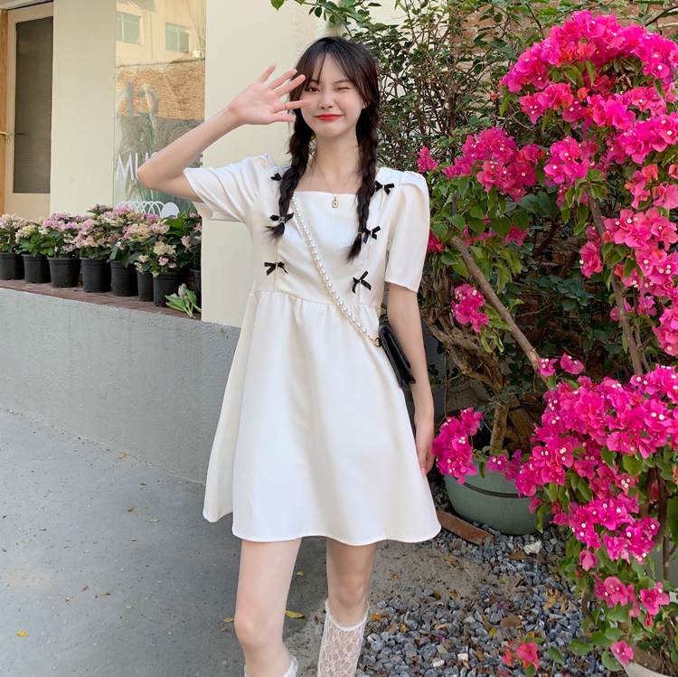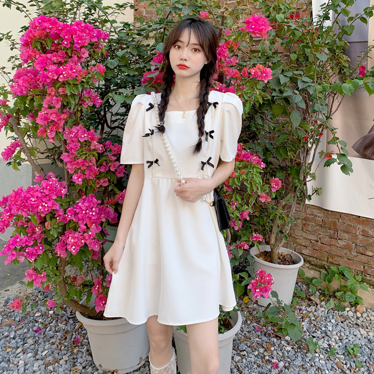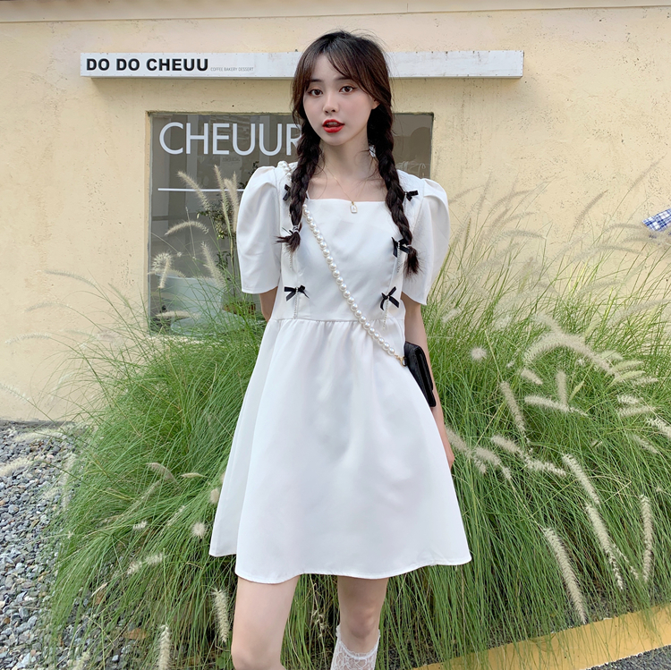 实拍~大码女装法式复古洋气钻石链条蝴蝶结气质显瘦方领连衣裙女
