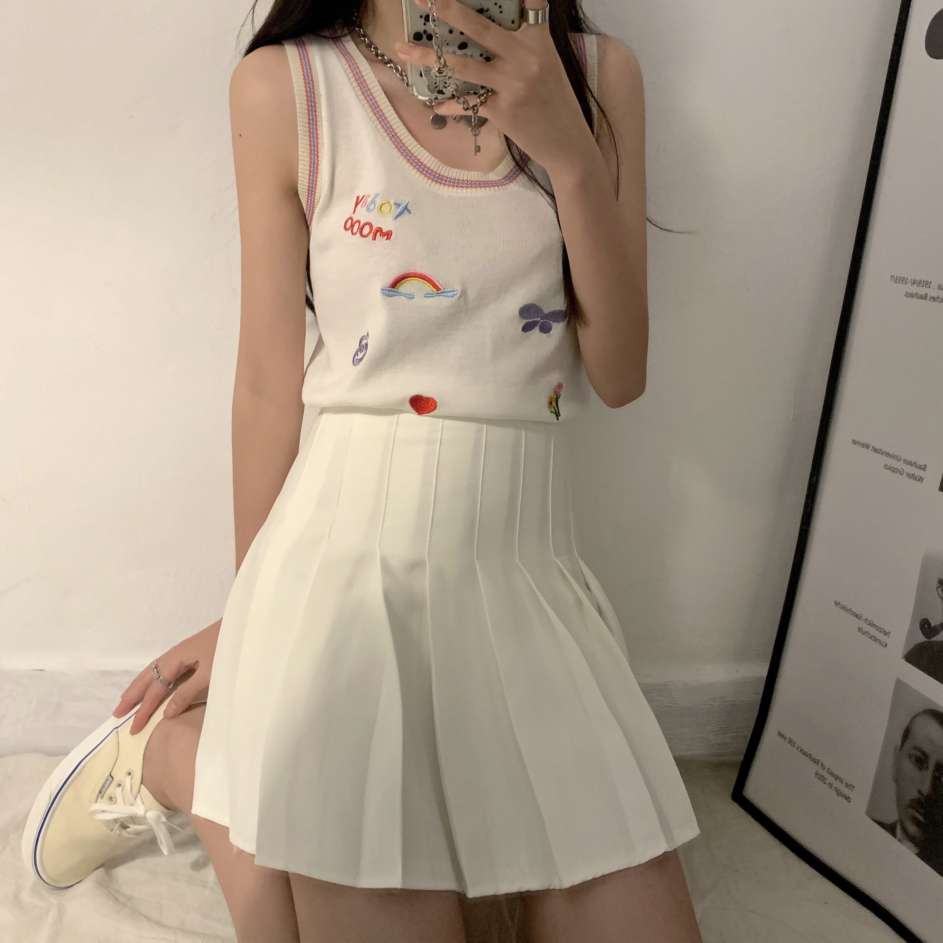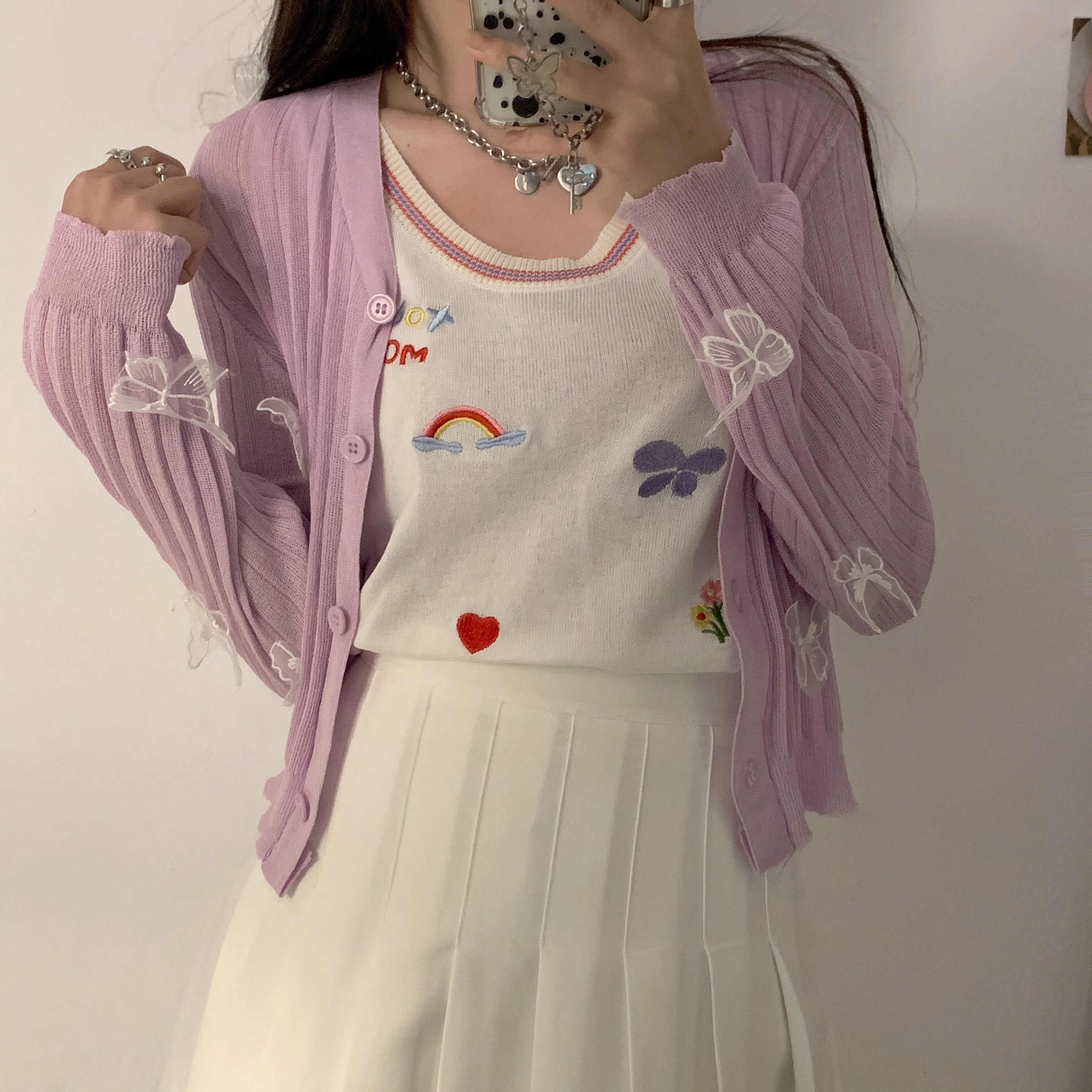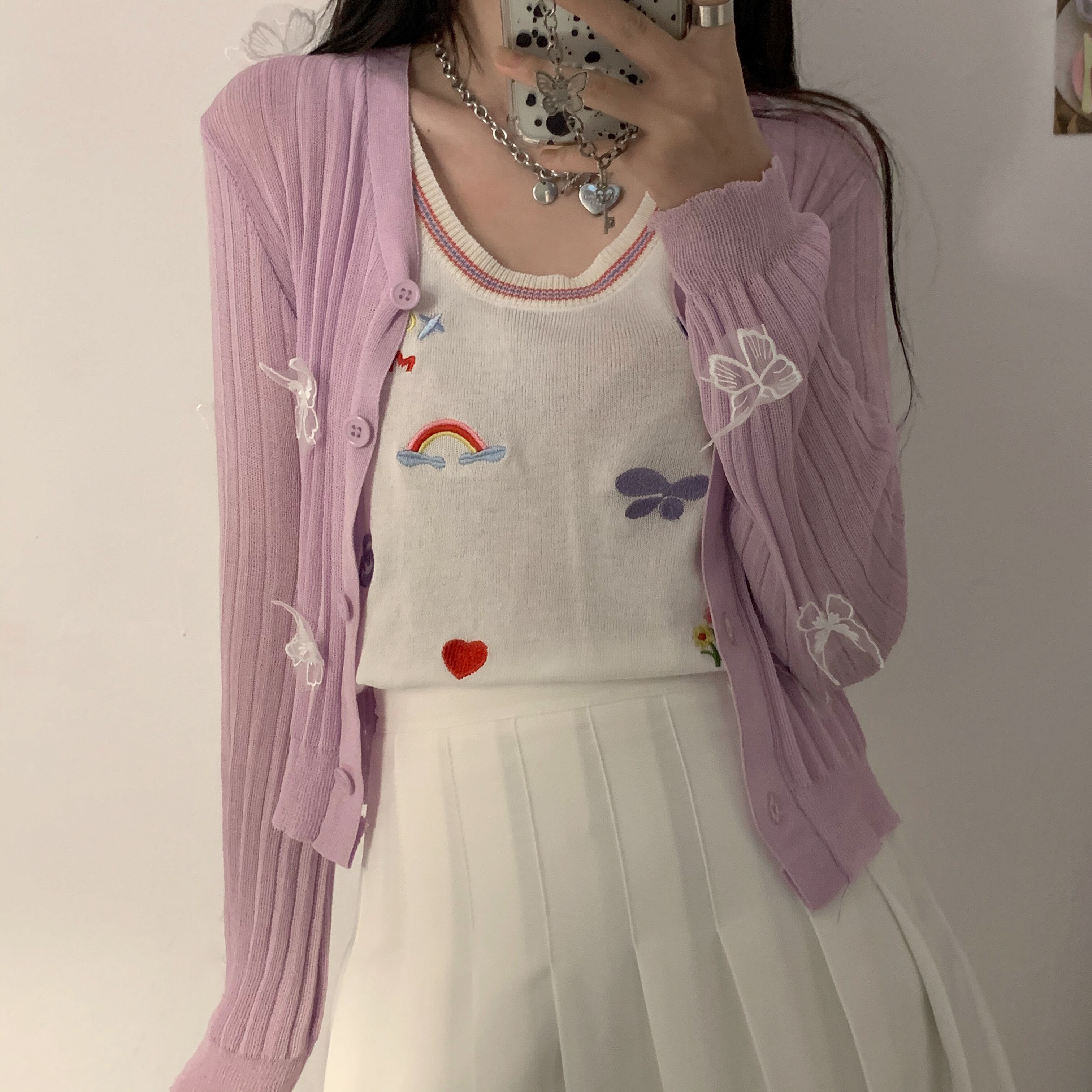 尺寸/均码 蝴蝶结针织开衫 衣长45 肩宽18 袖长62 胸围66+ 冰丝打底背心 胸围74 衣长43 肩宽26 百褶裙(里布安全裤)