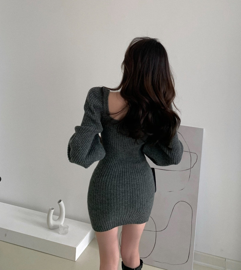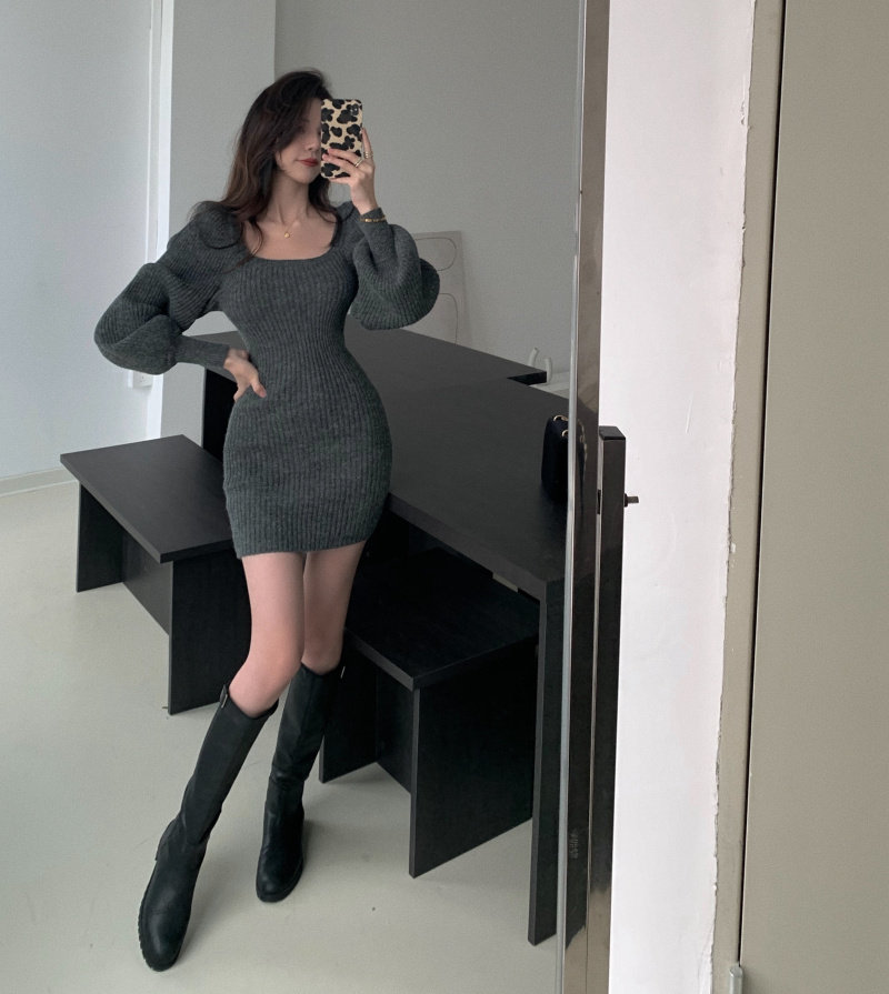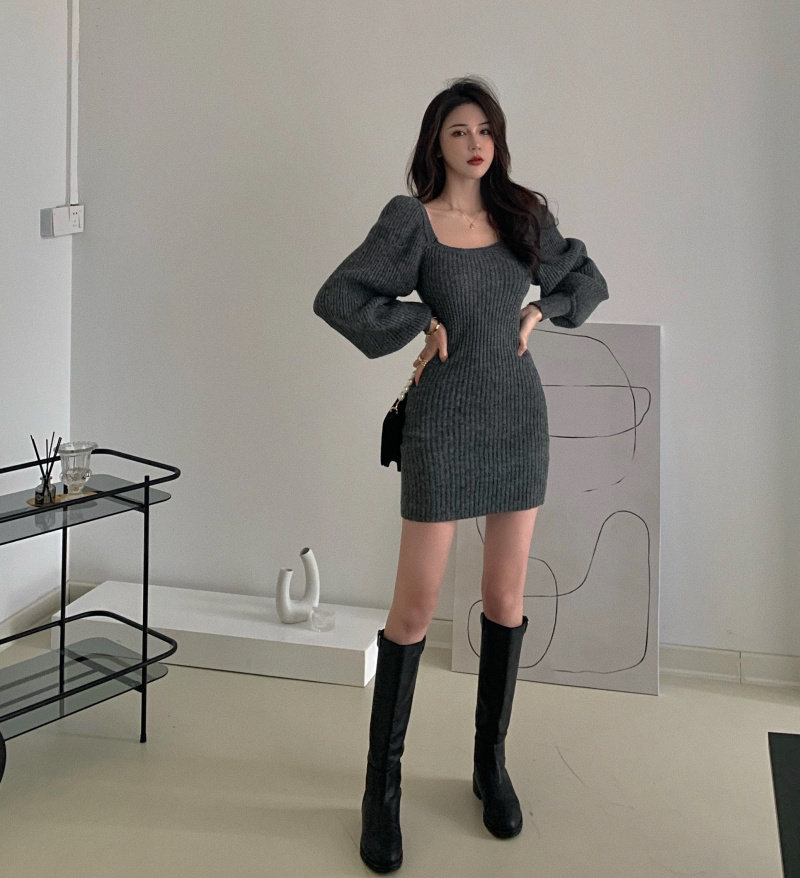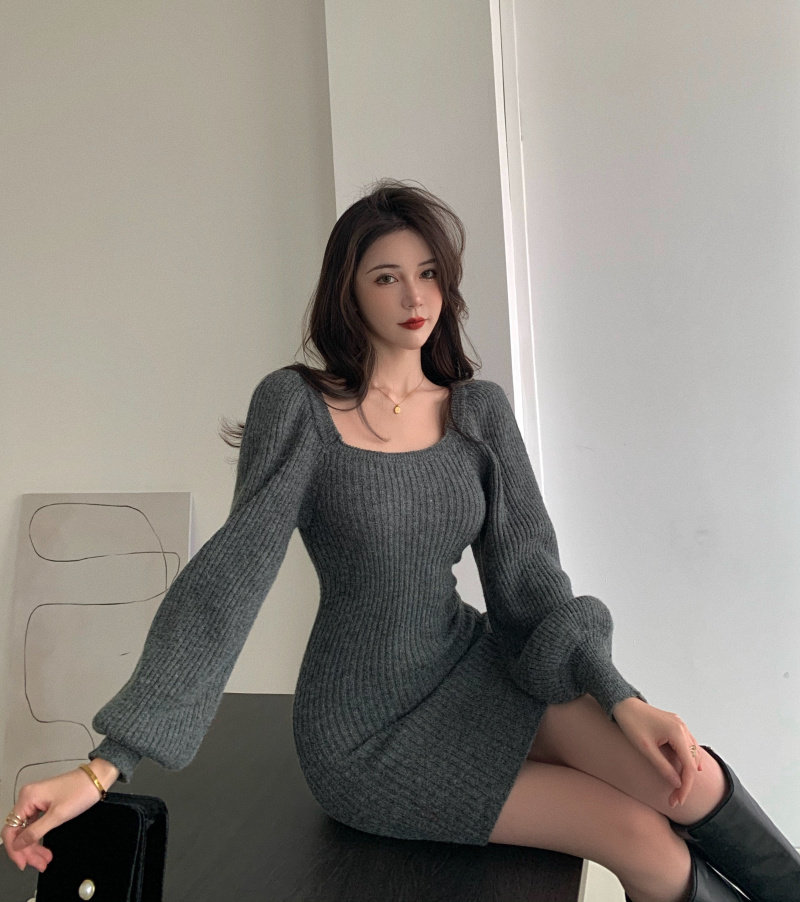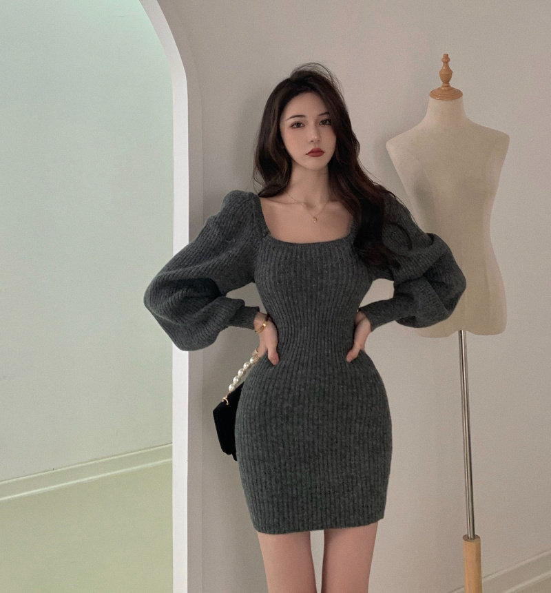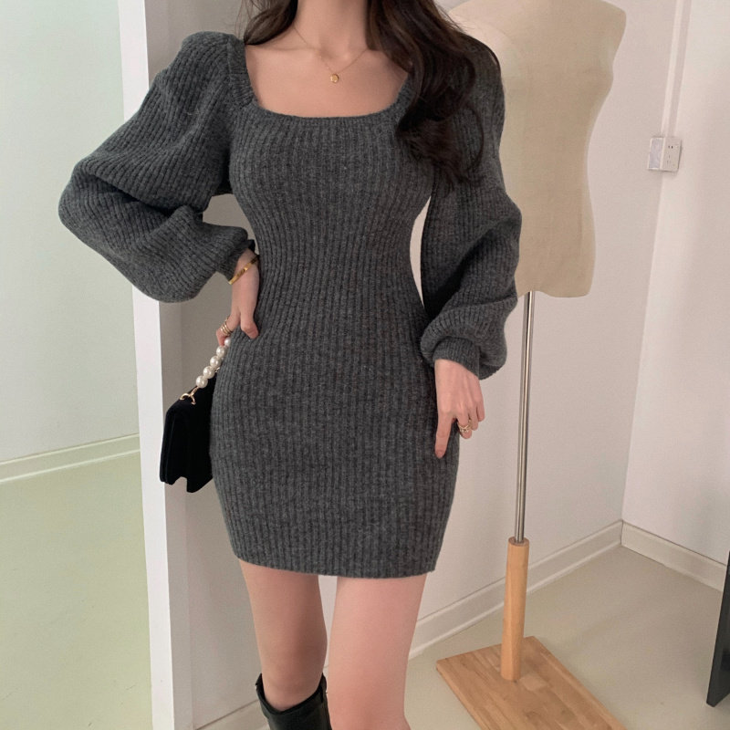 实拍实价方领灯笼袖坑条针织裙女新款韩版小众修身显瘦百搭连衣裙