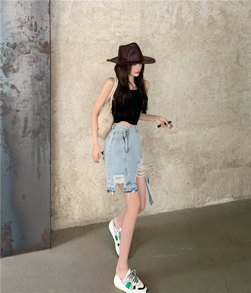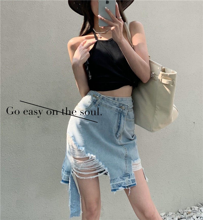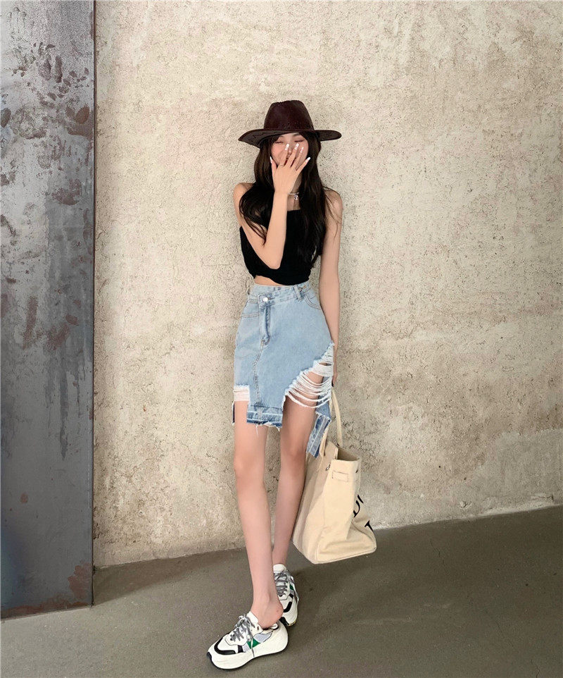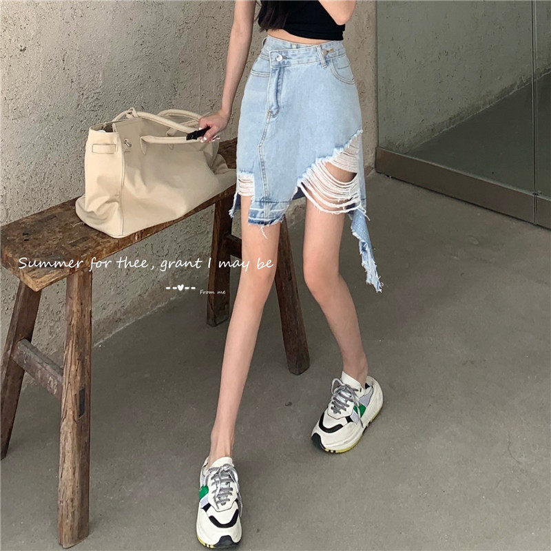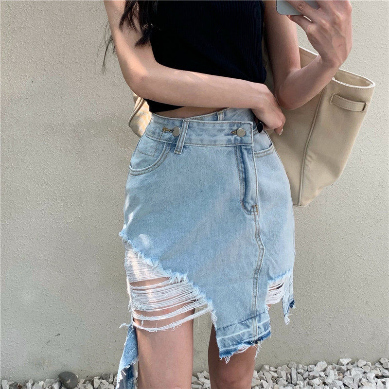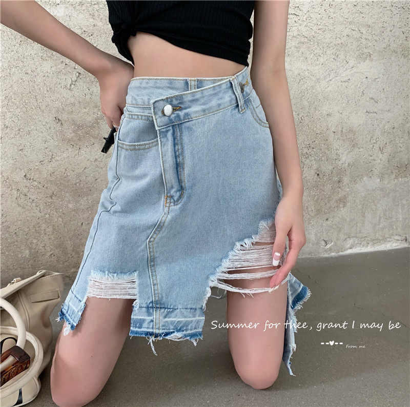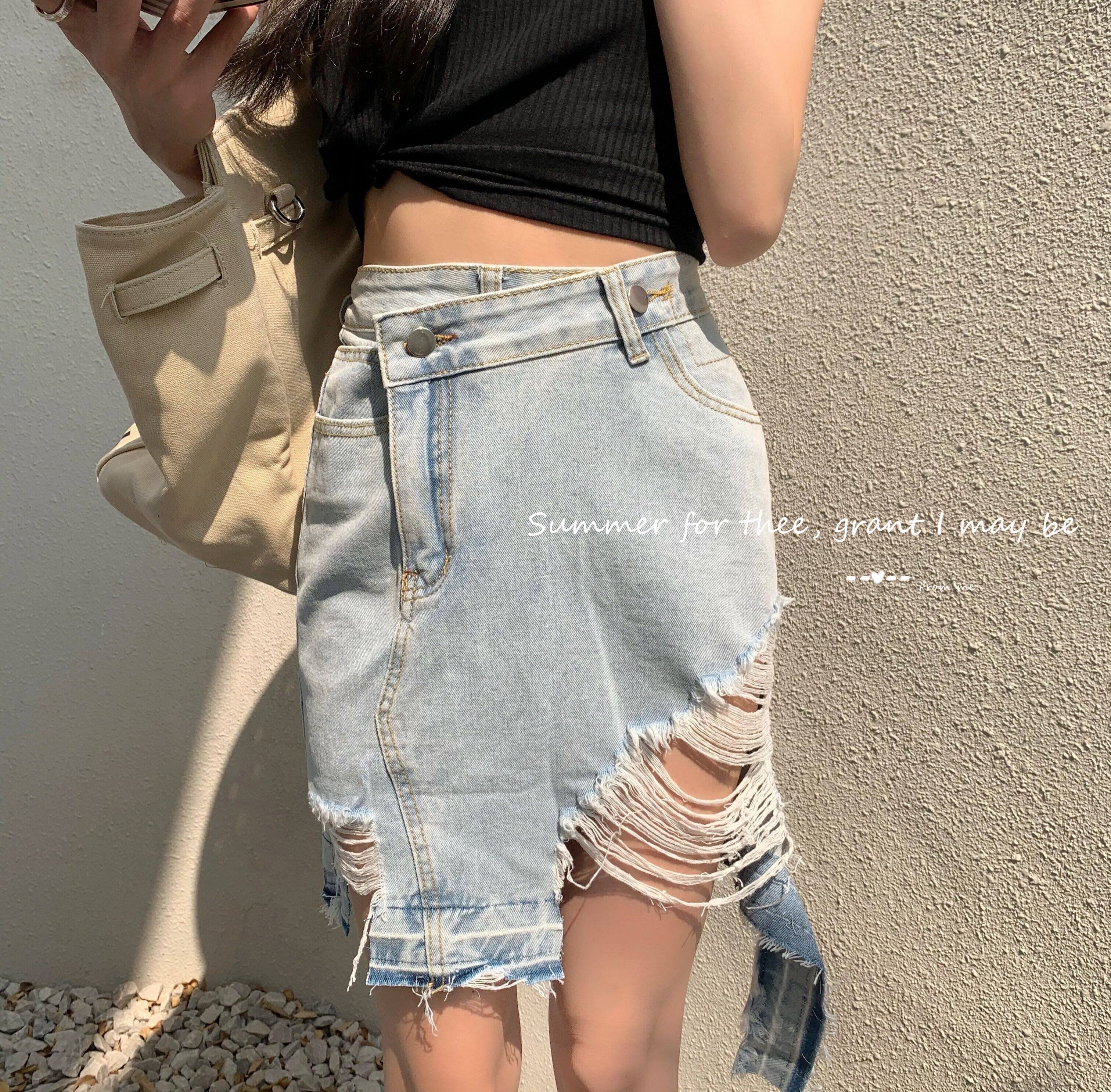 特价不减实拍港风复古薄款破洞短裙重工毛边高腰不规则牛仔半身裙