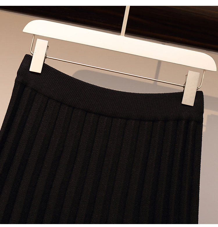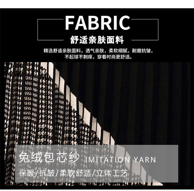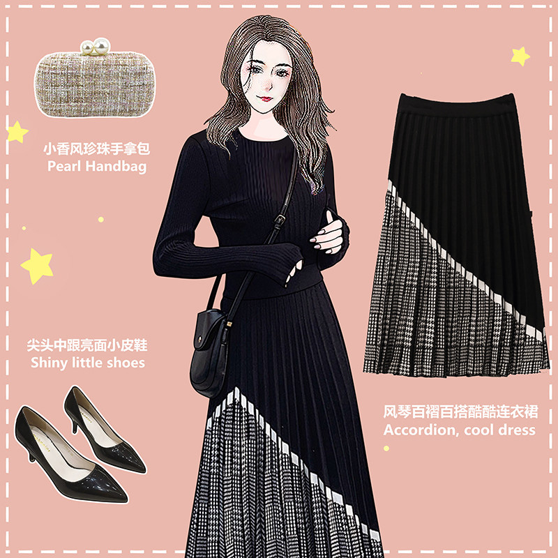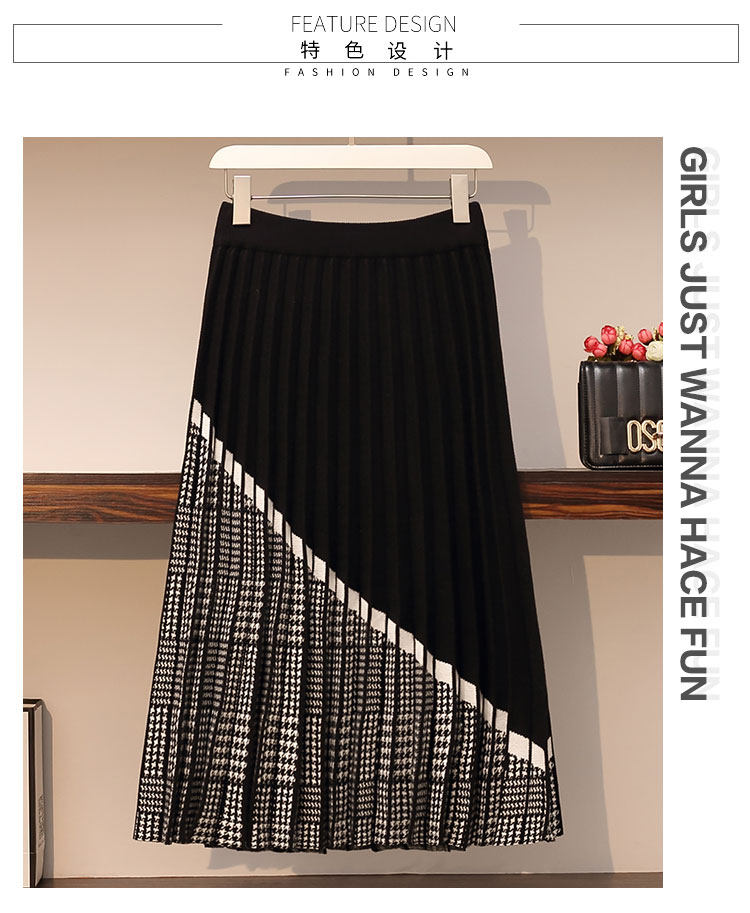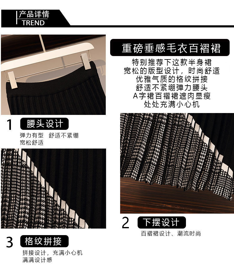 金钱雨实拍胖mm2021早春复古千鸟格拼接松紧腰针织A字百褶半身裙