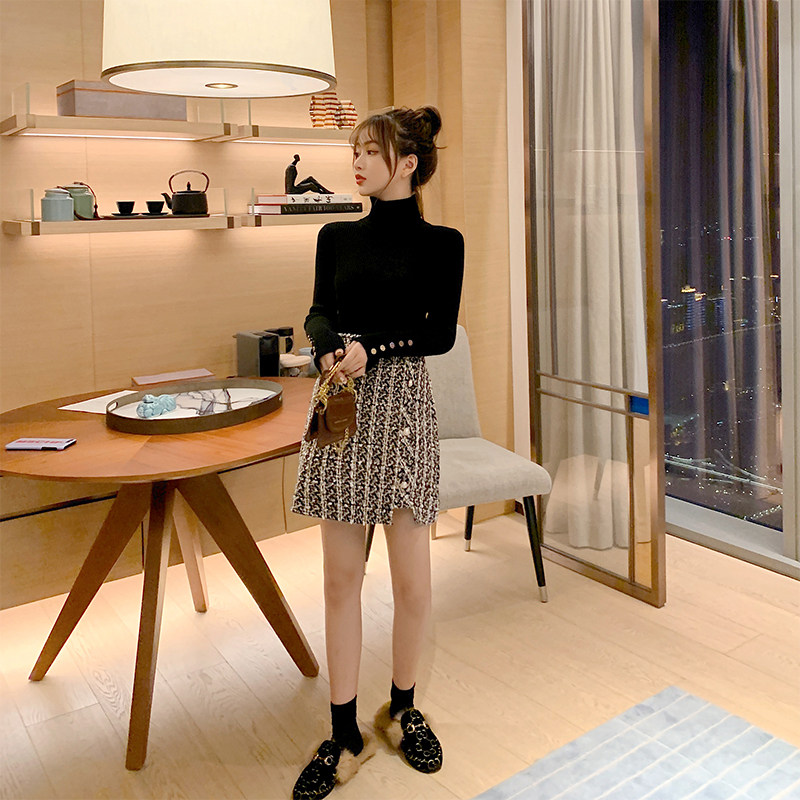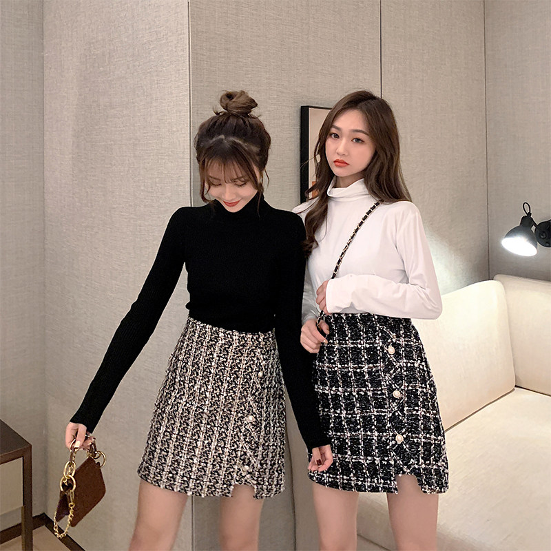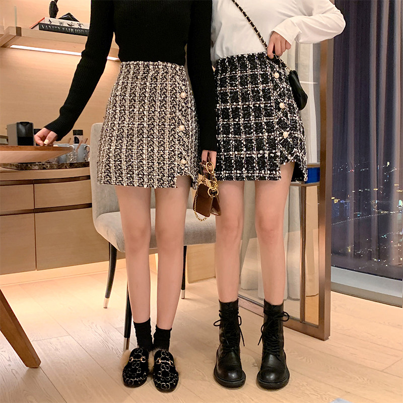 实拍现货 大码女装毛呢短裙A字包臀裙女秋冬小香风格子防走