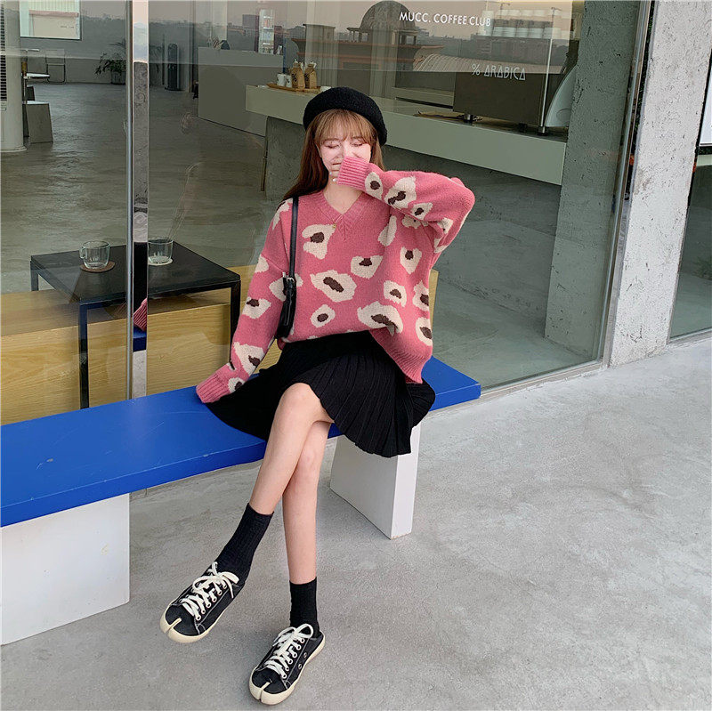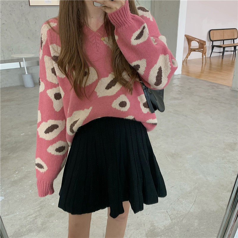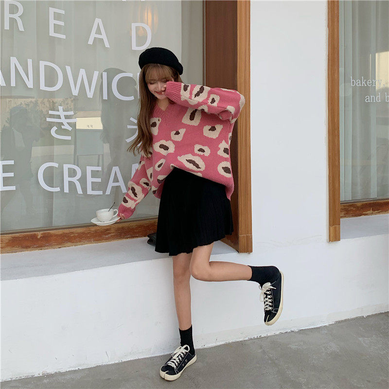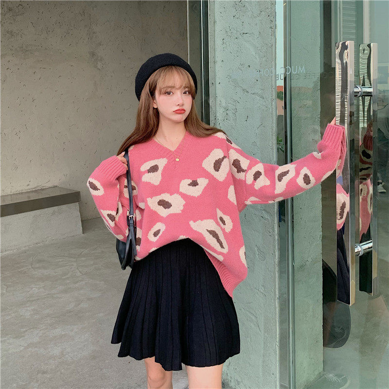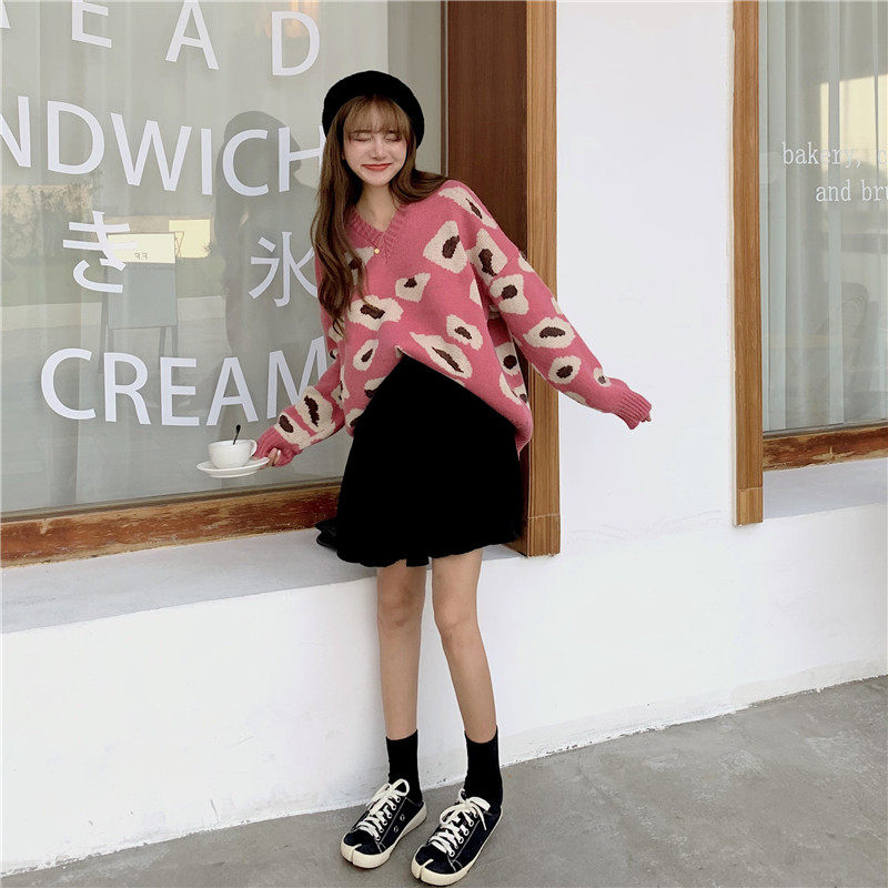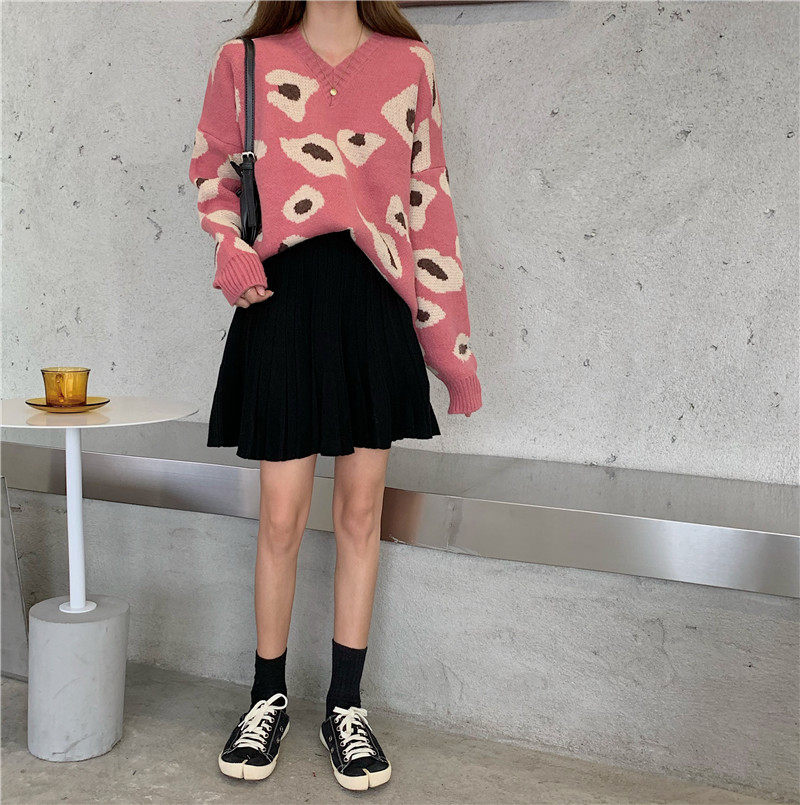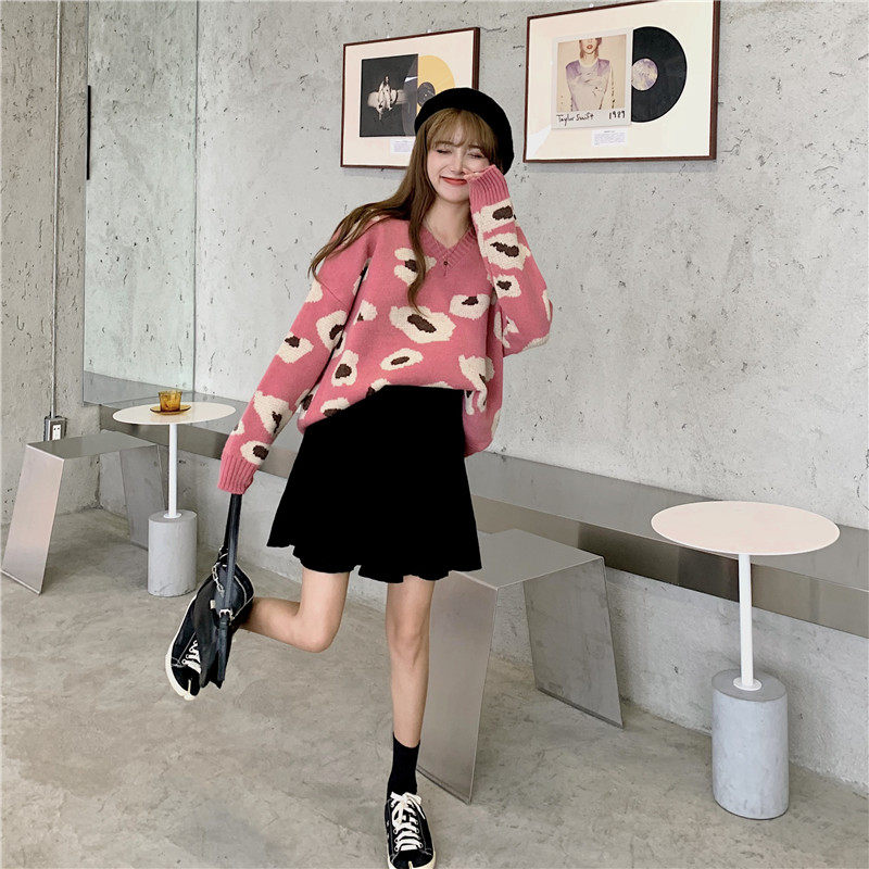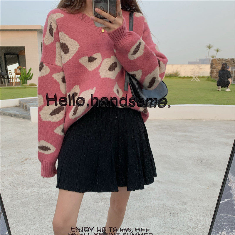 实拍大码装慵懒风宽松针织衫显瘦套头V领毛衣+针织半身裙子
