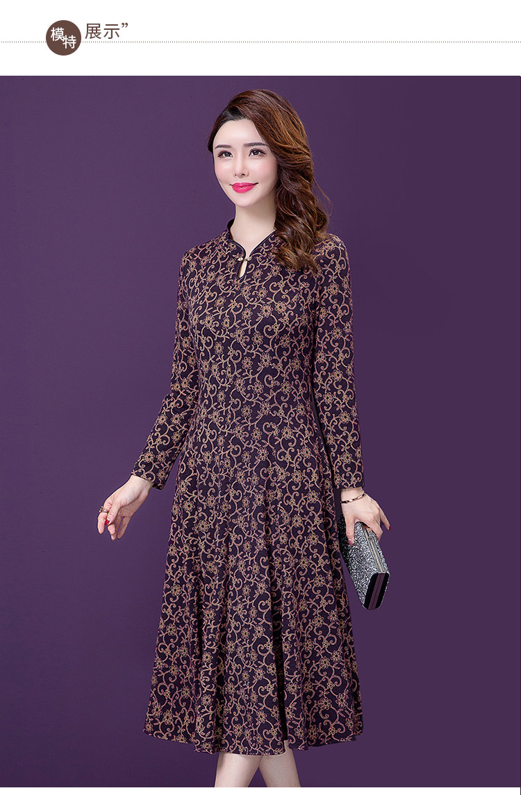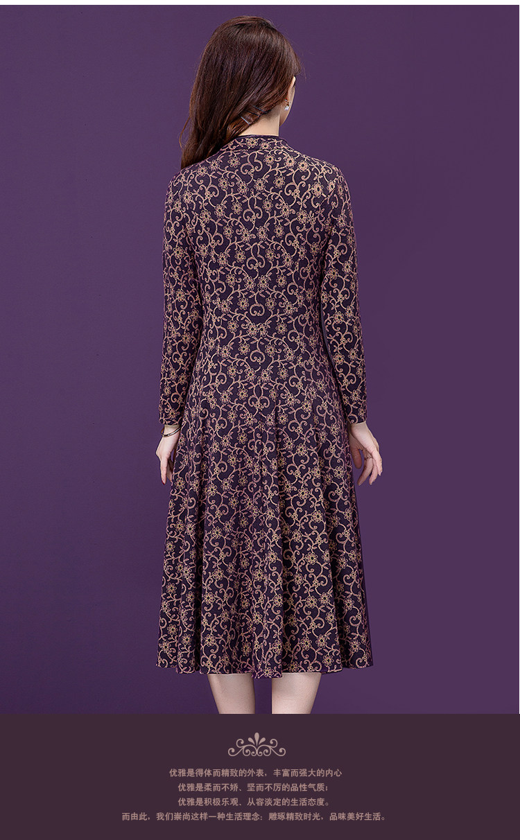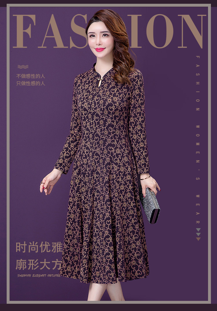 实拍现货2020秋季新款复古气质妈妈中年显瘦收腰印花长袖连衣裙女