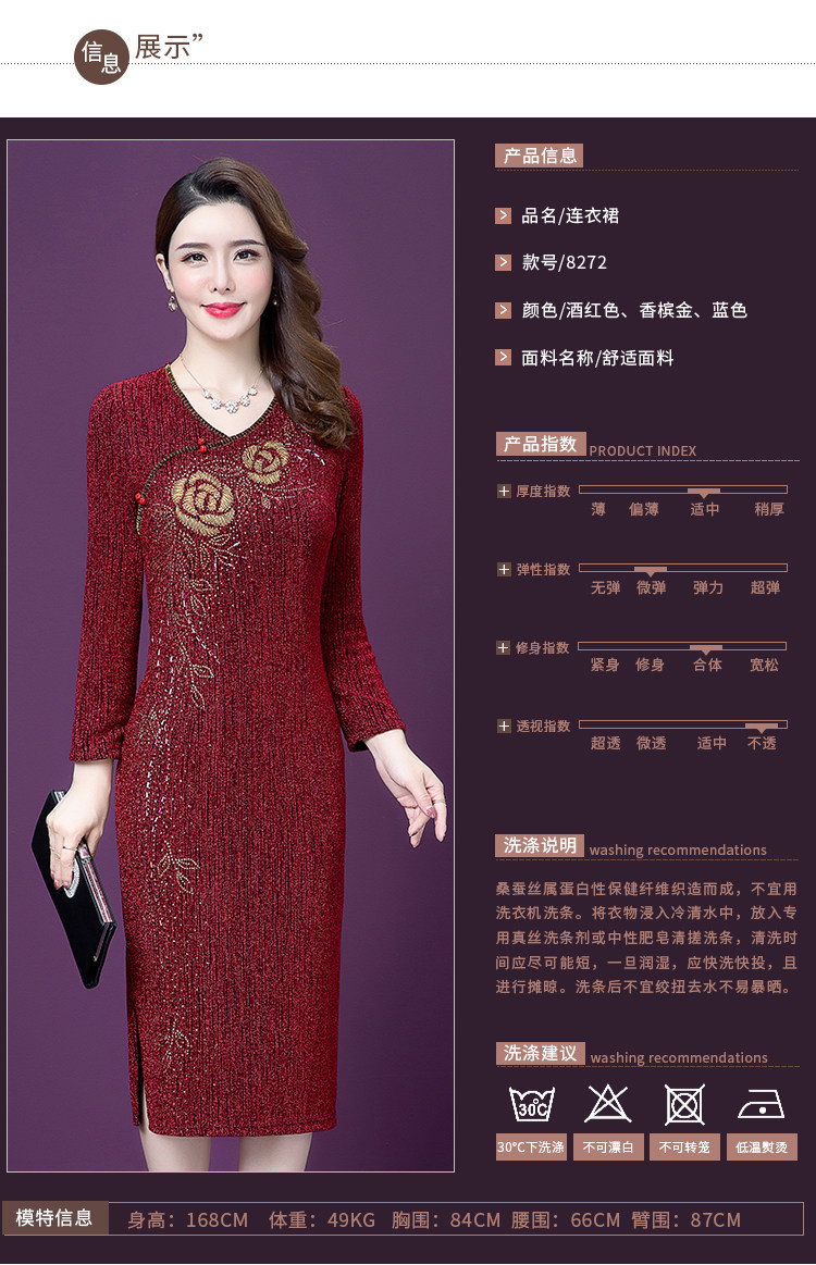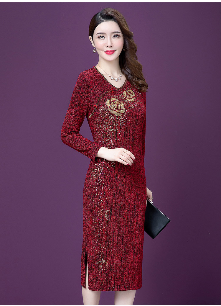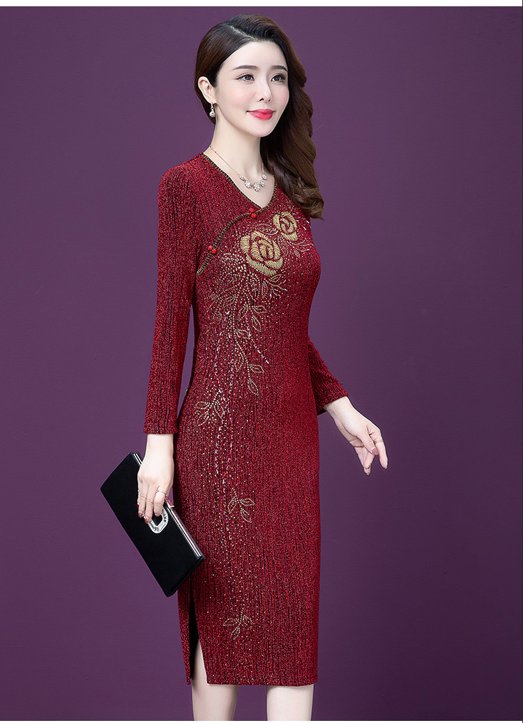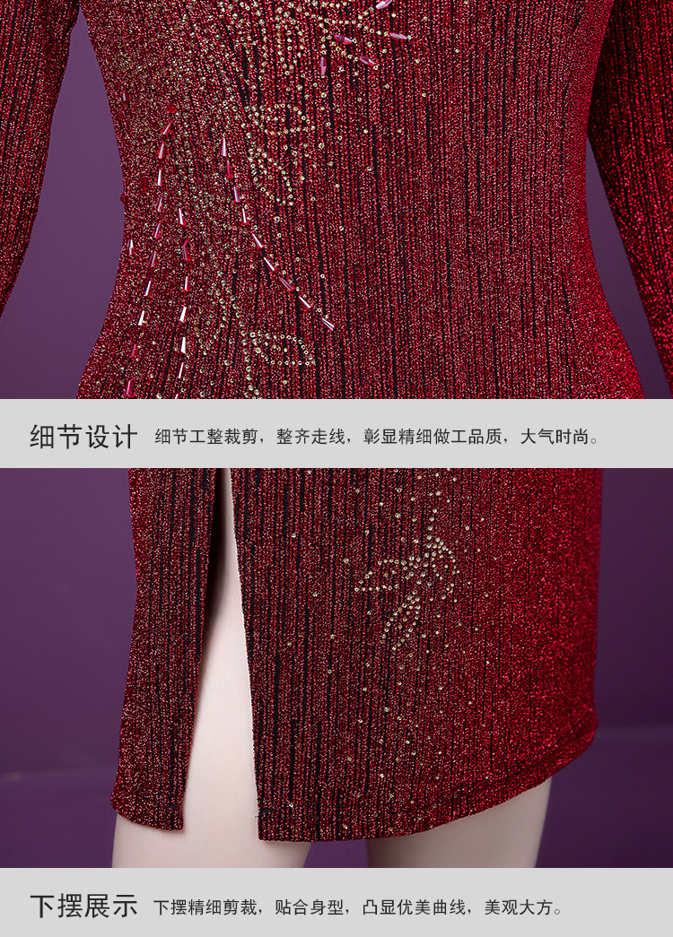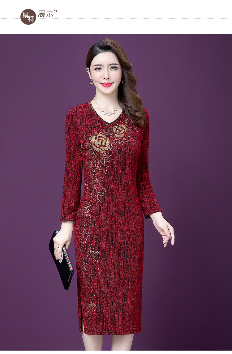 实拍修身开叉旗袍2019秋季新款女婚礼宴会喜婆婆显瘦长袖连衣裙