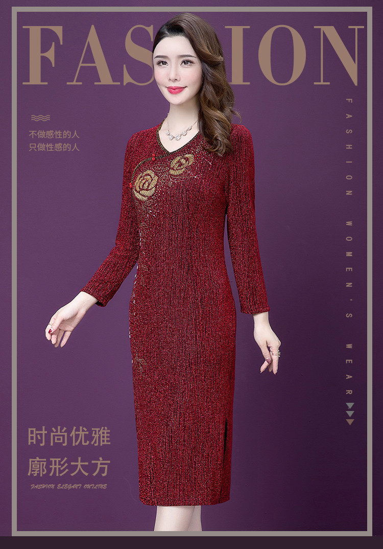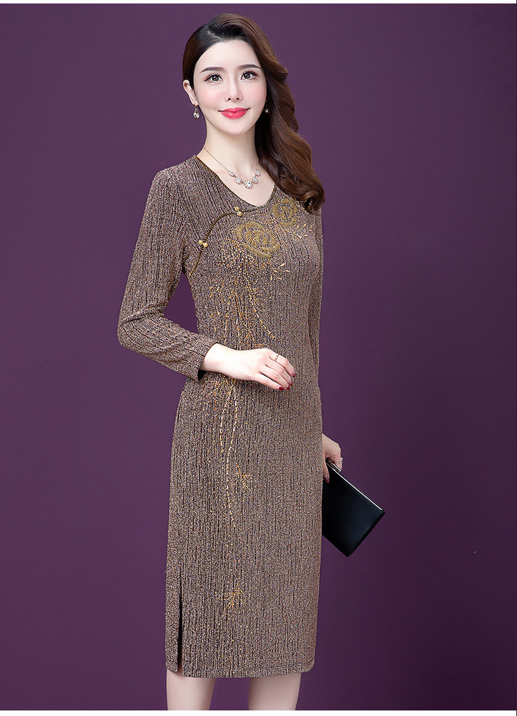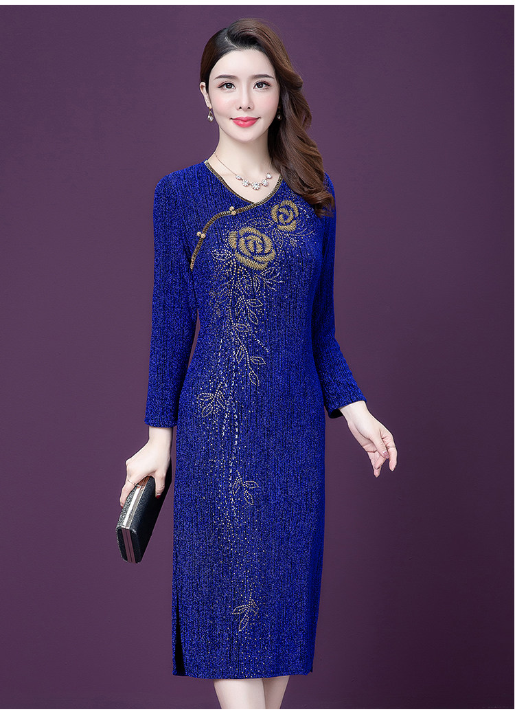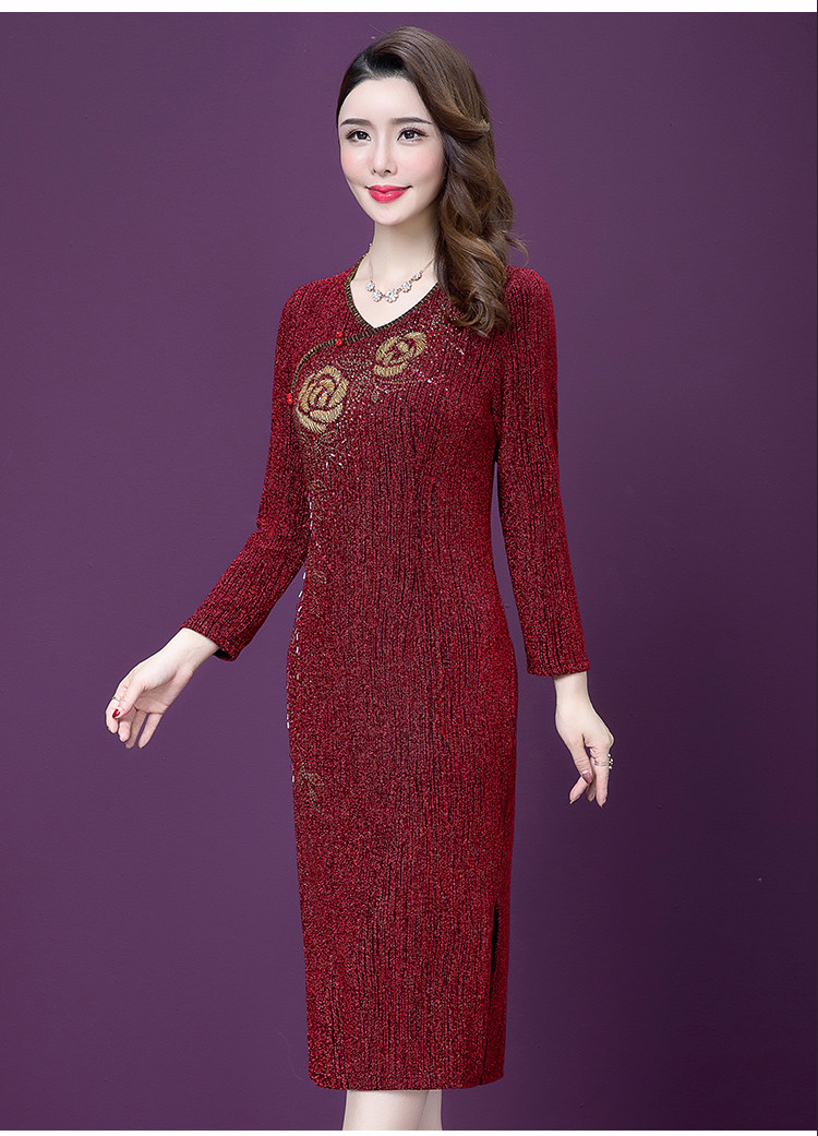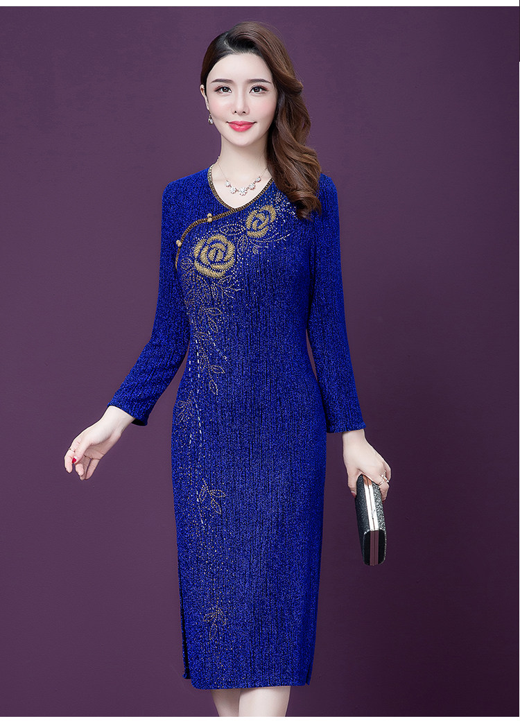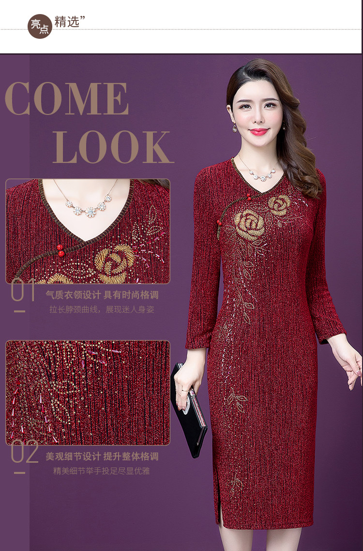 实拍修身开叉旗袍2019秋季新款女婚礼宴会喜婆婆显瘦长袖连衣裙