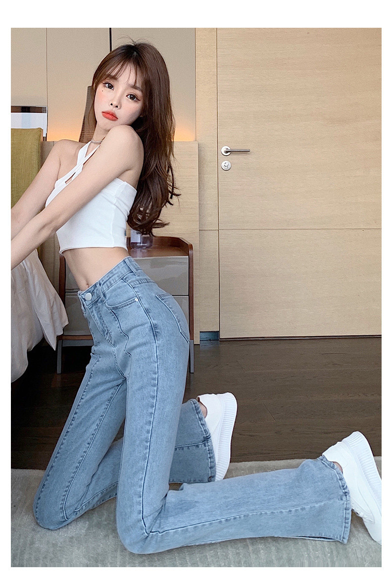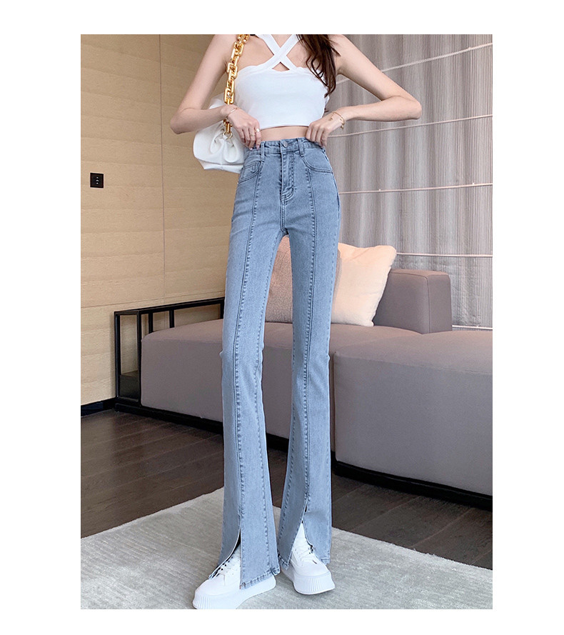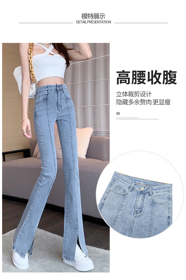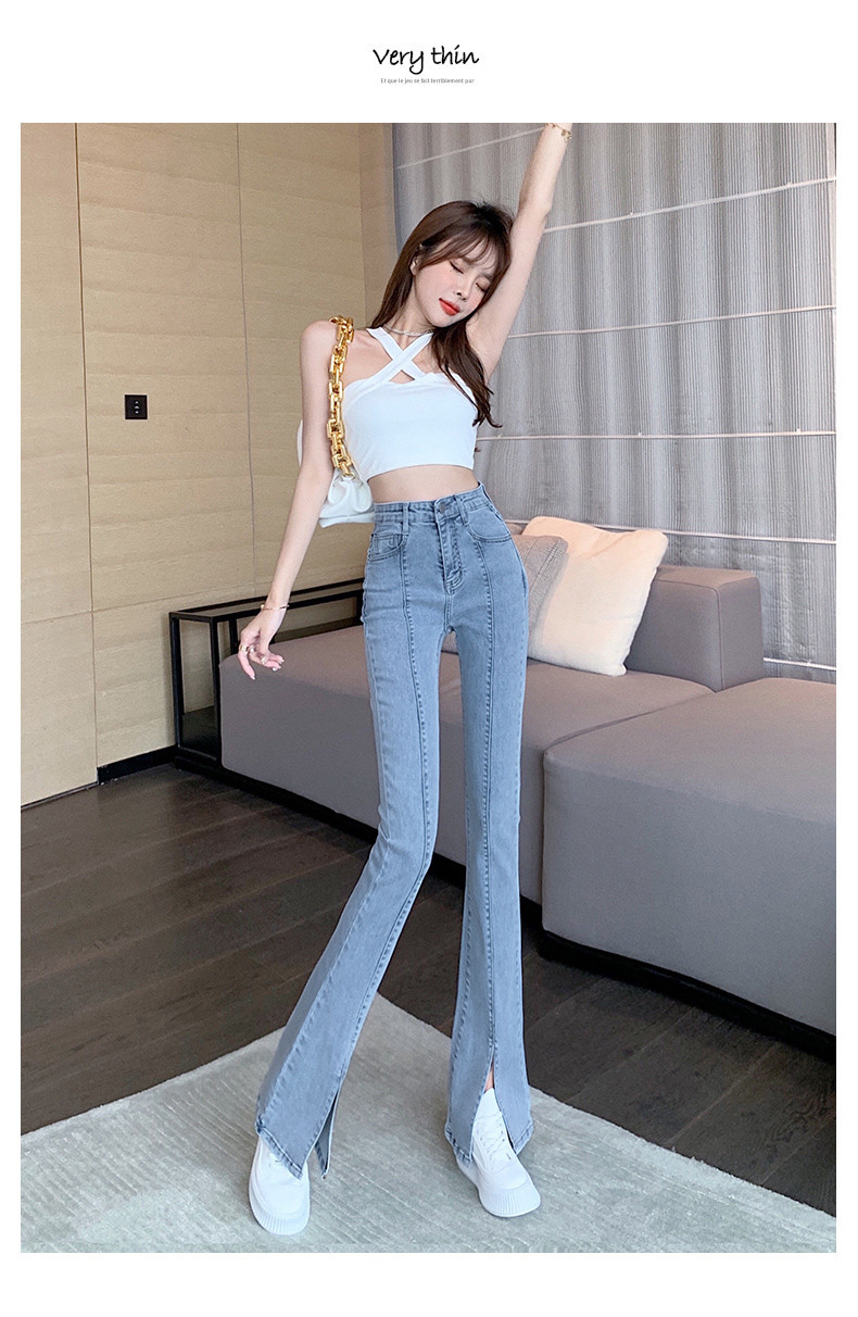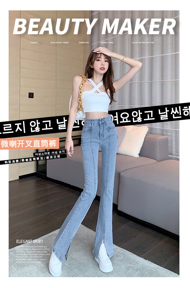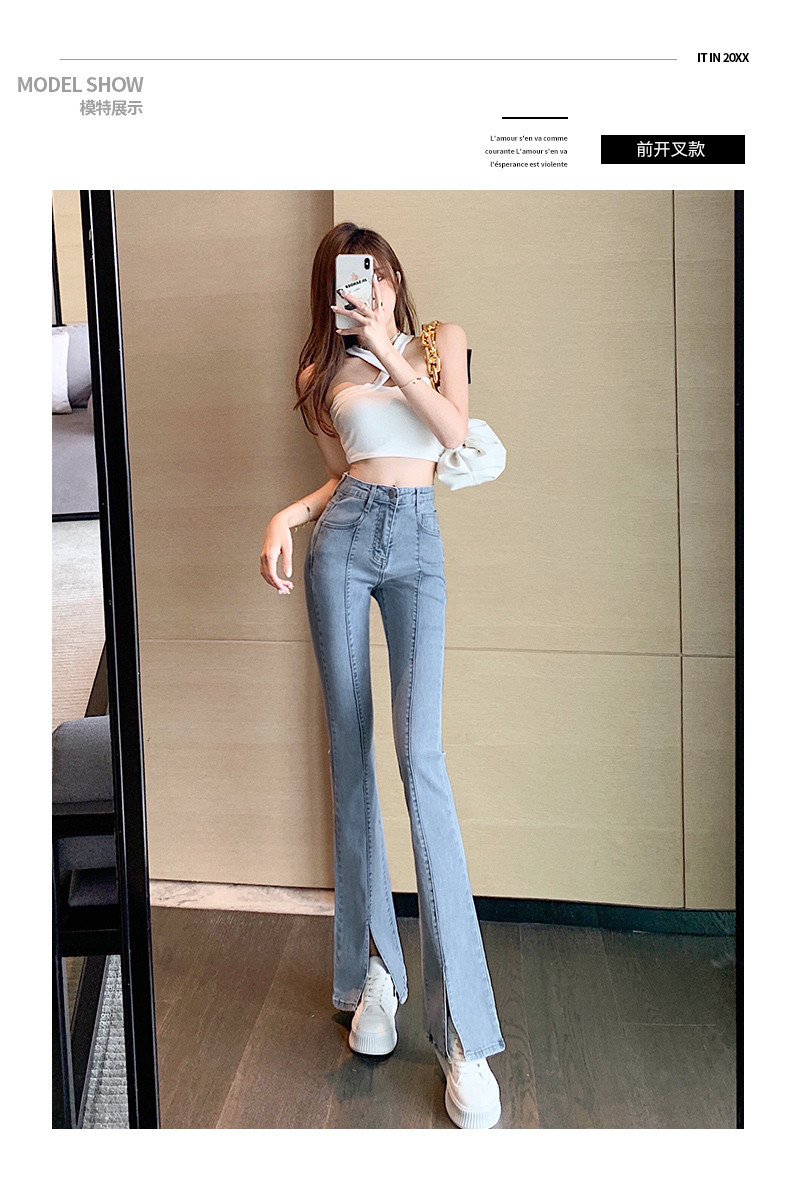 实拍开叉牛仔裤女夏季薄款2021新款高腰小个子微喇叭阔腿女裤子