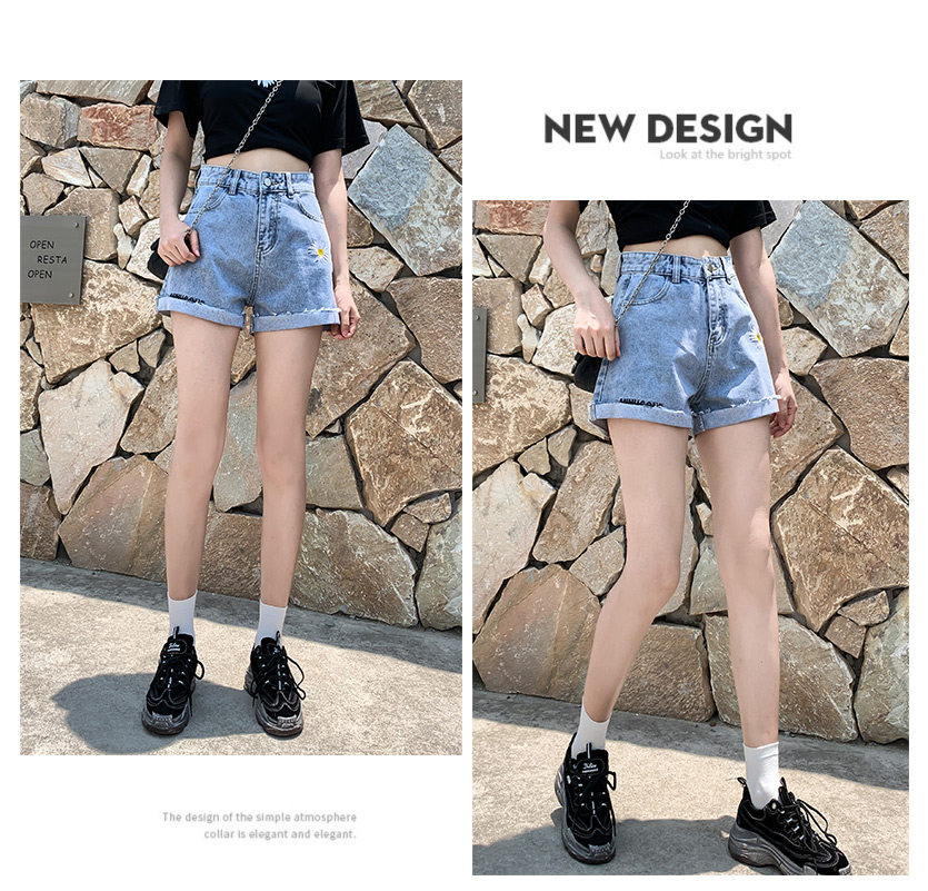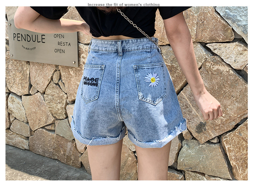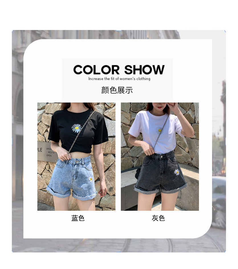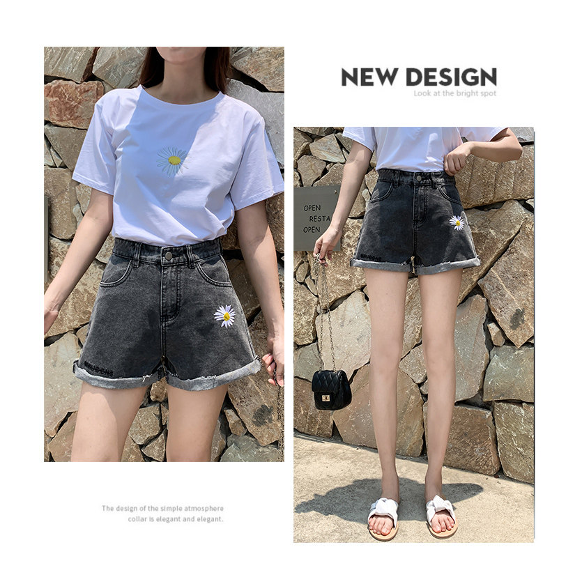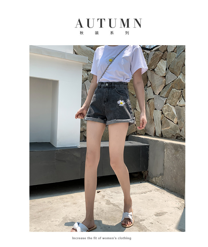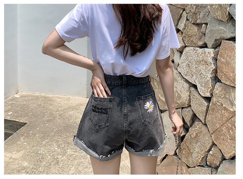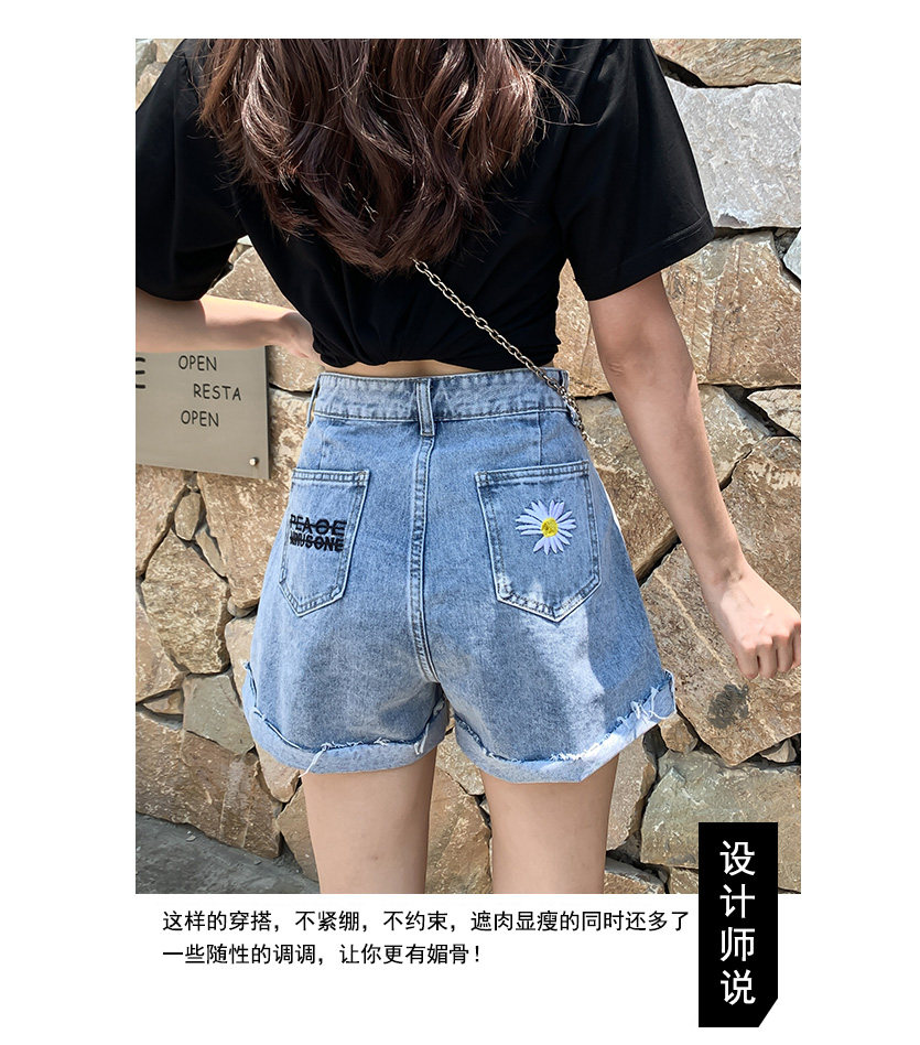 实拍下叫新款牛仔短裤女破洞高腰显瘦a字阔腿宽松小雏菊热裤潮女