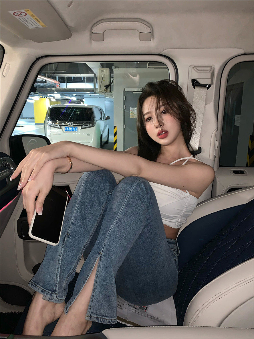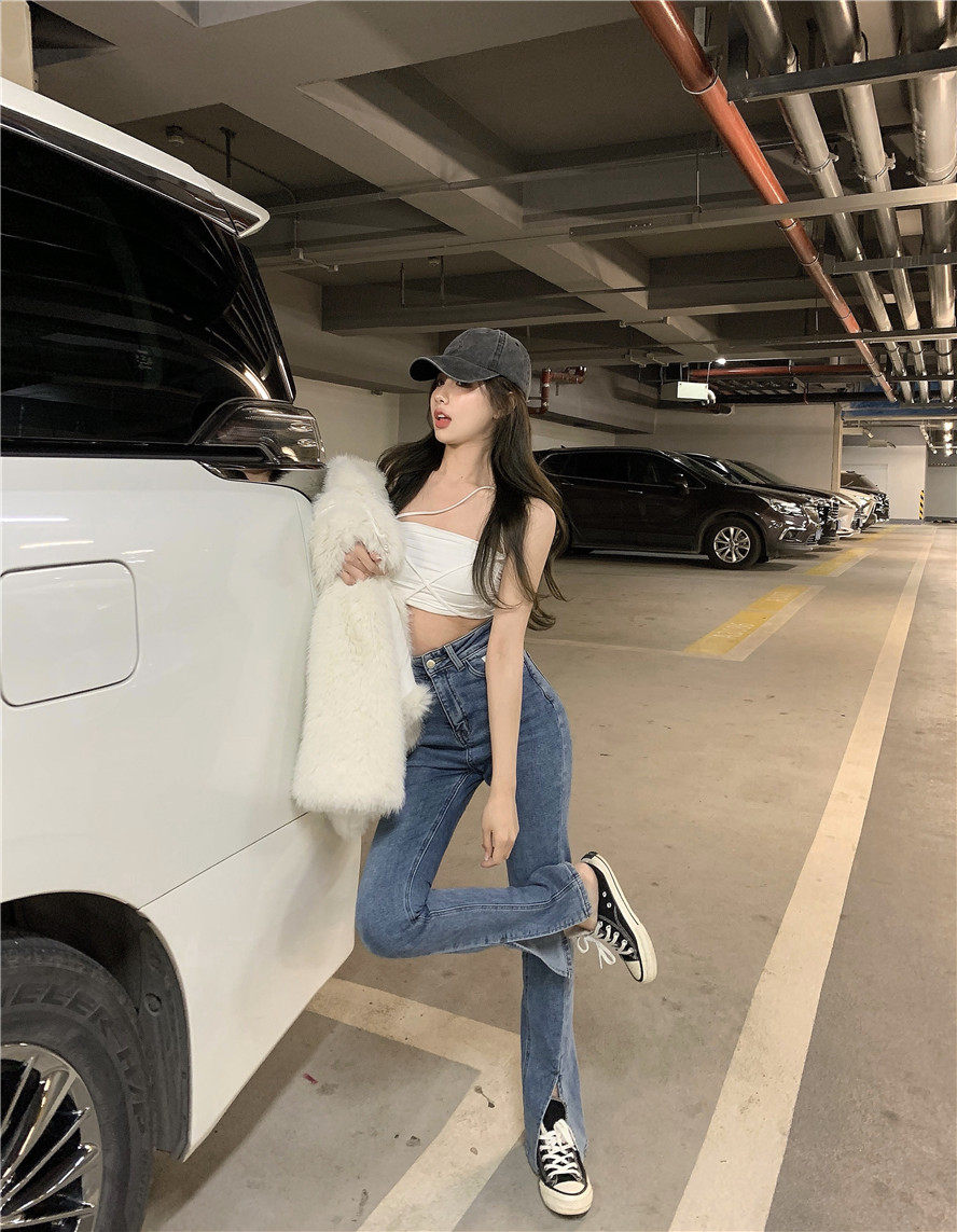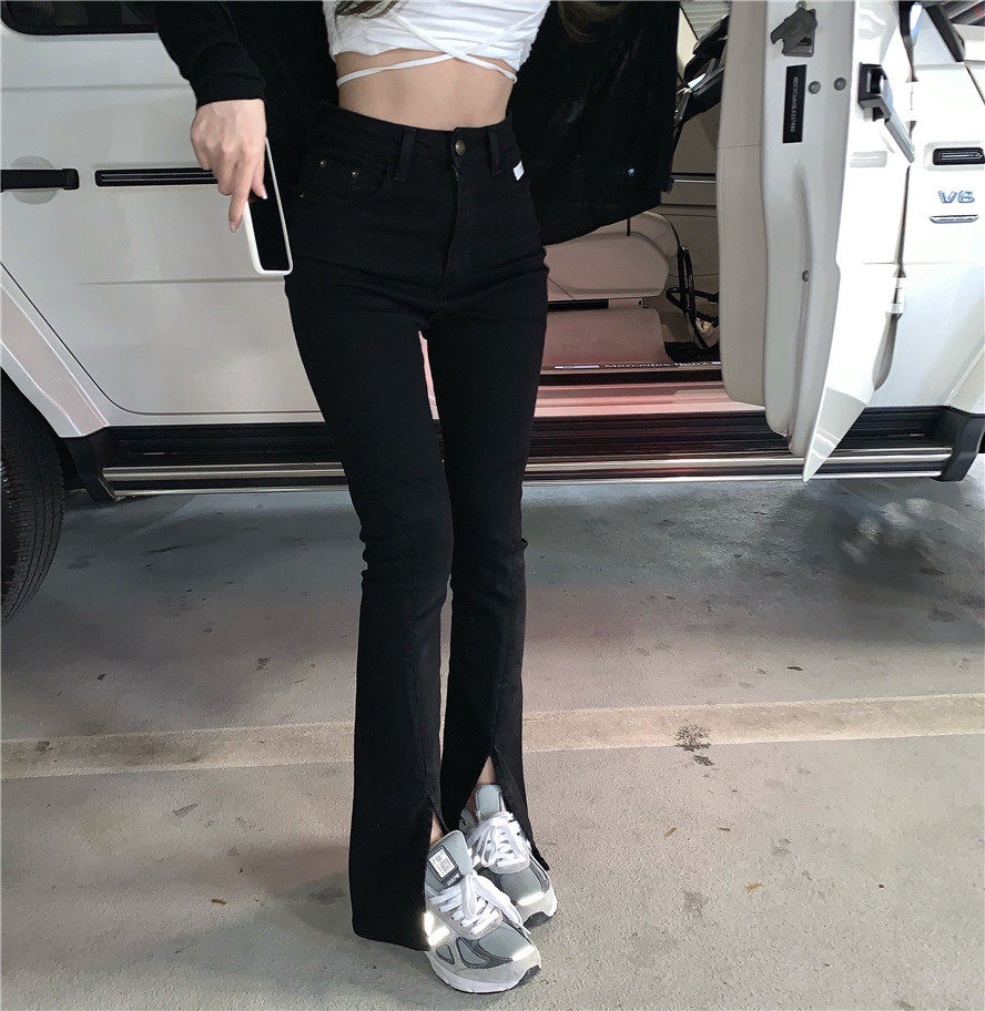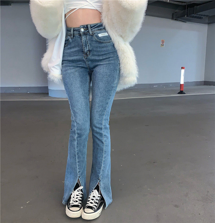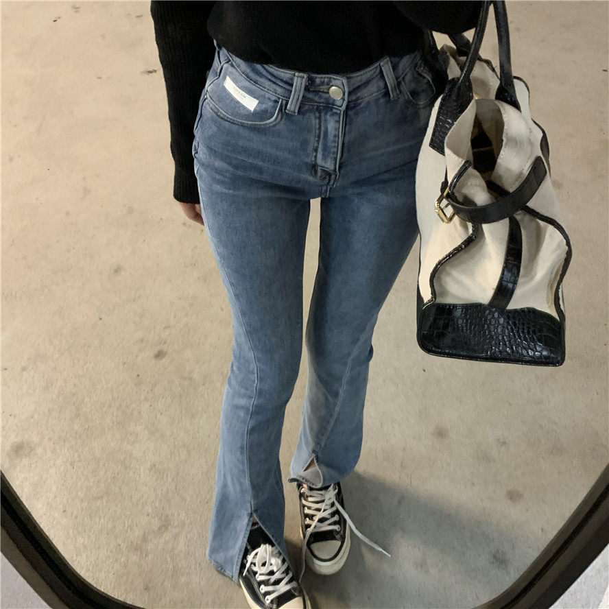 实拍 高腰复古牛仔开叉微喇牛仔裤女