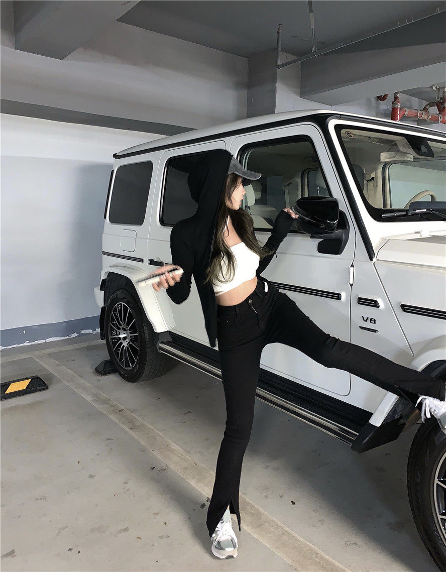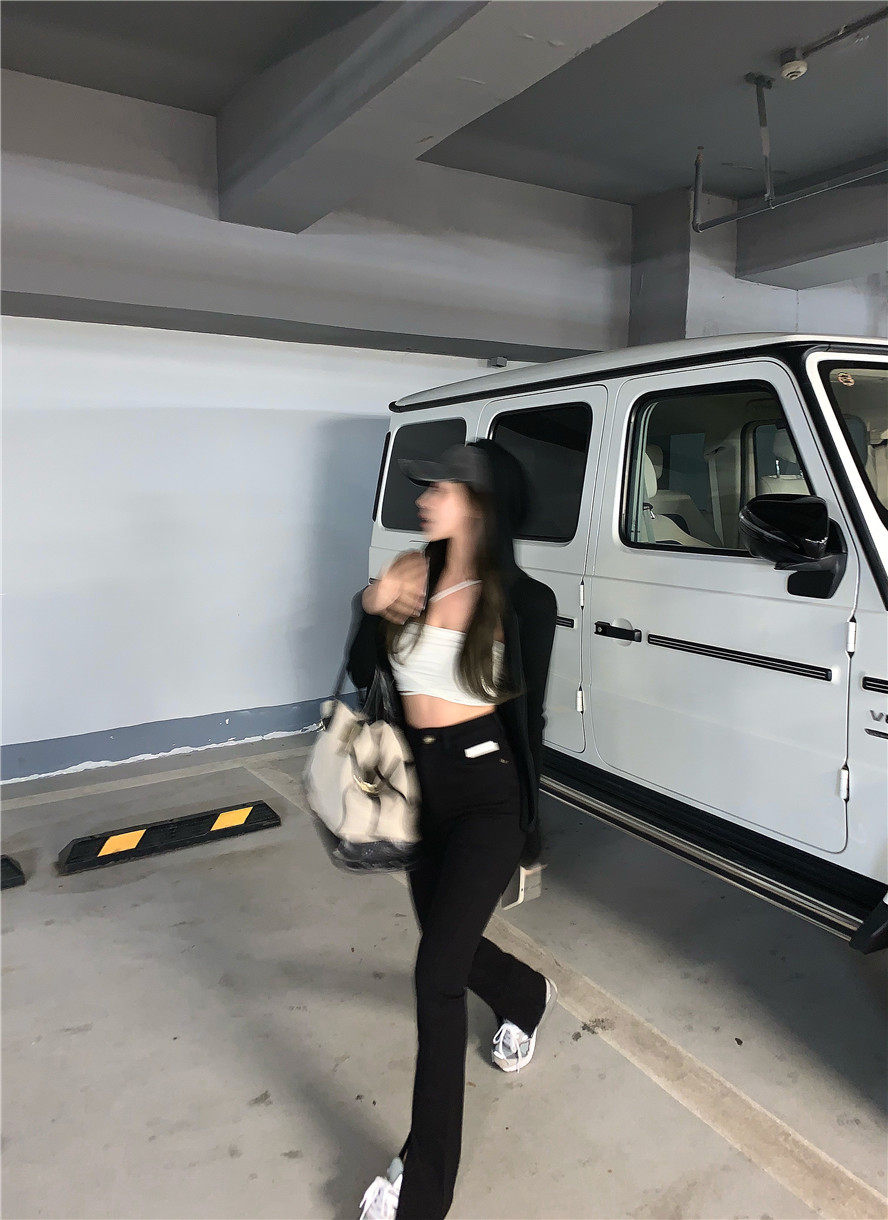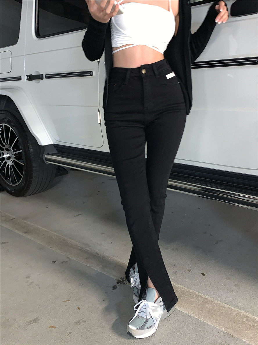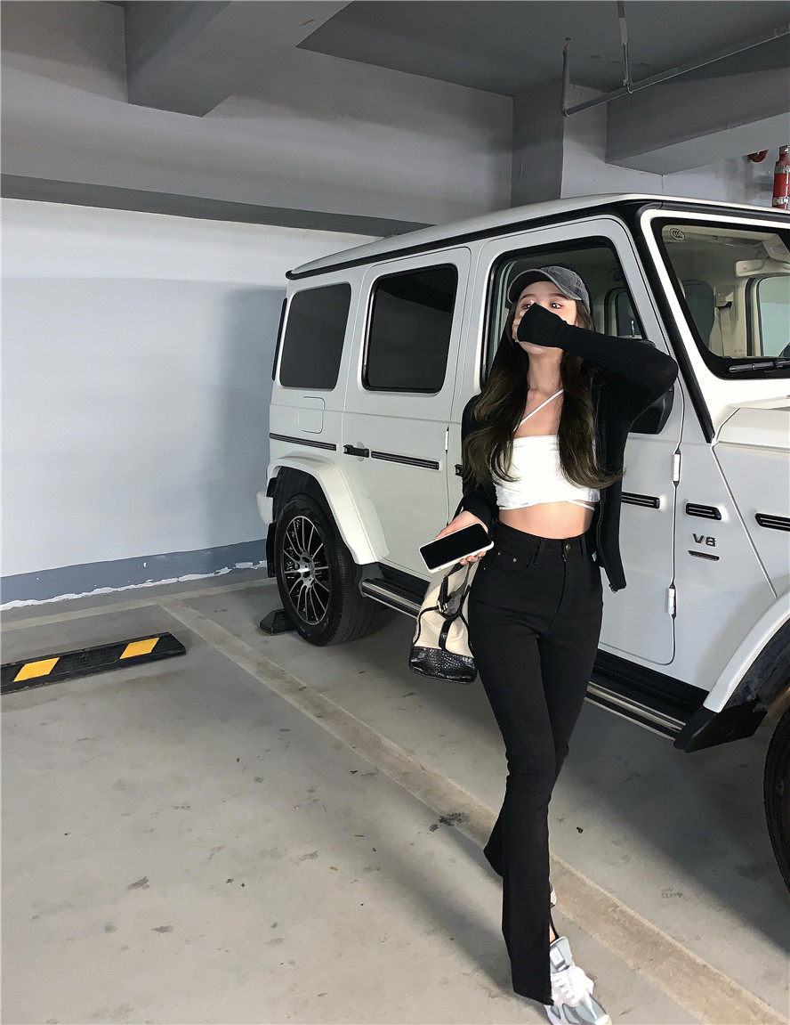 实拍 高腰复古牛仔开叉微喇牛仔裤女