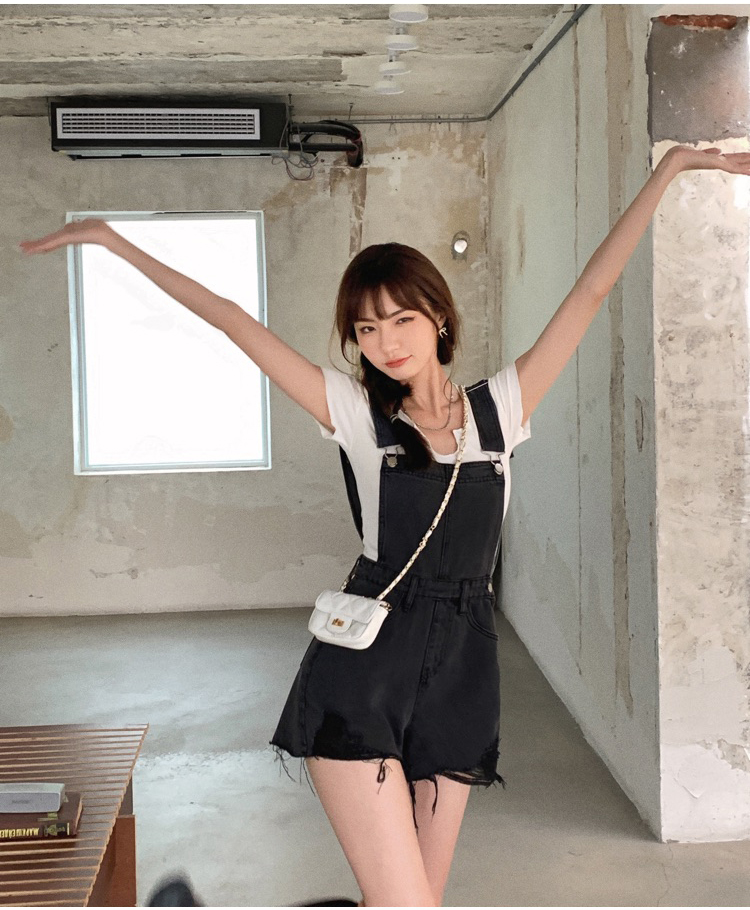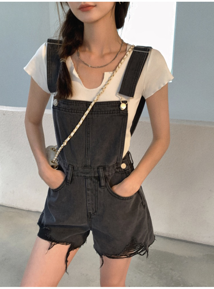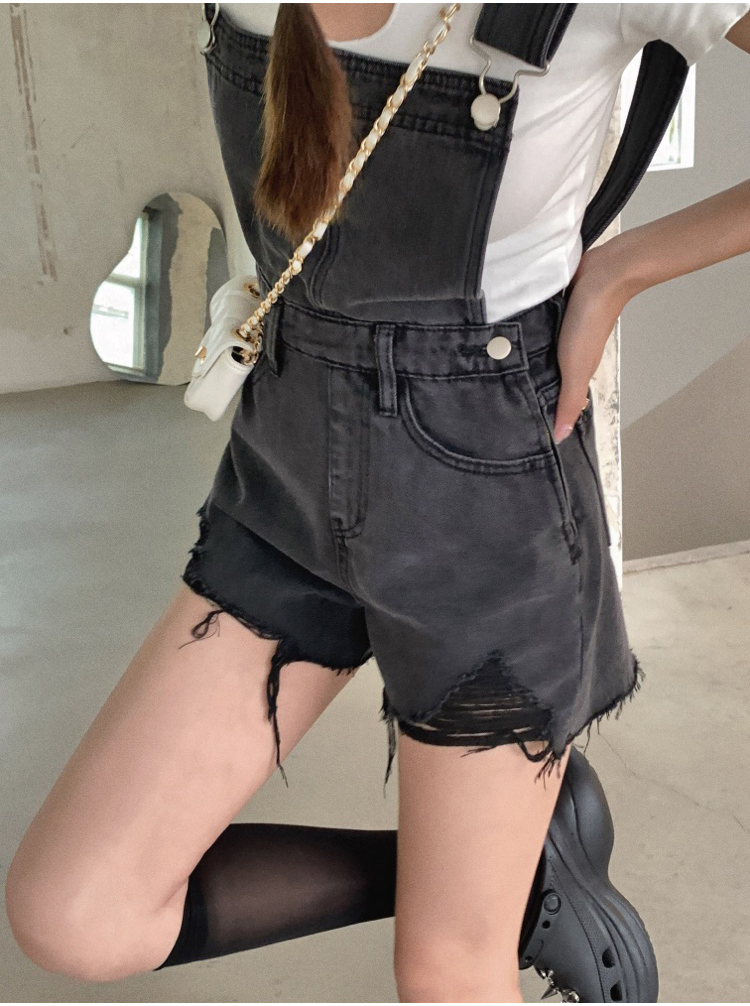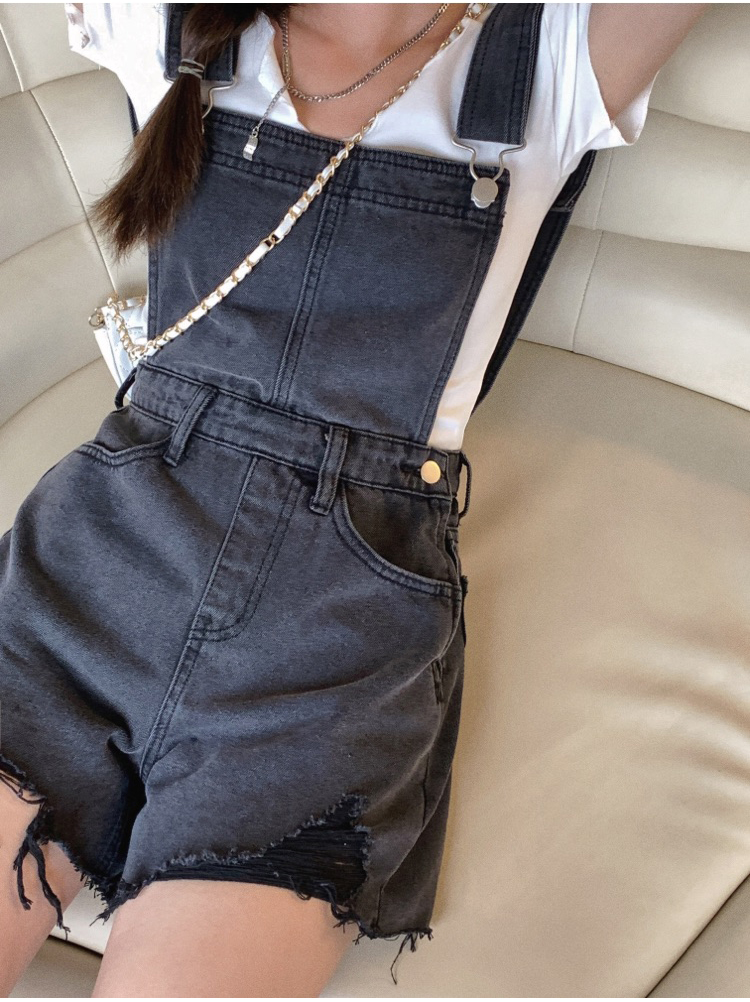 实拍 牛仔背带裤女韩版宽松短裤2021新潮显瘦直筒高腰磨破裤子夏