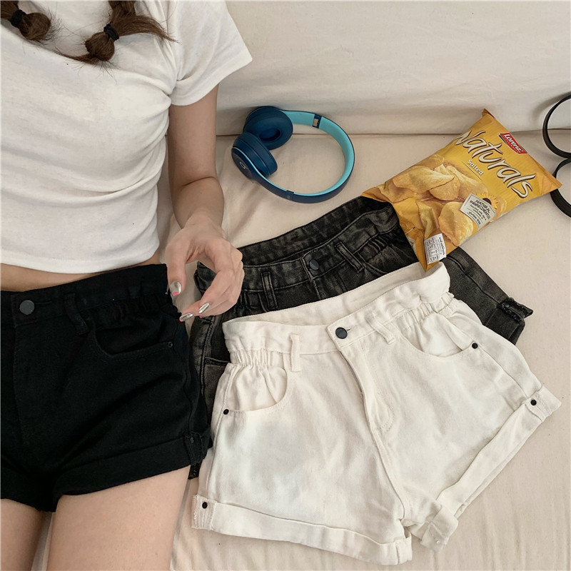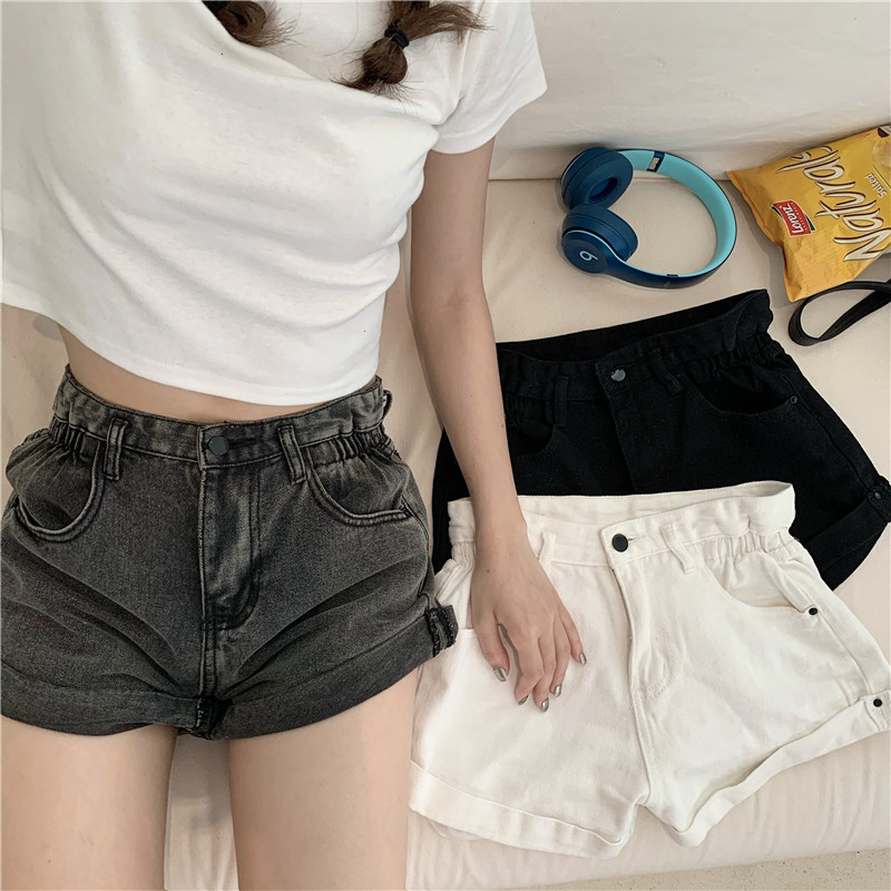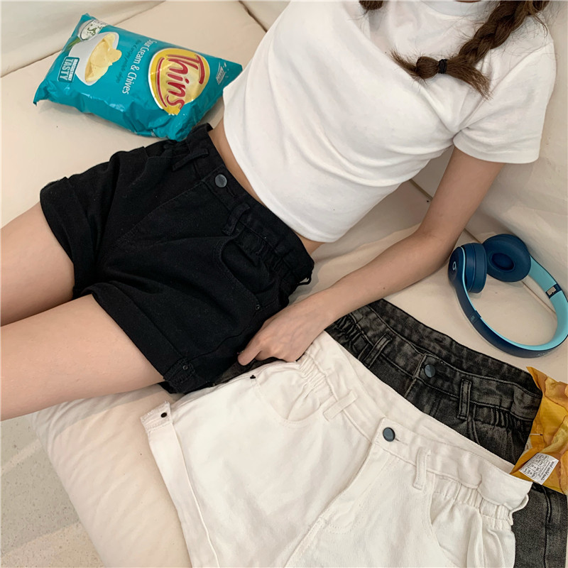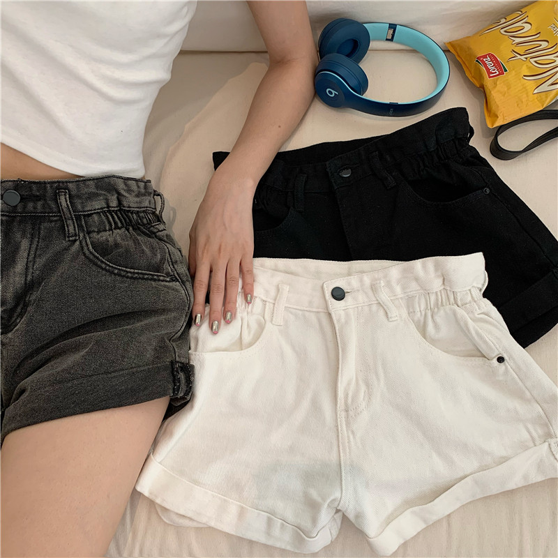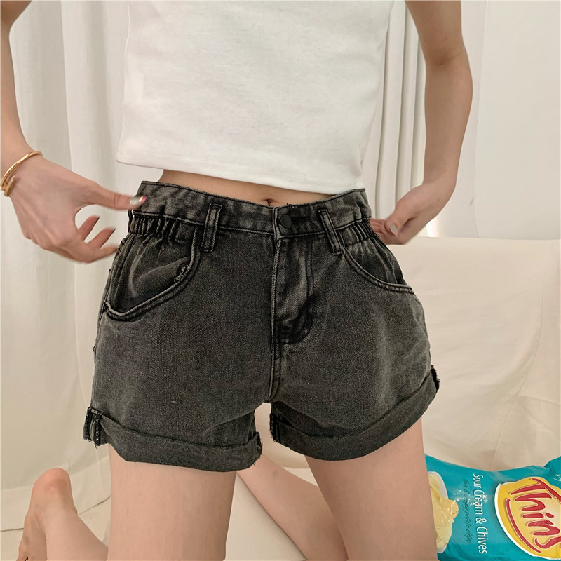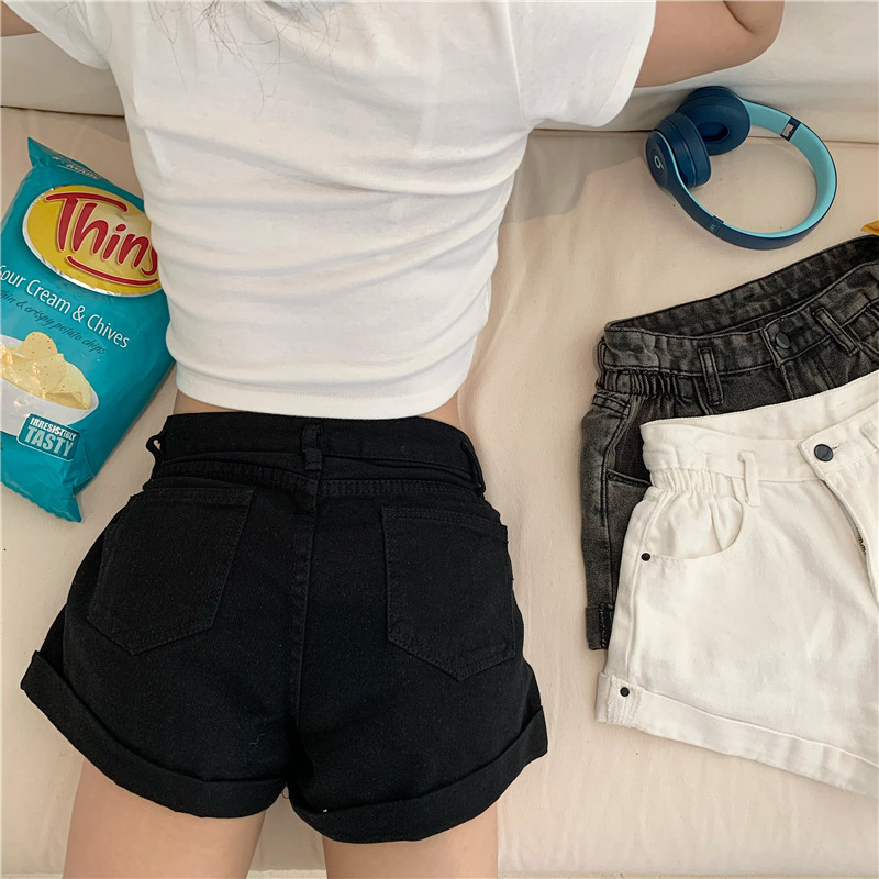 现货实拍实价 黑色牛仔短裤女夏高腰a字韩版宽松卷边学生超短裤热