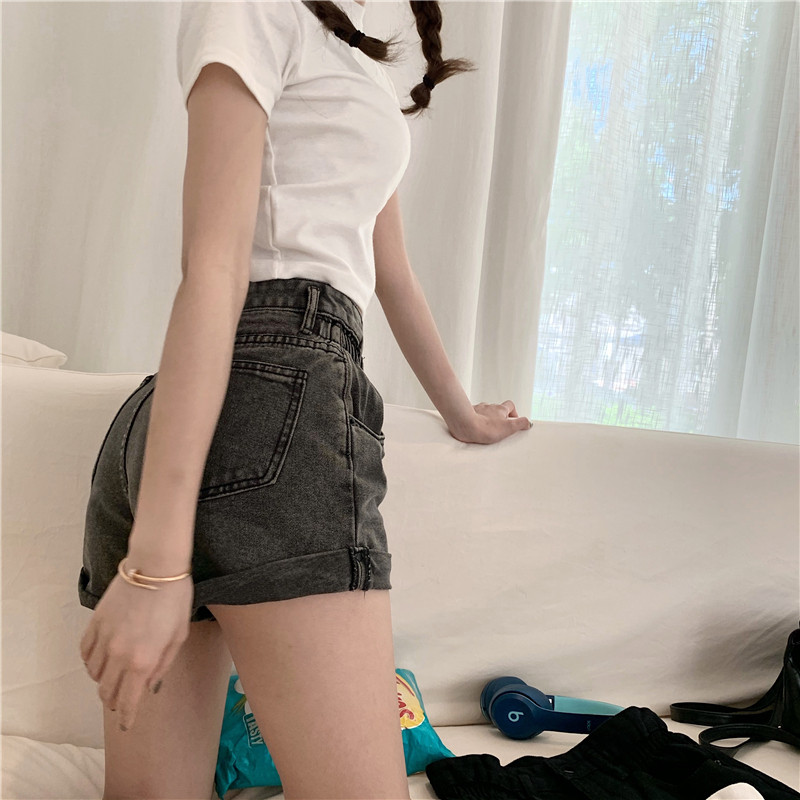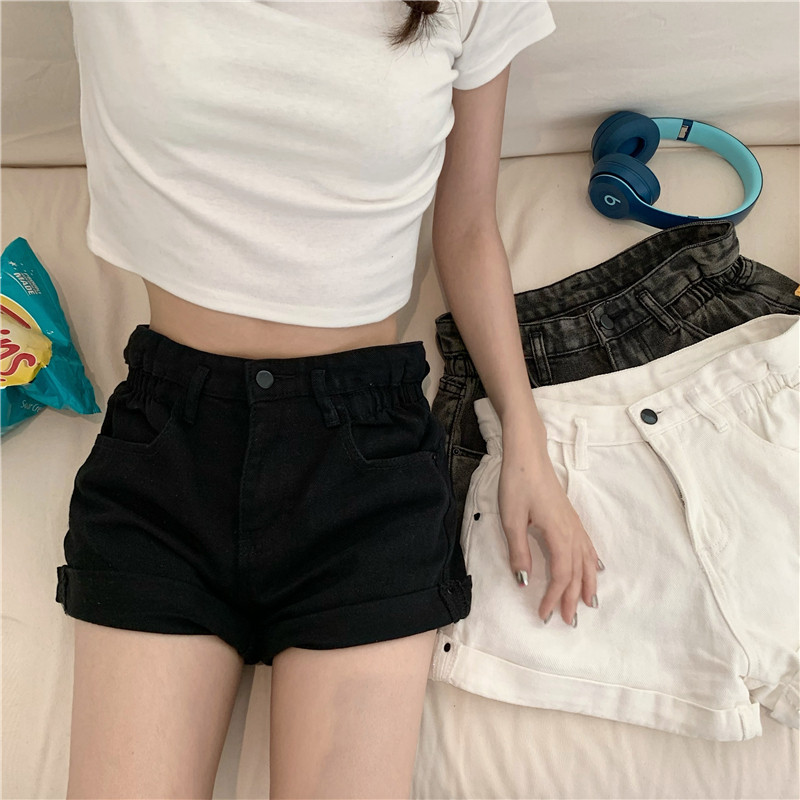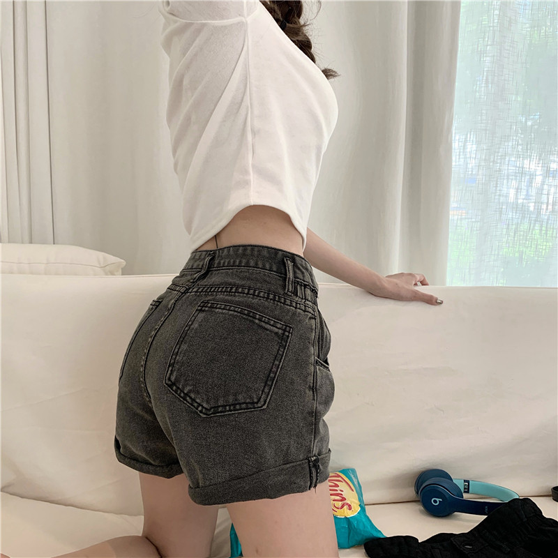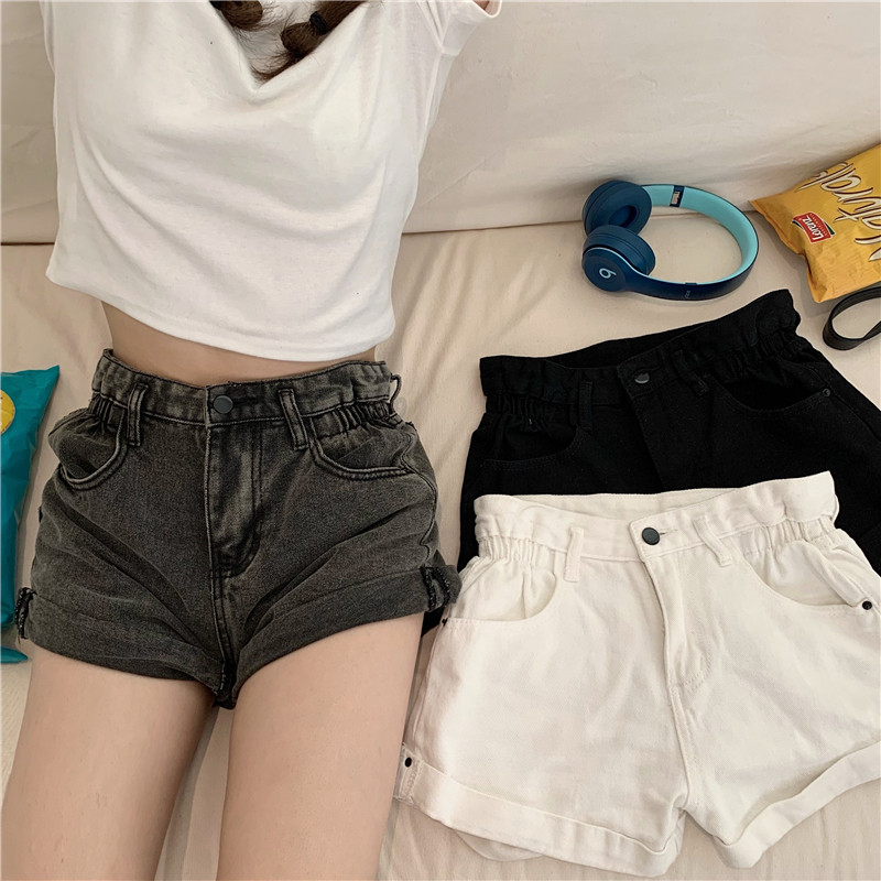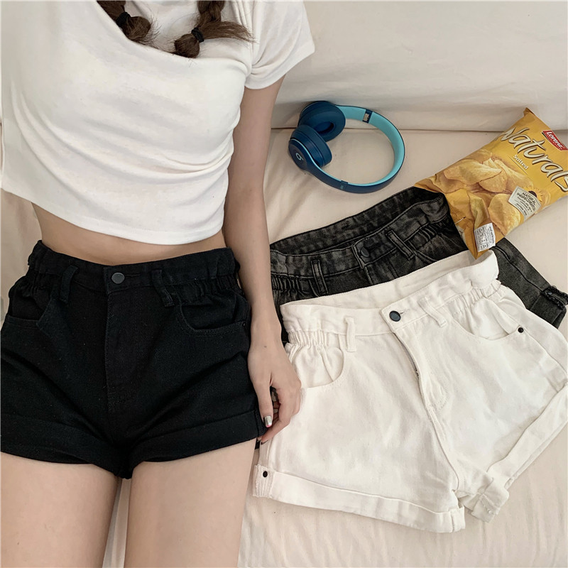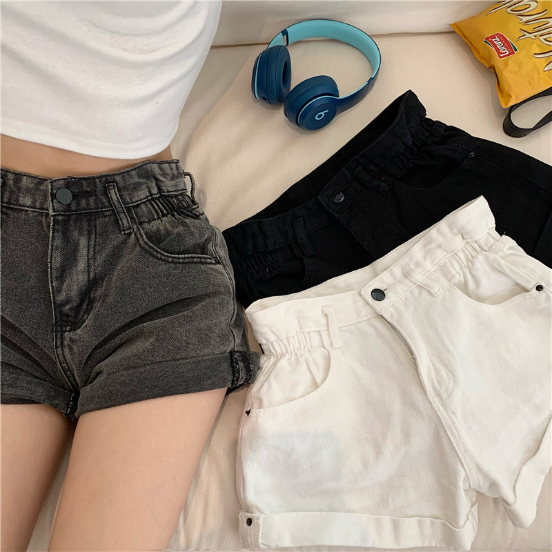 现货实拍实价 黑色牛仔短裤女夏高腰a字韩版宽松卷边学生超短裤热