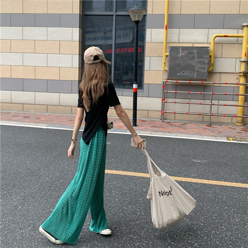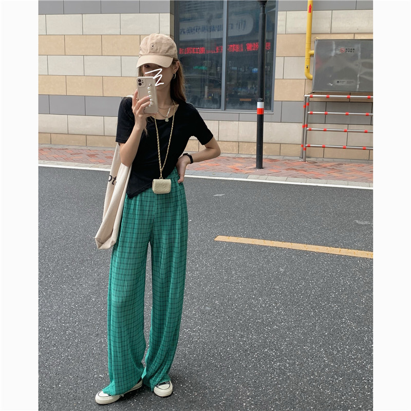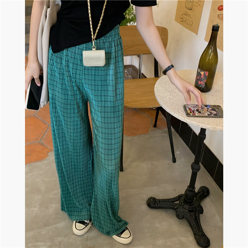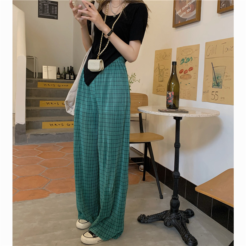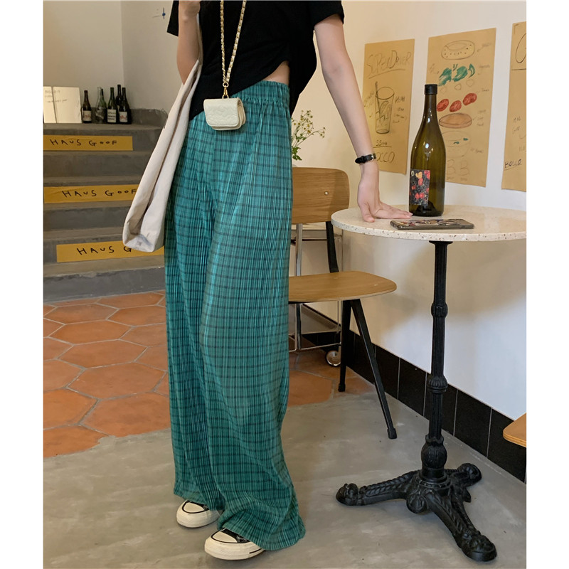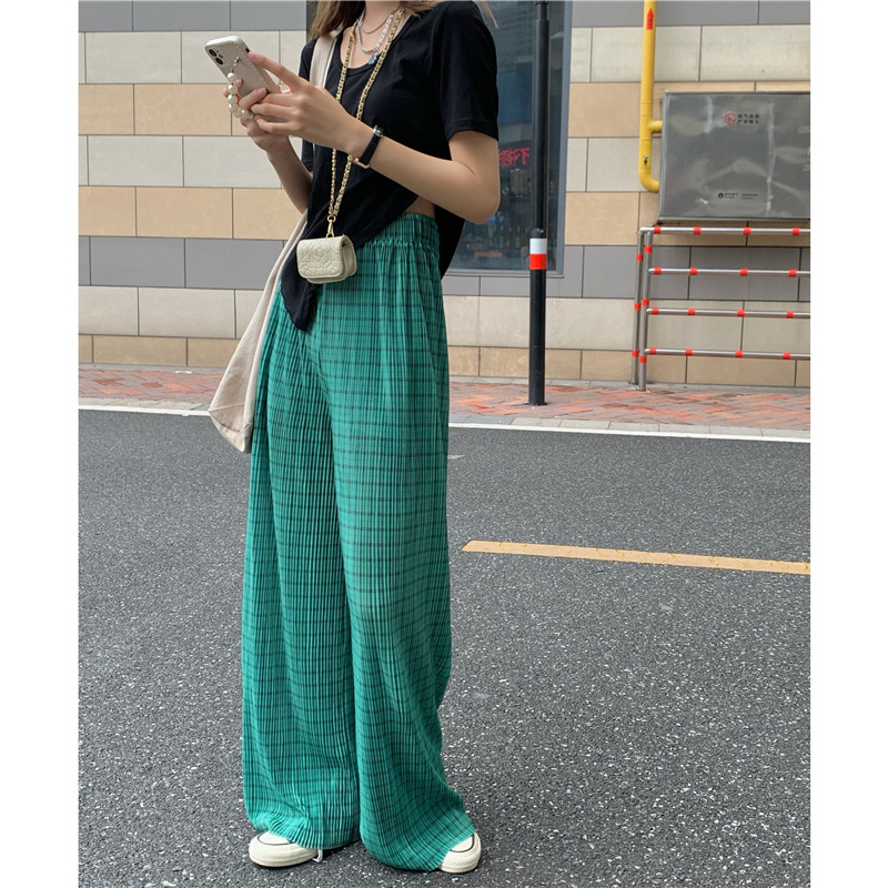 实拍实价绿色格子阔腿裤女高腰宽松直筒压褶休闲拖地裤