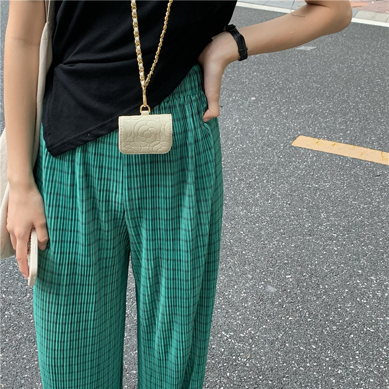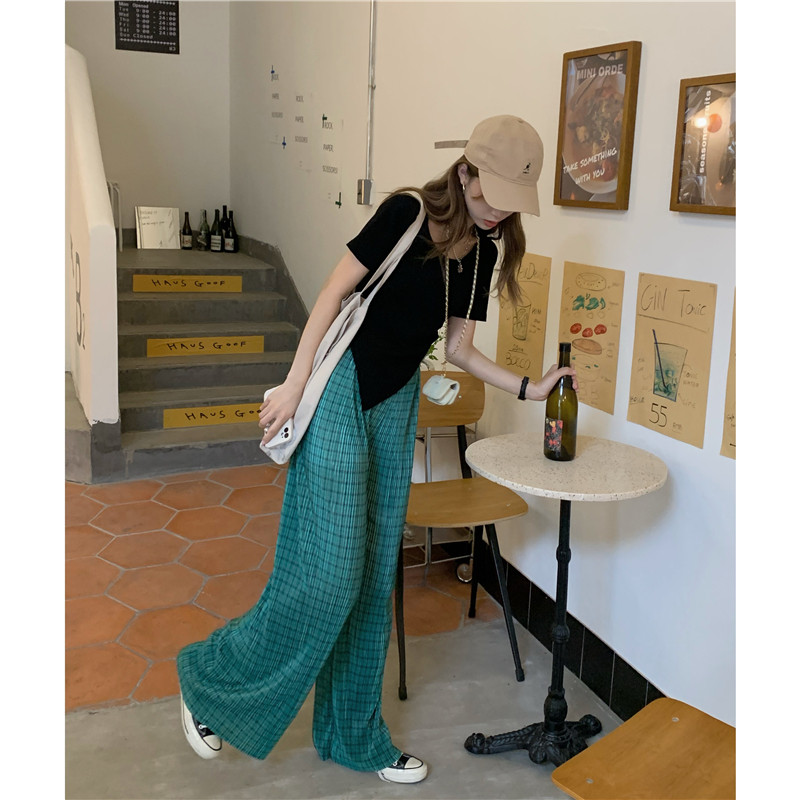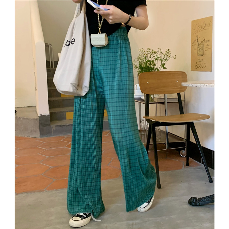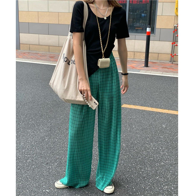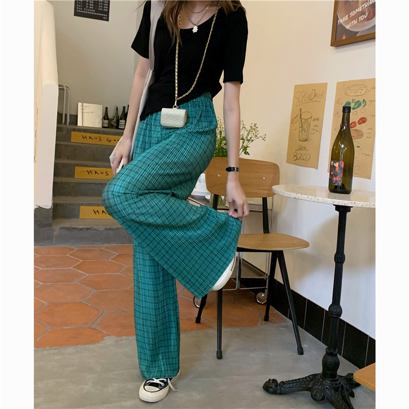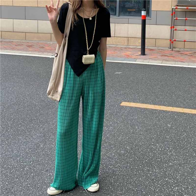 实拍实价绿色格子阔腿裤女高腰宽松直筒压褶休闲拖地裤