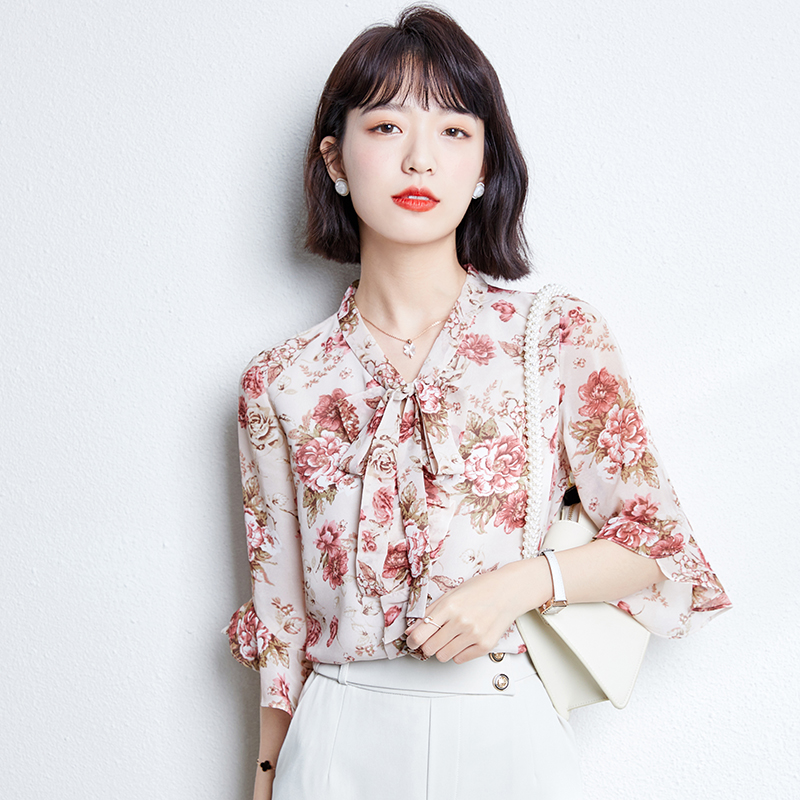 实拍2021夏装新款V领飘带小衫时尚花色五分袖套头印花上衣女