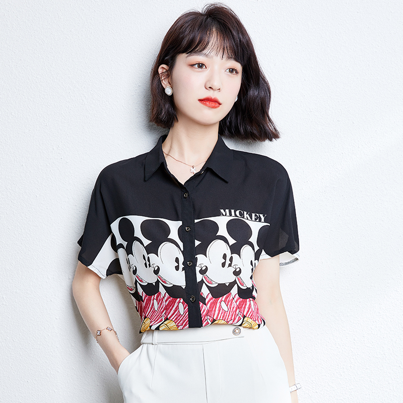 实拍时尚复古黑白拼接欧洲站印花雪纺衫韩版开衫百搭衬衣小衫