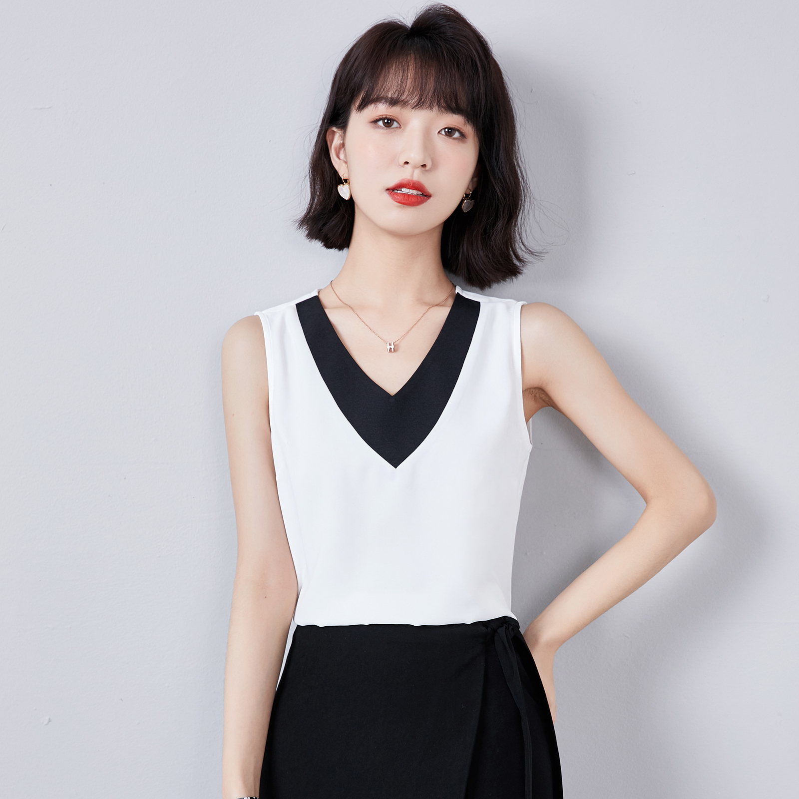 实拍大V领黑白拼色吊带背心女2021夏装新款外穿气质无袖雪纺衫