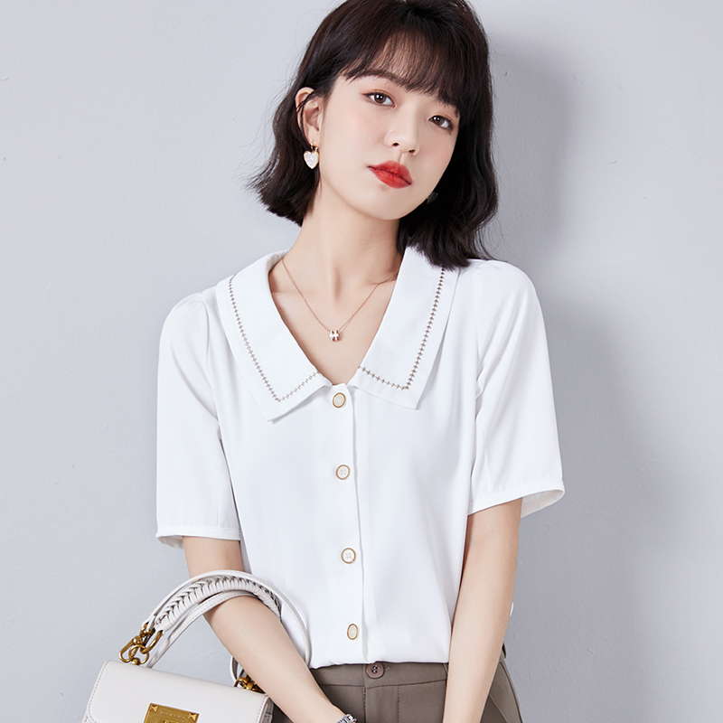 实拍雪纺衬衫女士短袖2021年夏季新款港味复古娃娃领白色上衣