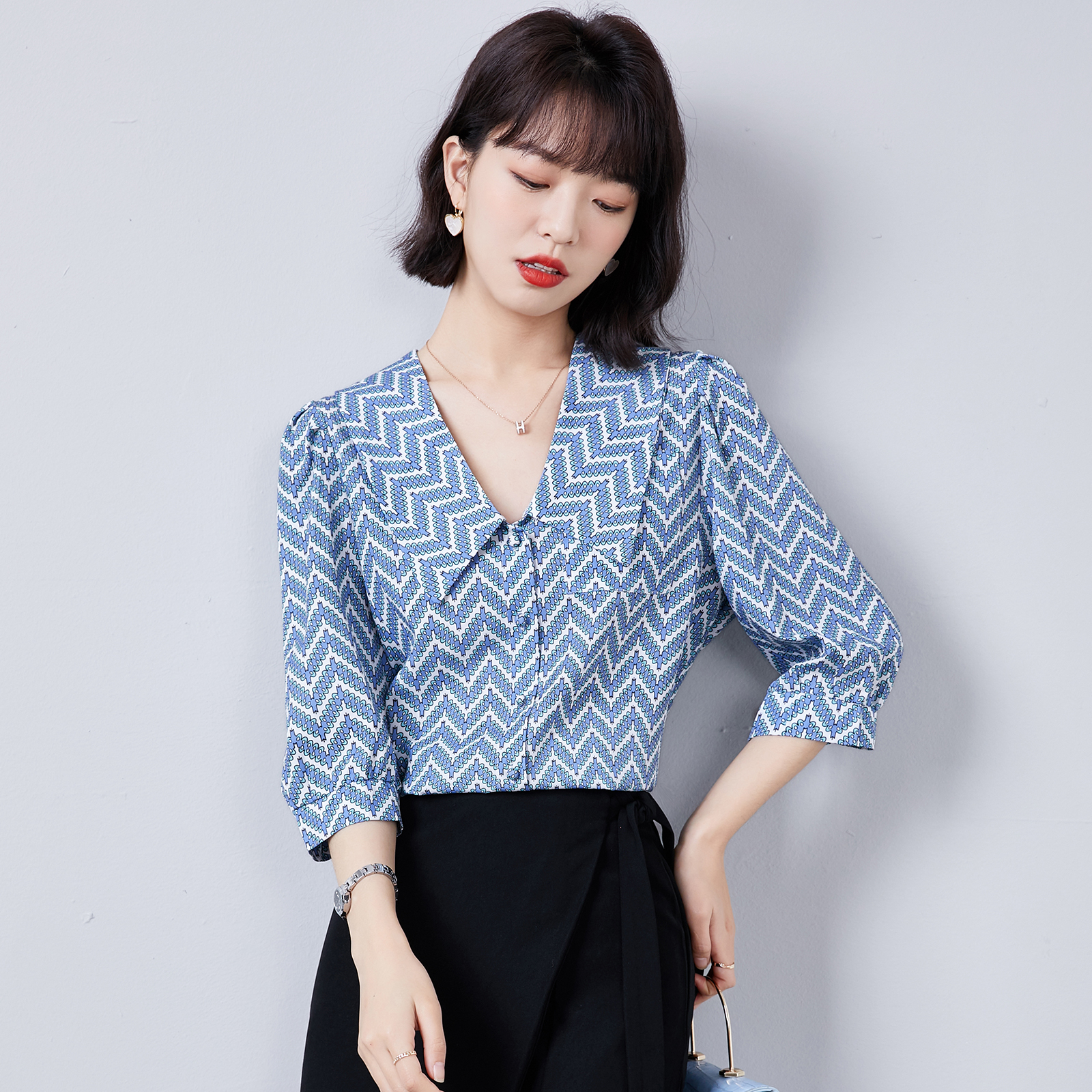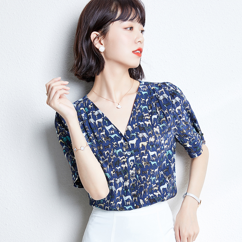 实拍法式复古V领动物印花雪纺衫2021夏装新款小众设计感衬衫
