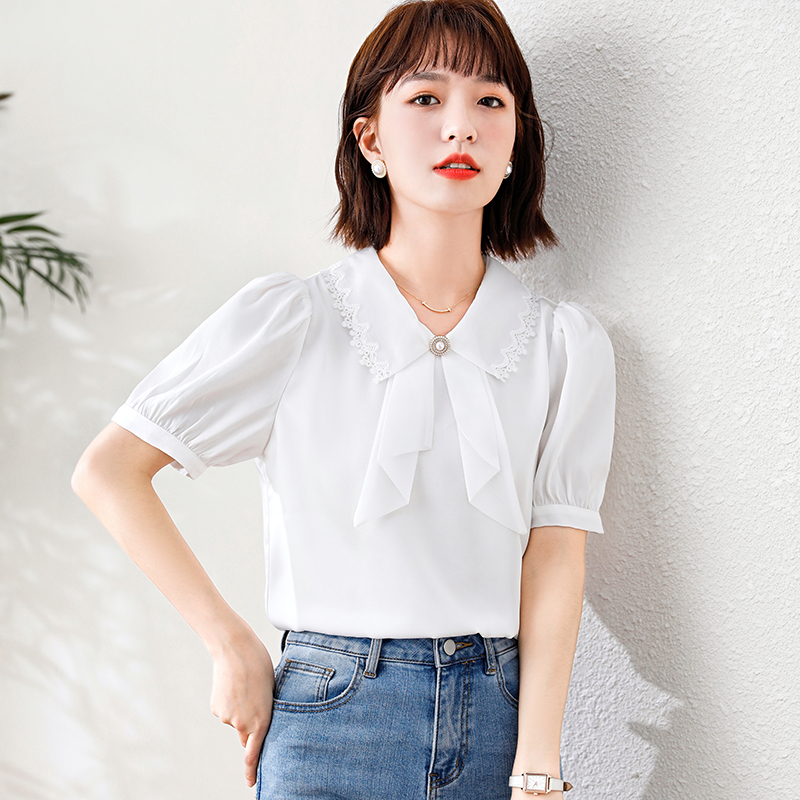 实拍时尚娃娃领雪纺衫女短袖2021夏新款纯色甜美蕾丝拼接衬衫