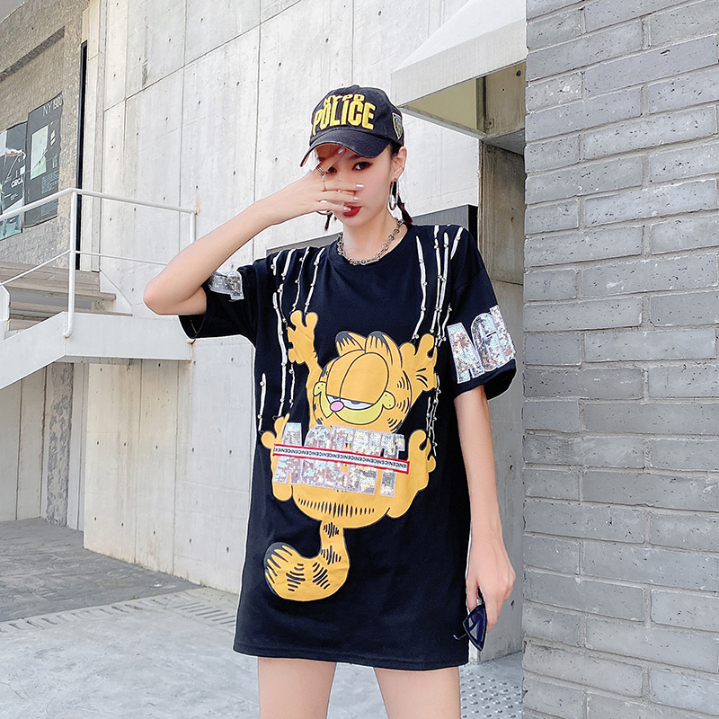 潮牌女装2021夏季新款卡通亮片中长款宽松显瘦大码短袖t恤女