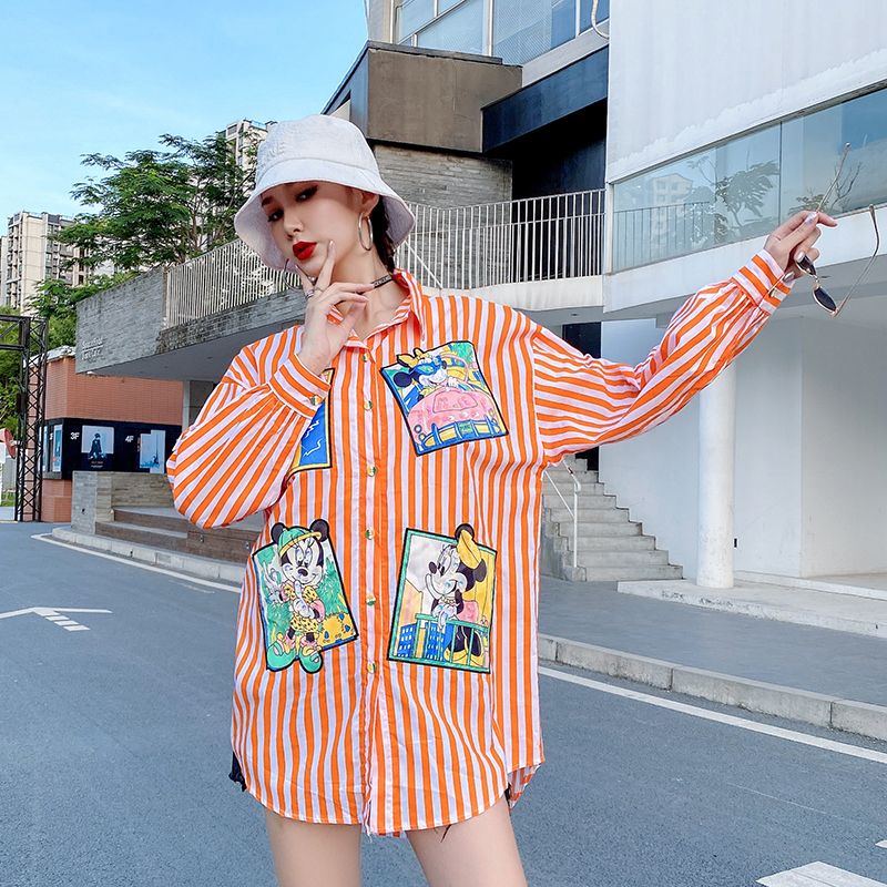 泰国潮牌女装2021春秋款条纹重工亮片宽松时尚中长款长袖衬衫女